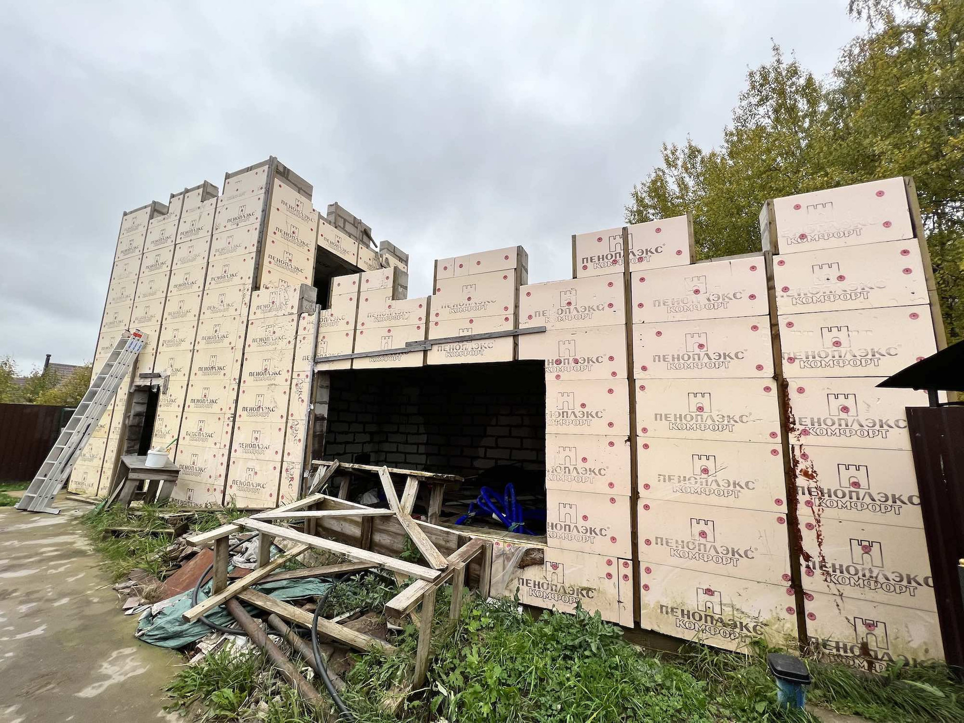 Толстые газобетонные стены 400мм, с утеплителем 500мм. и декоративной облицовкой из керамической плитки.
