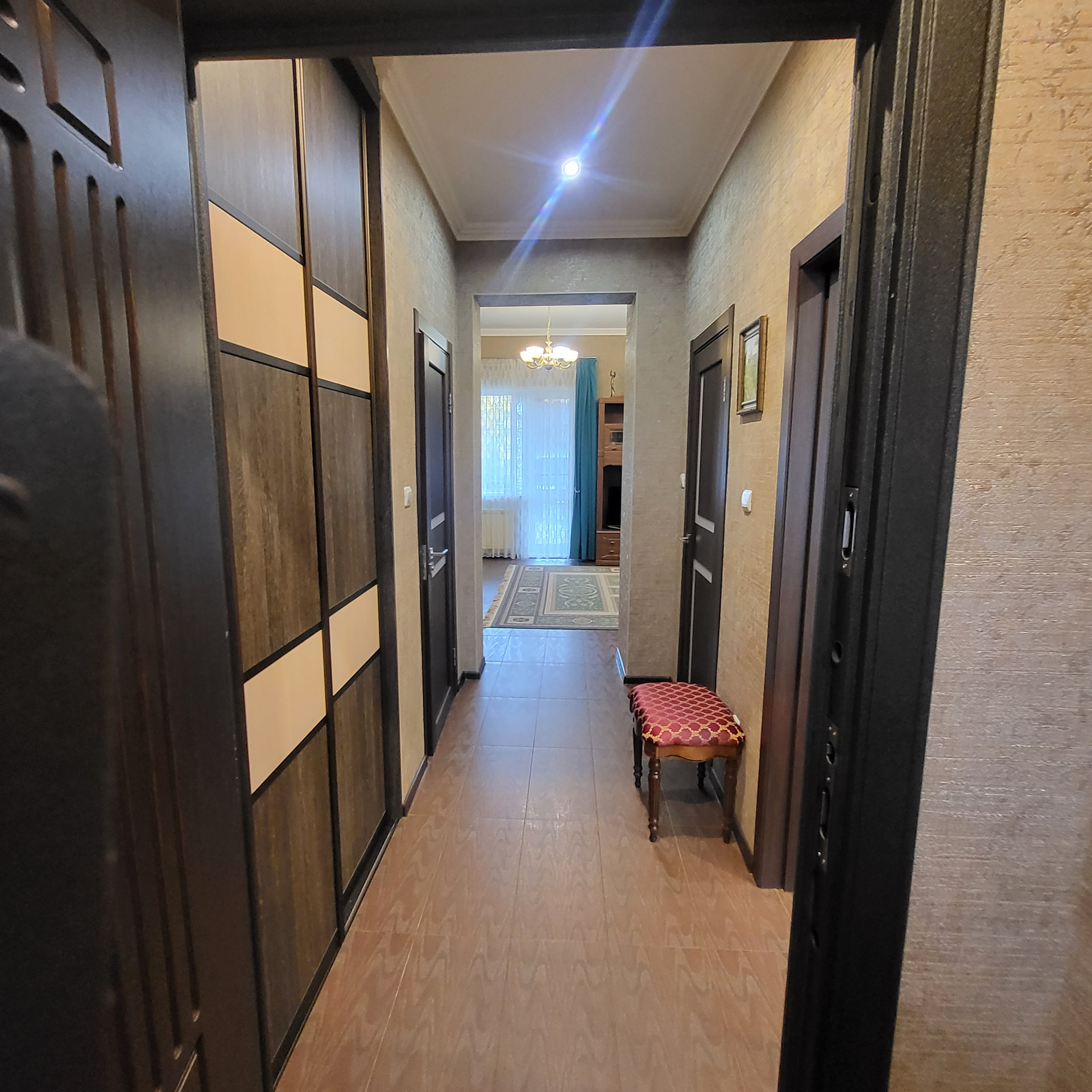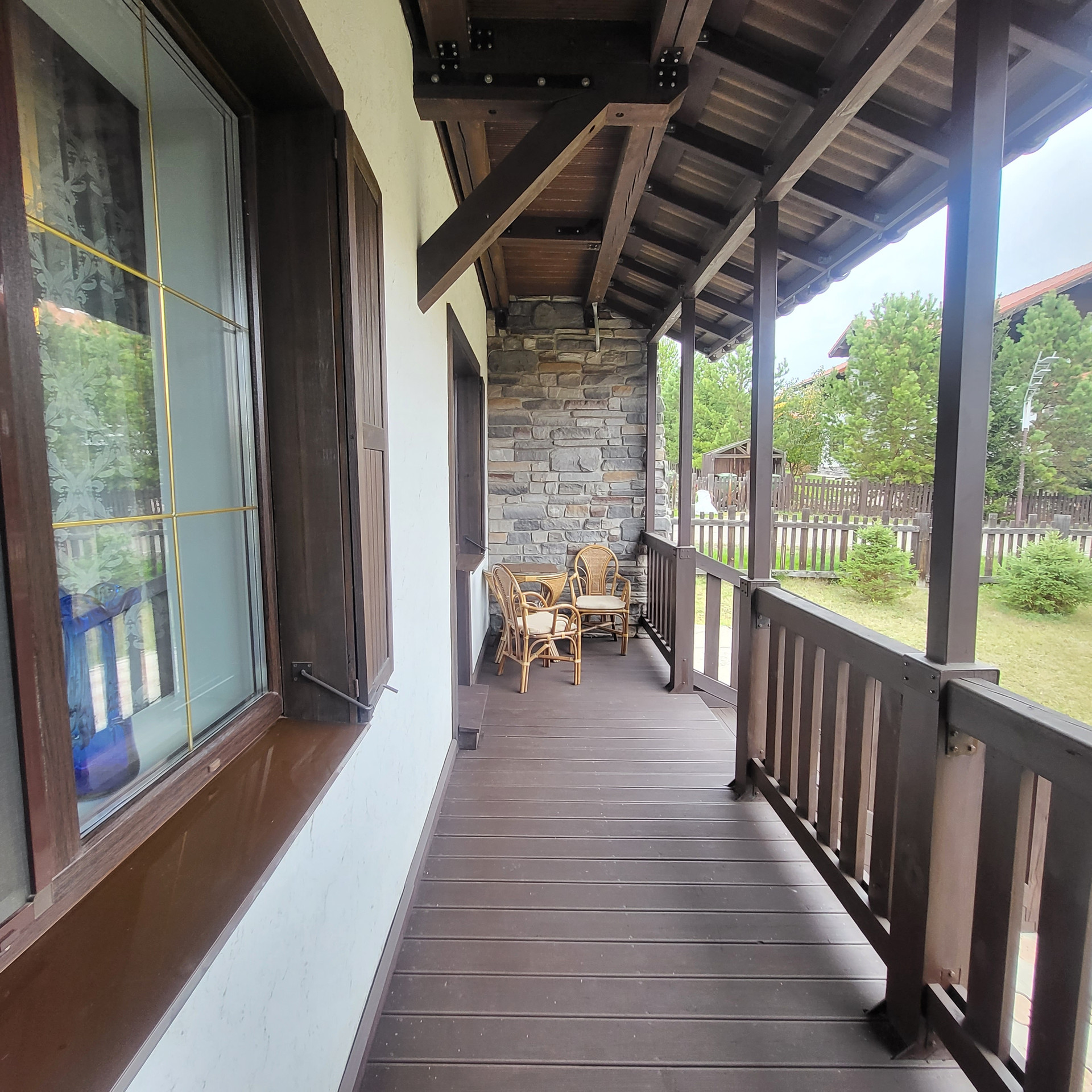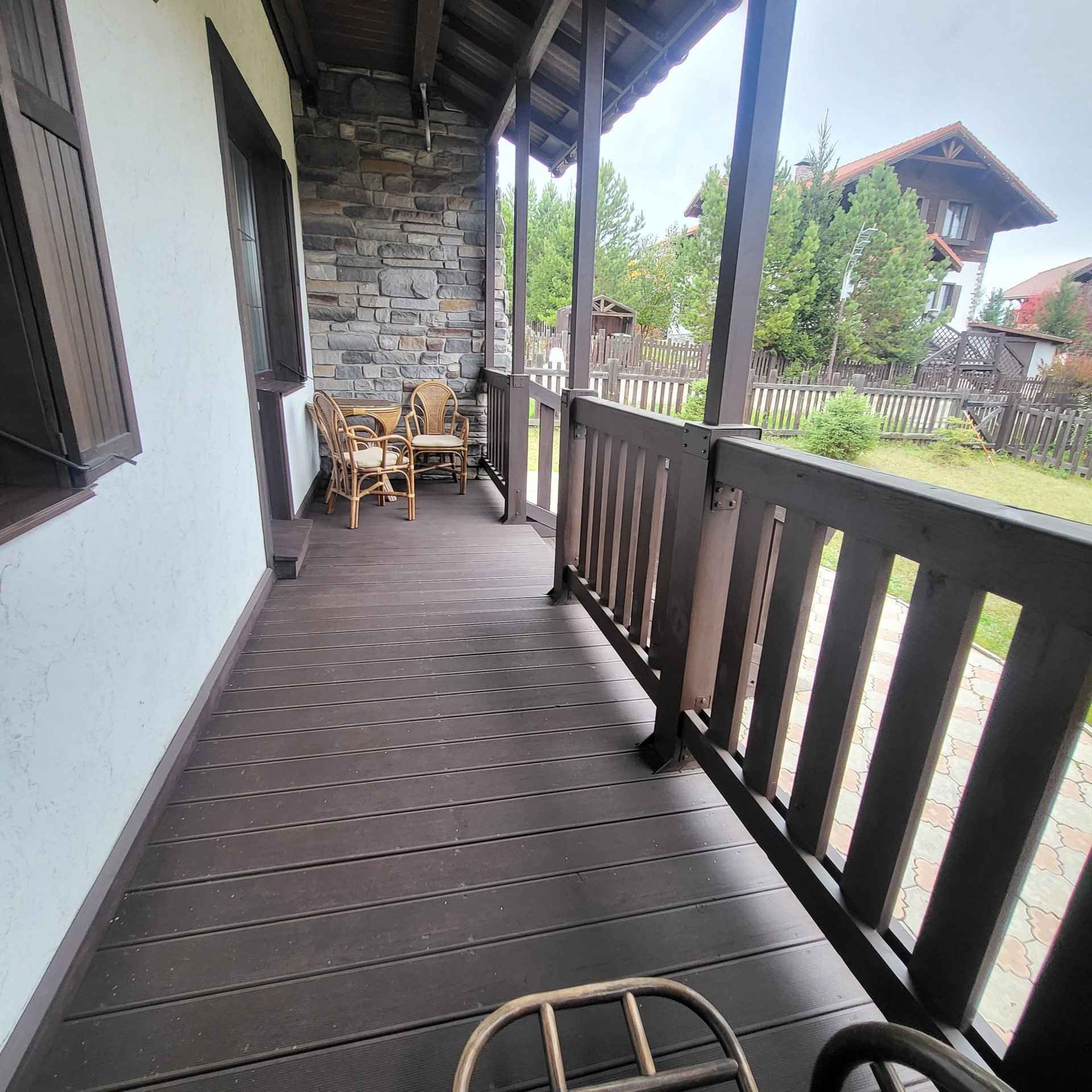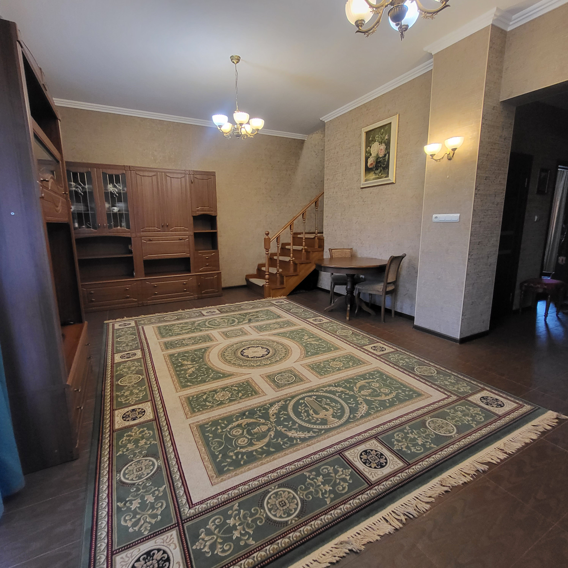 4 комнаты, отдельная кухня , 2 санузла, кладовая, гардероб, потолки 3м , на полу керамогранит, теплый пол,  есть 3 этаж- мансарда холодная под склад  . Лестница - лиственница( каркас  металлический)