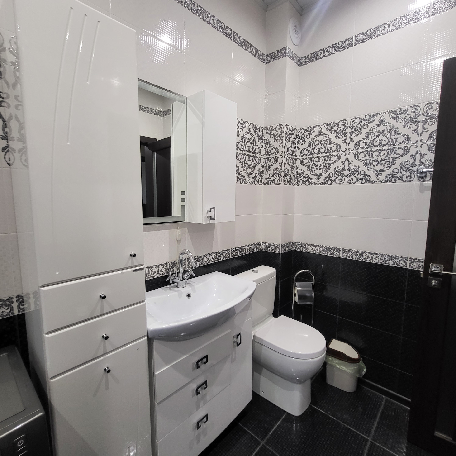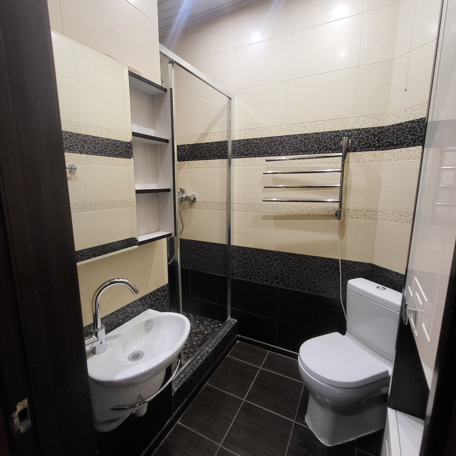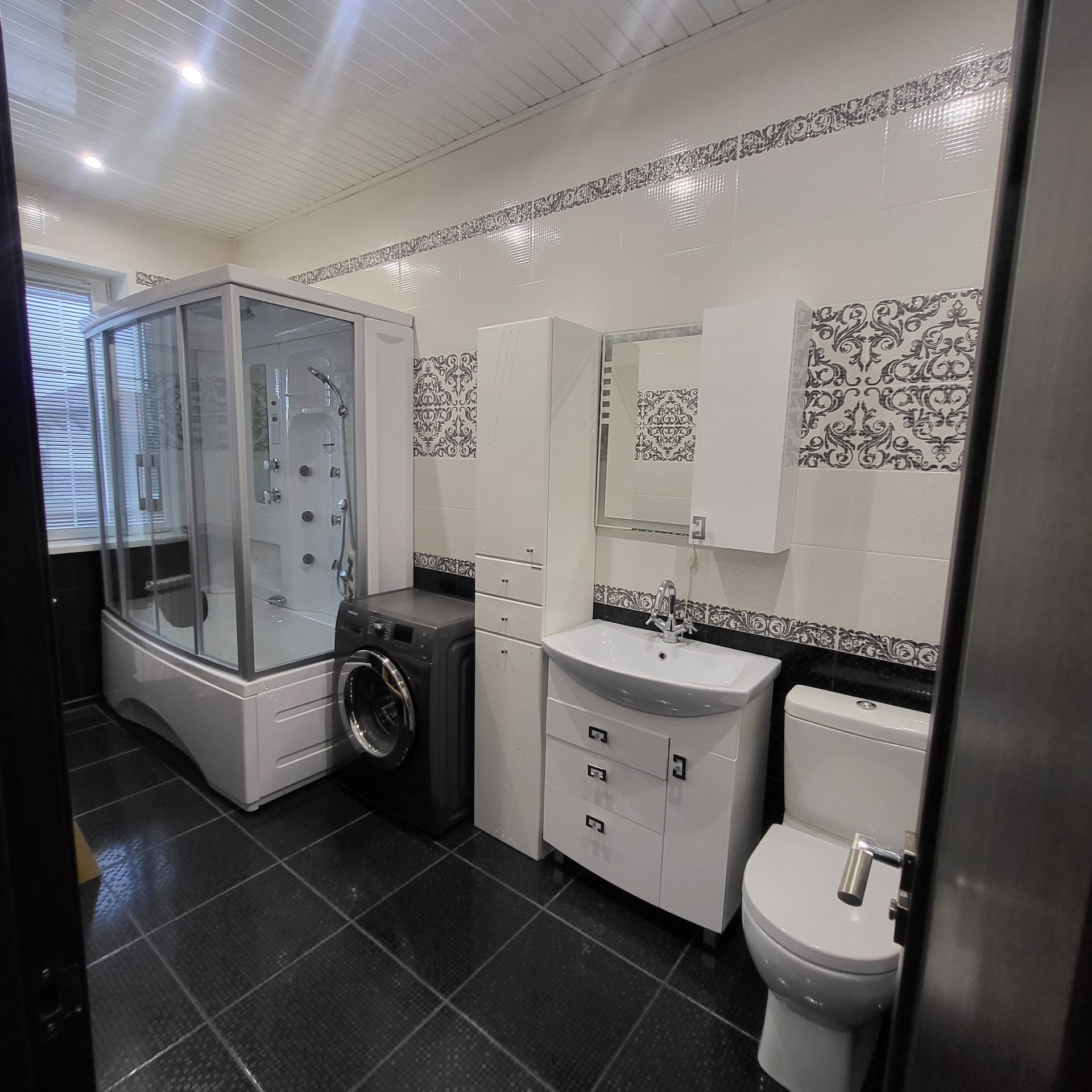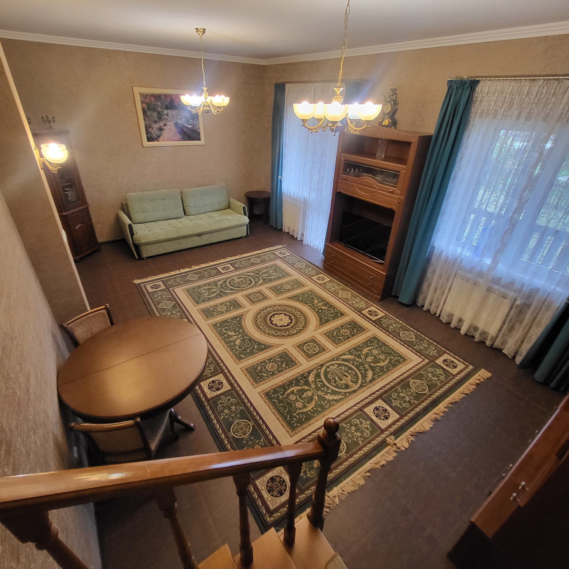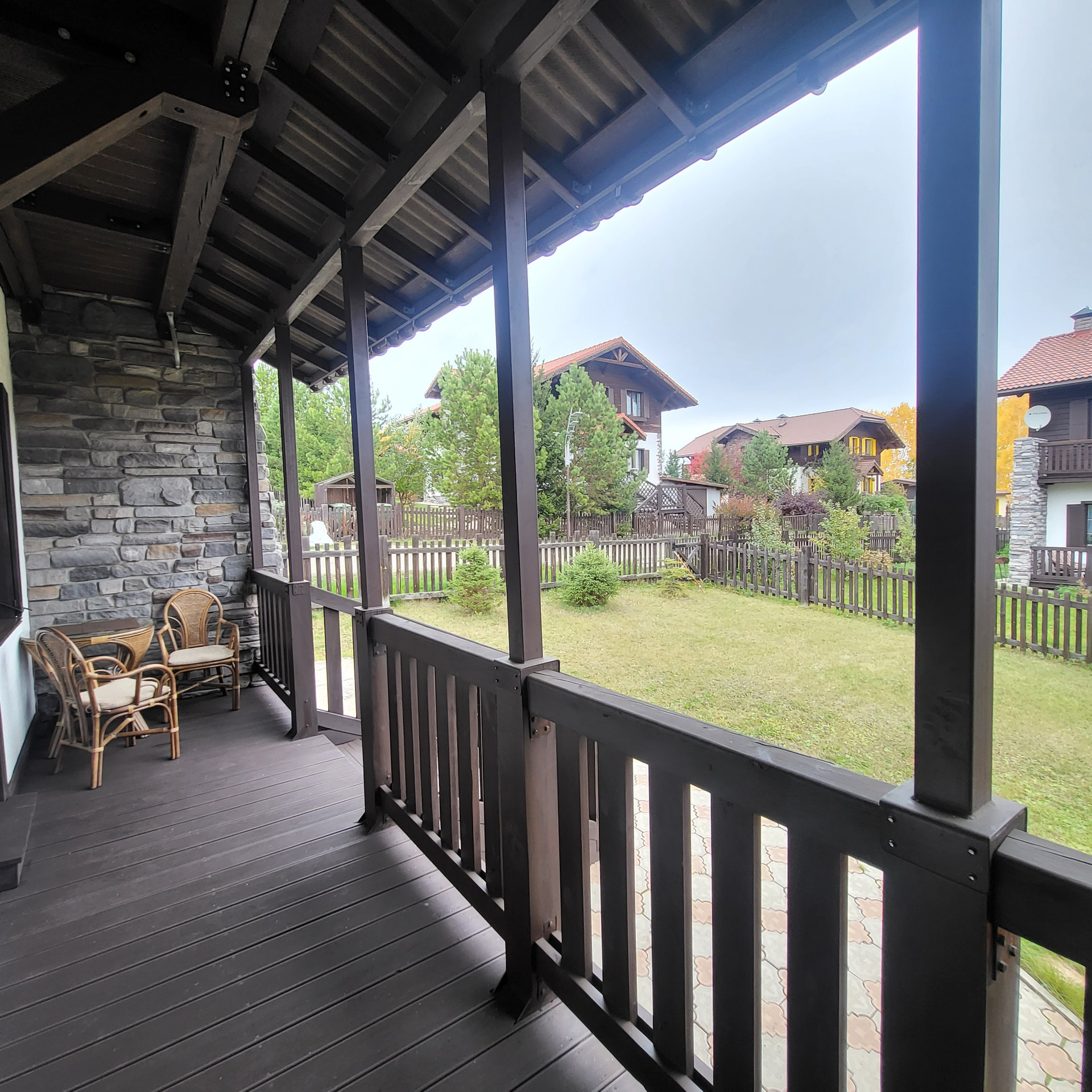 4 комнаты, отдельная кухня , 2 санузла, кладовая, гардероб, потолки 3м , на полу керамогранит, теплый пол,  есть 3 этаж- мансарда холодная под склад  . Лестница - лиственница( каркас  металлический)