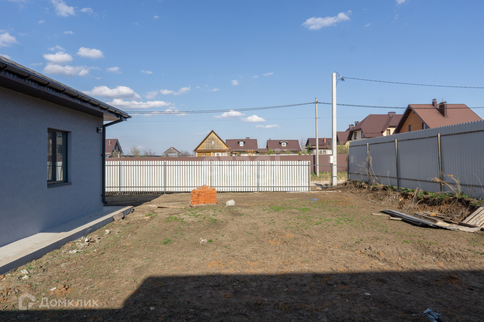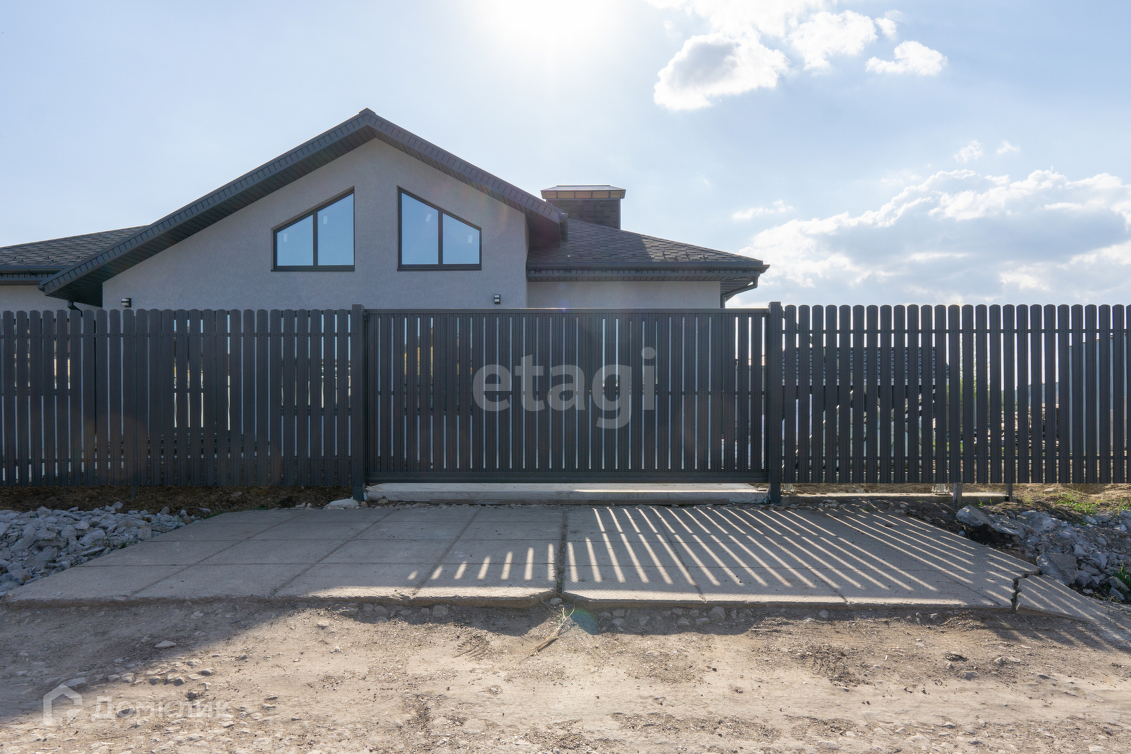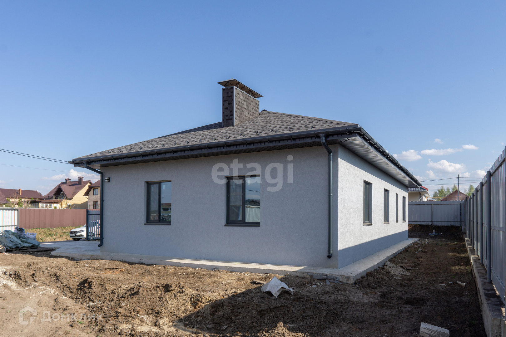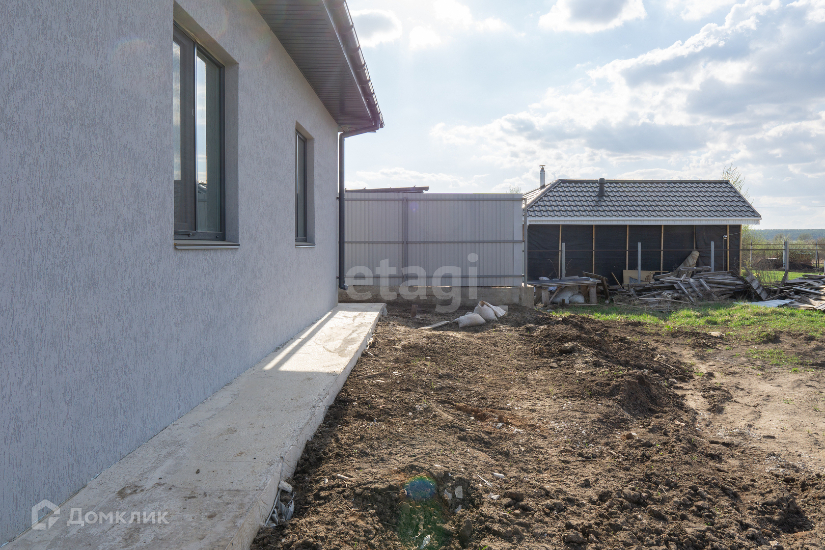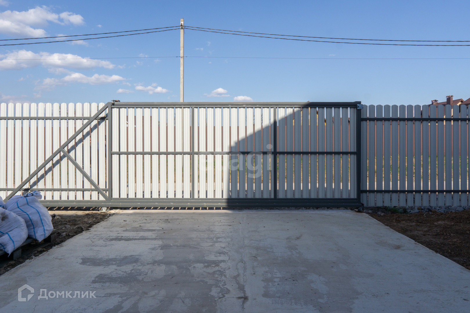 Крыша из мягкой кровли, откатные ворота, отмостка и забетонированное место под машину.