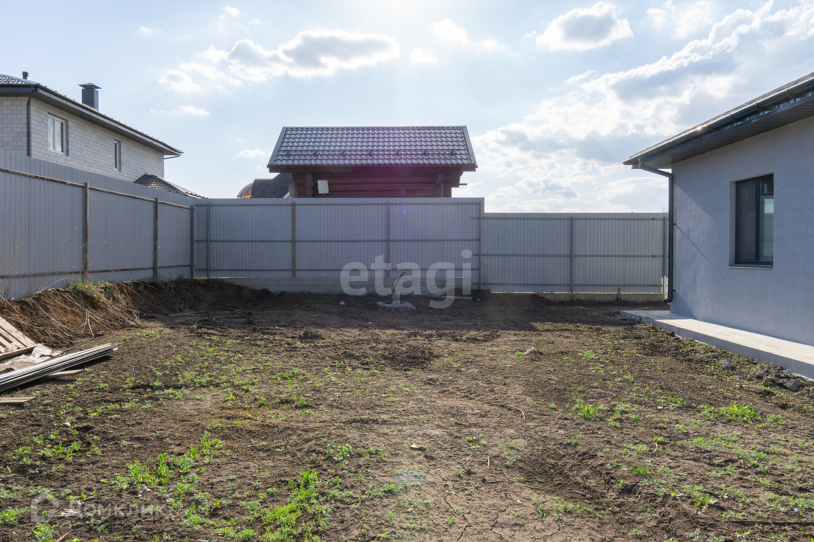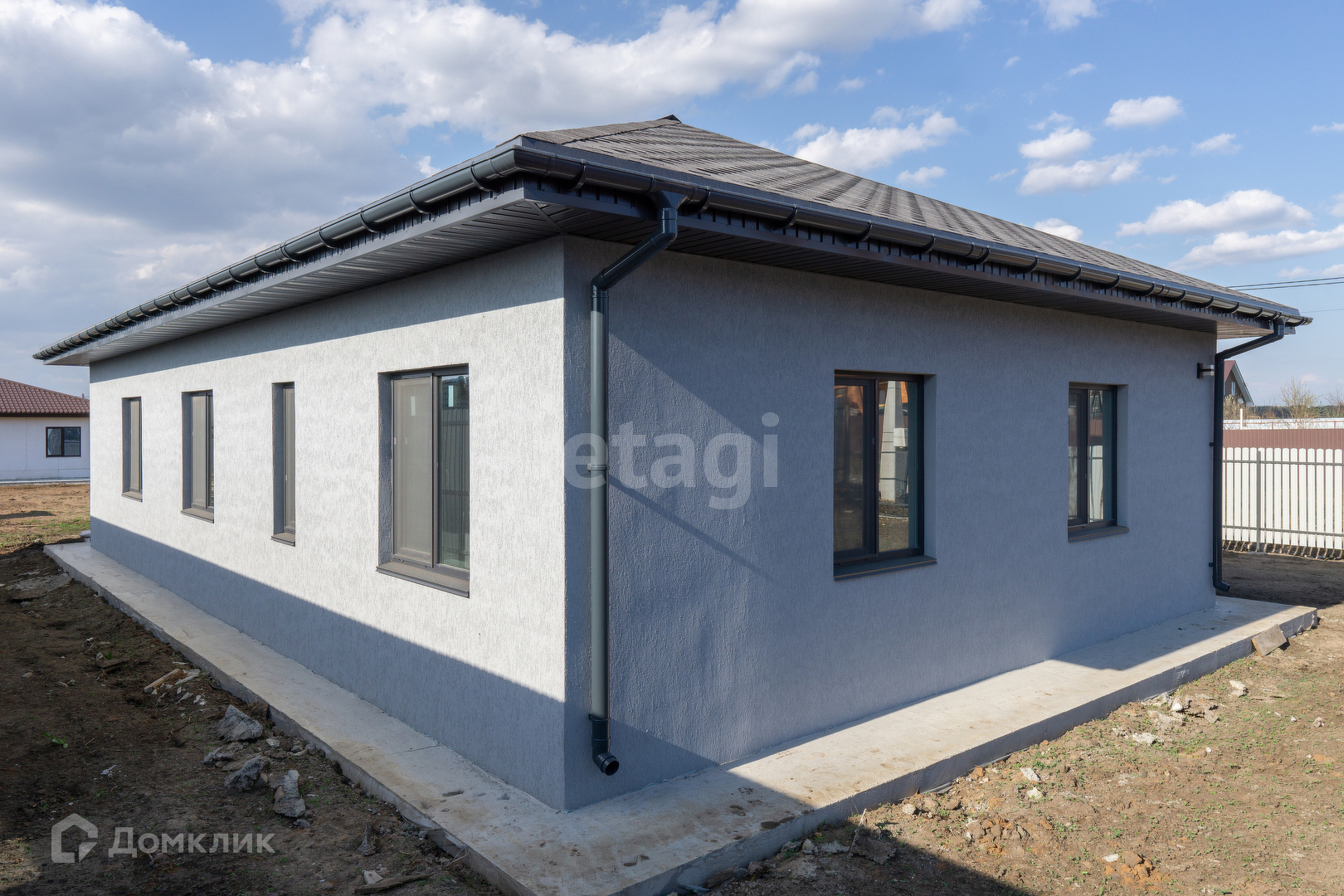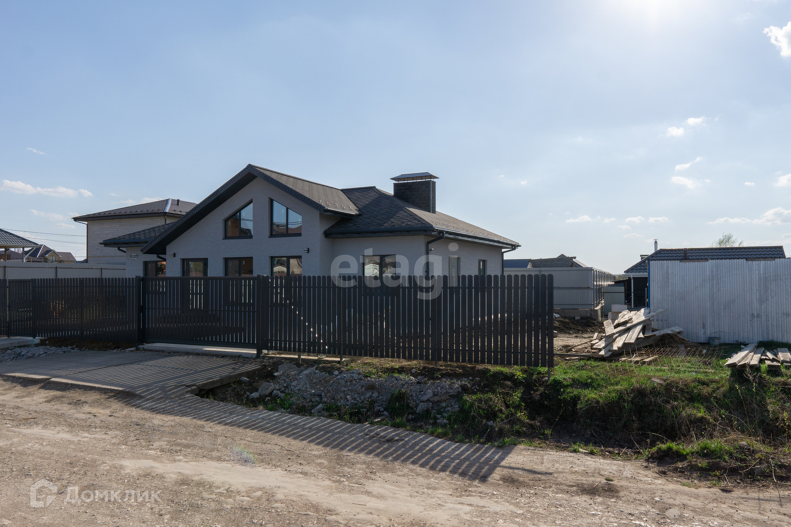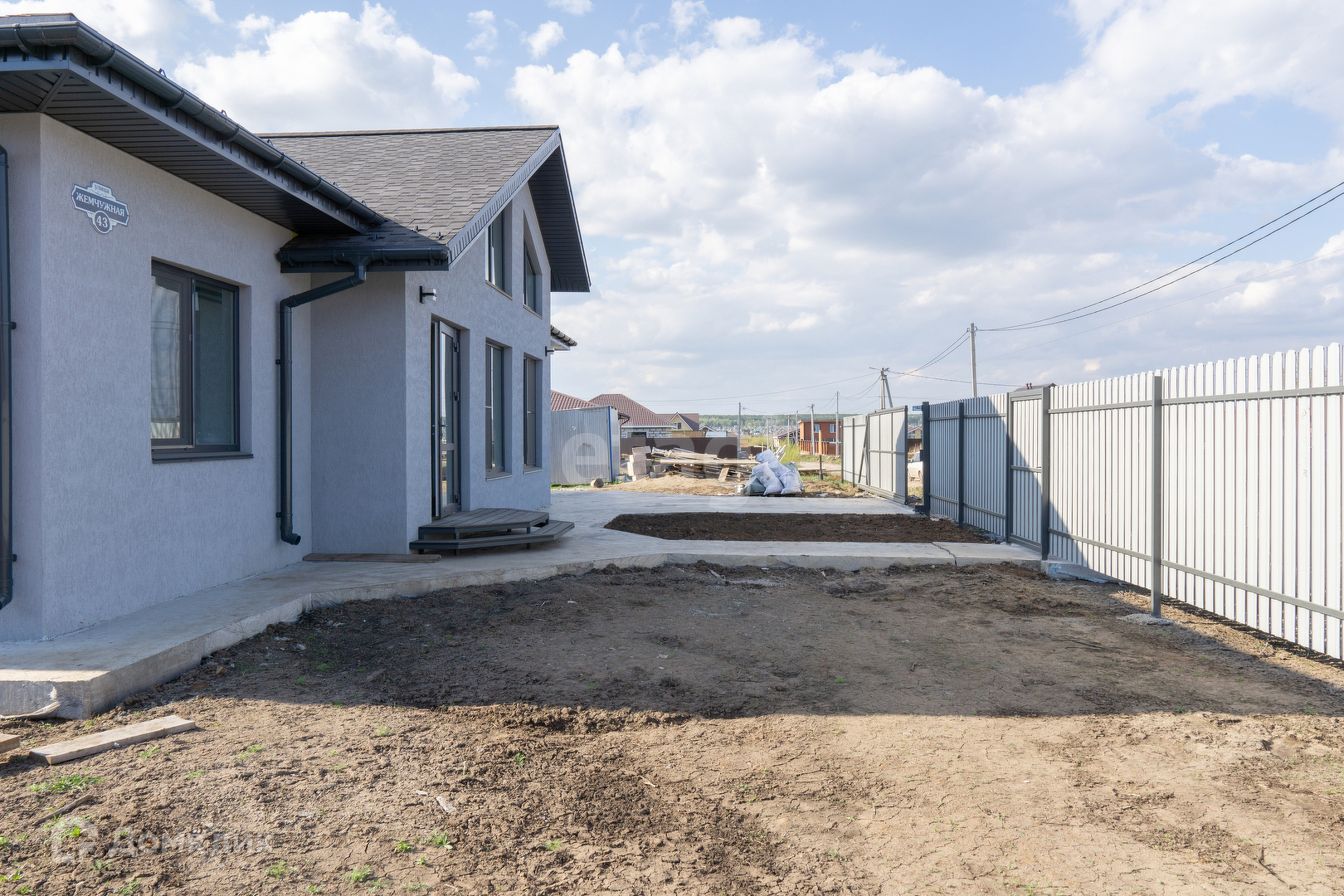 Крыша из мягкой кровли, откатные ворота, отмостка и забетонированное место под машину.