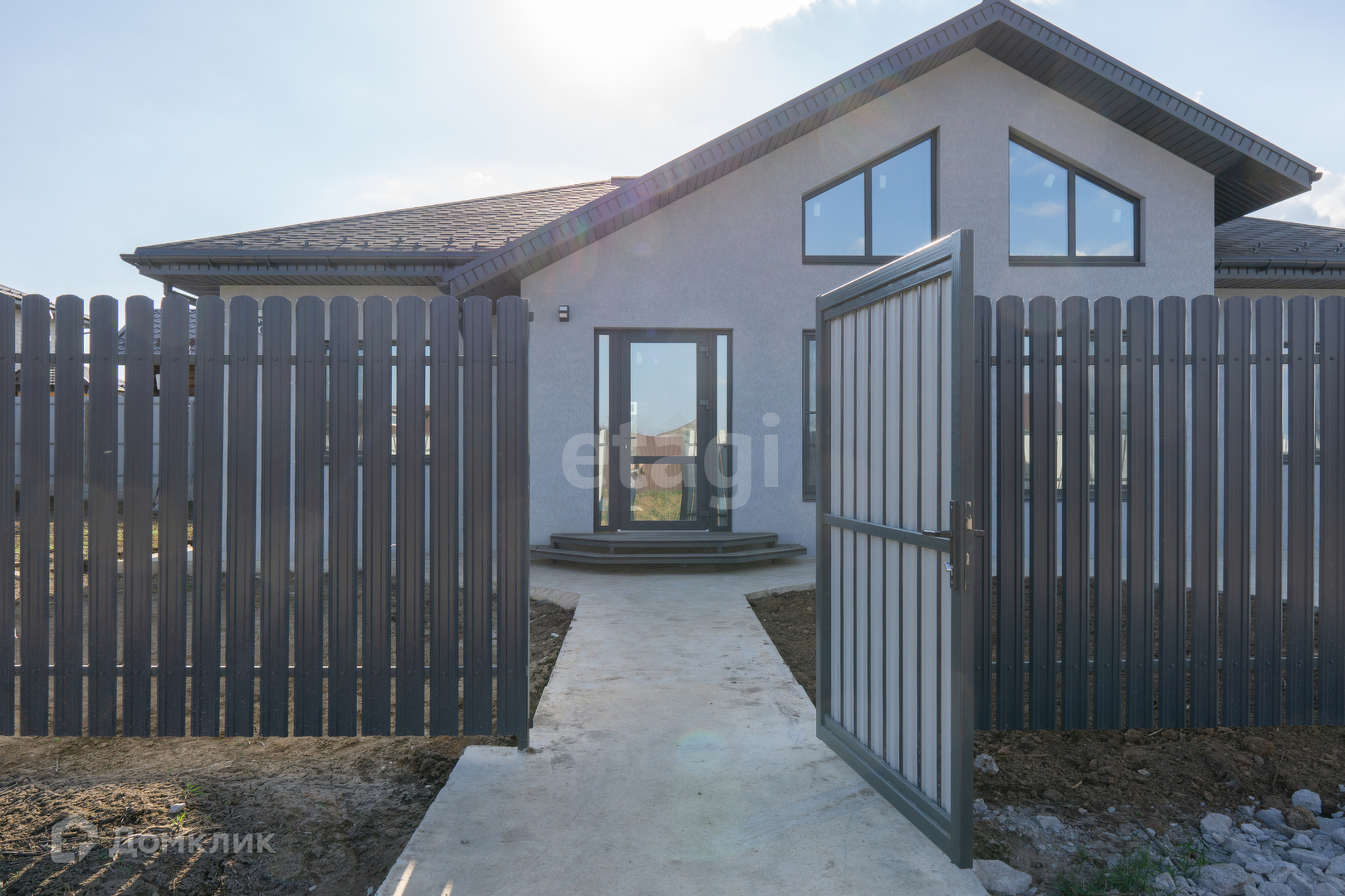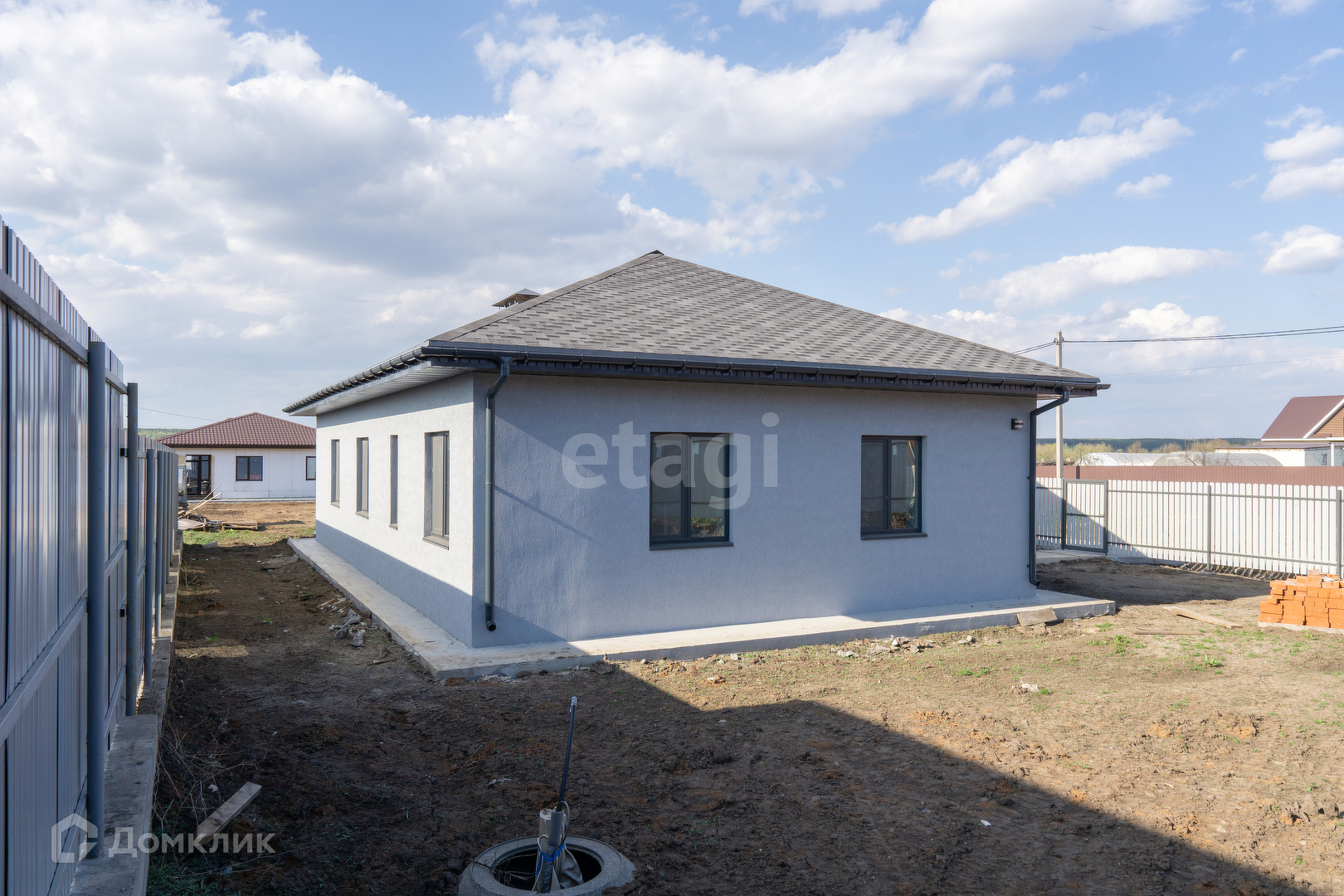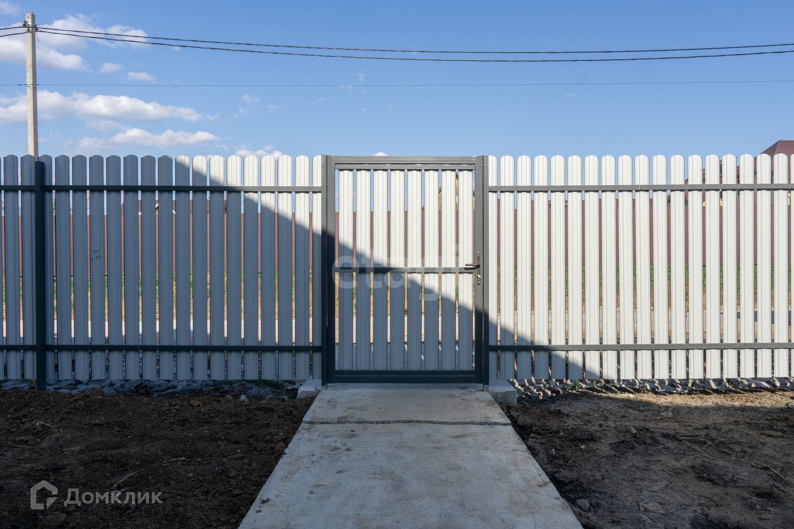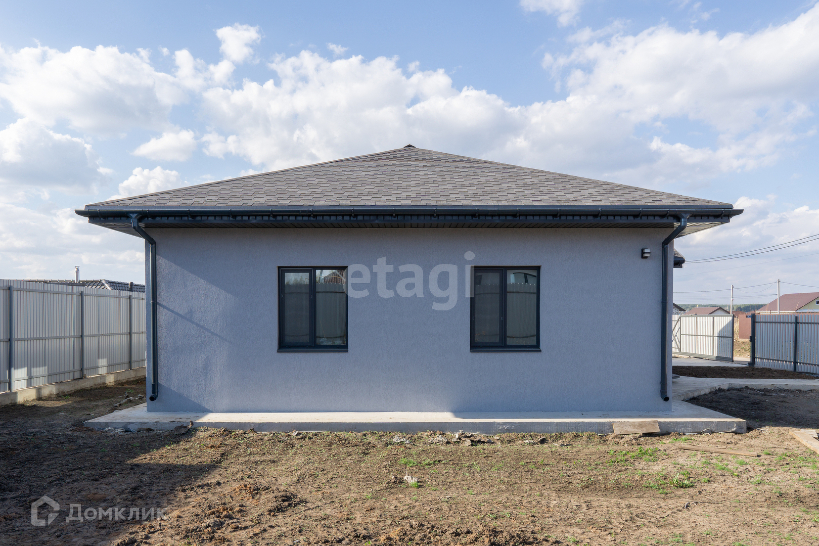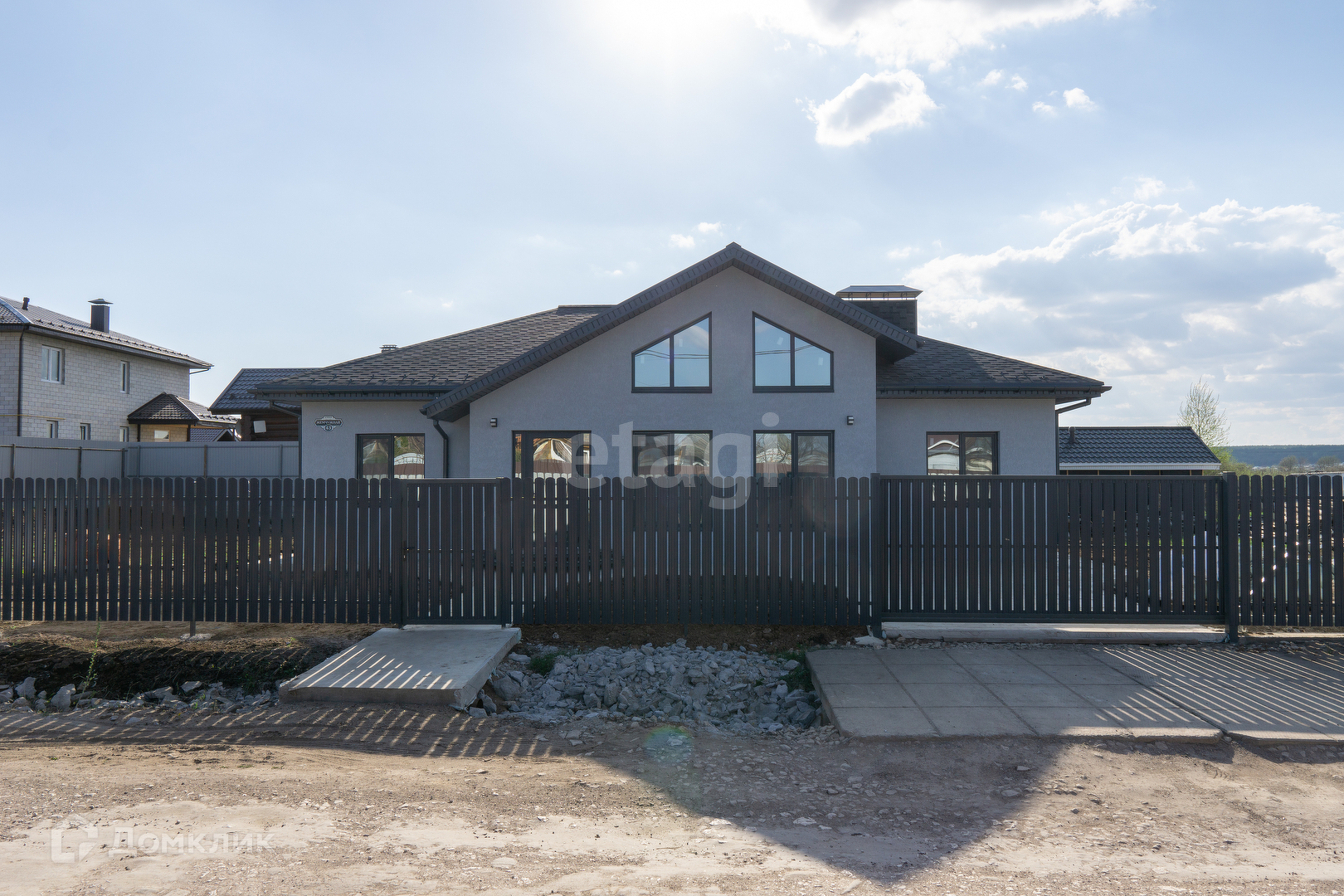 Крыша из мягкой кровли, откатные ворота, отмостка и забетонированное место под машину.