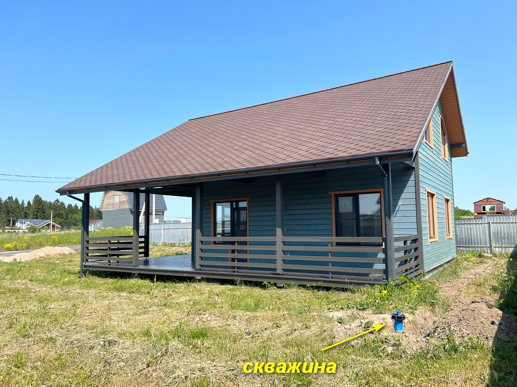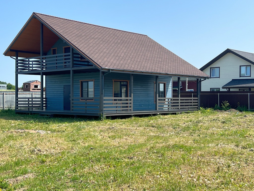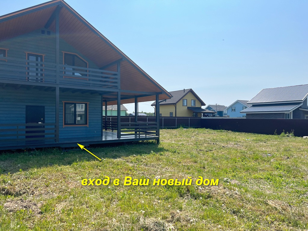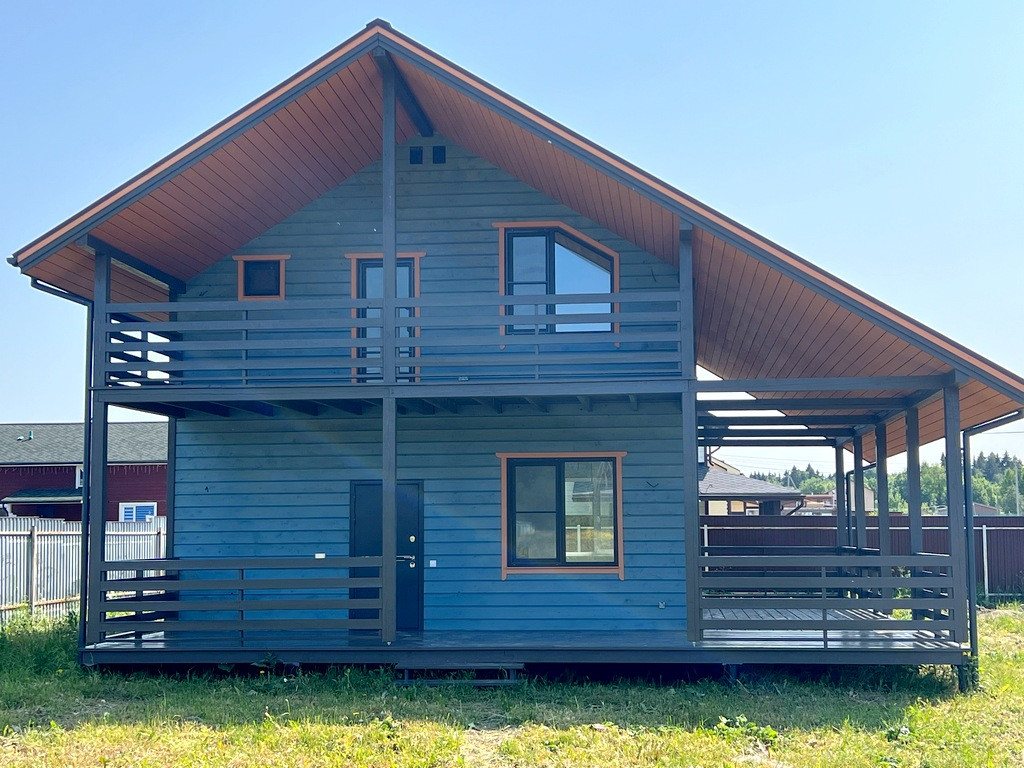 Участок правильной формы, ровный, сделан широкий въезд для автомобиля. Дом 2-х этажный 196 кв. м. с большой террасой, построен по каркасной технологии.