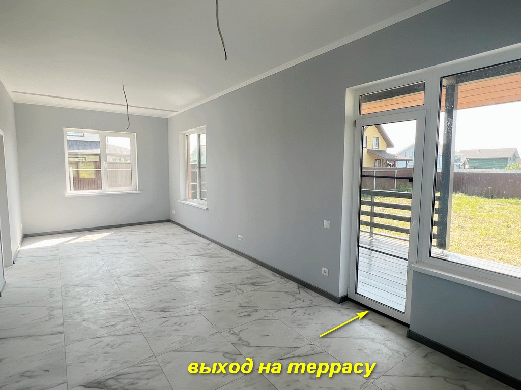 Первый этаж: прихожая, санузел 5,3 кв.м, кухня-гостиная 27 кв.м с выходом на террасу, комната 11 кв.м.