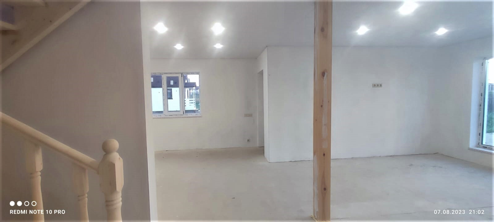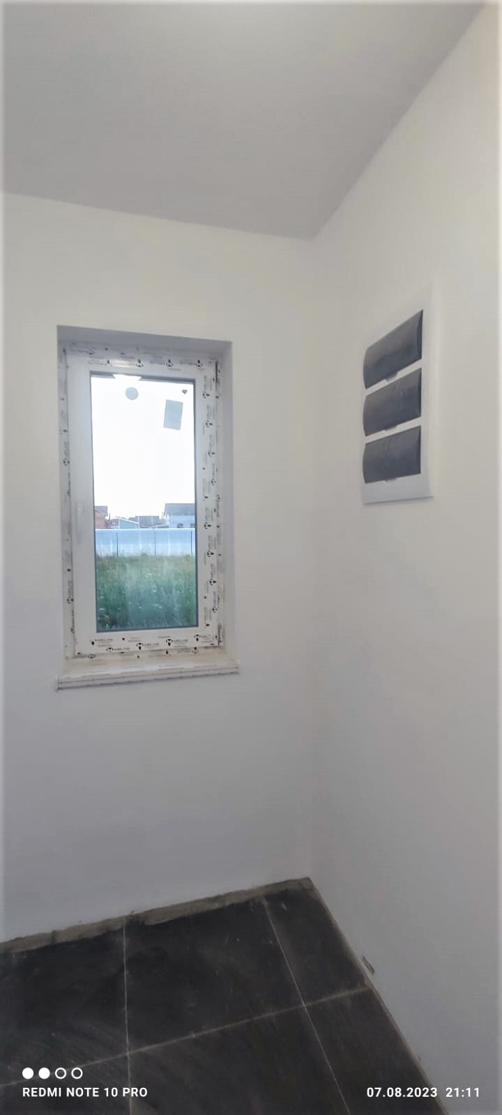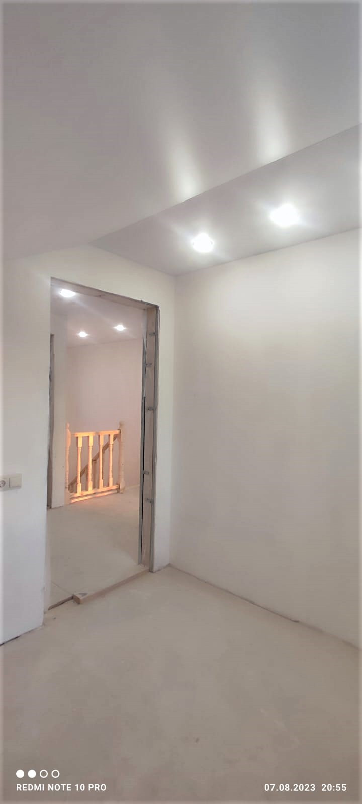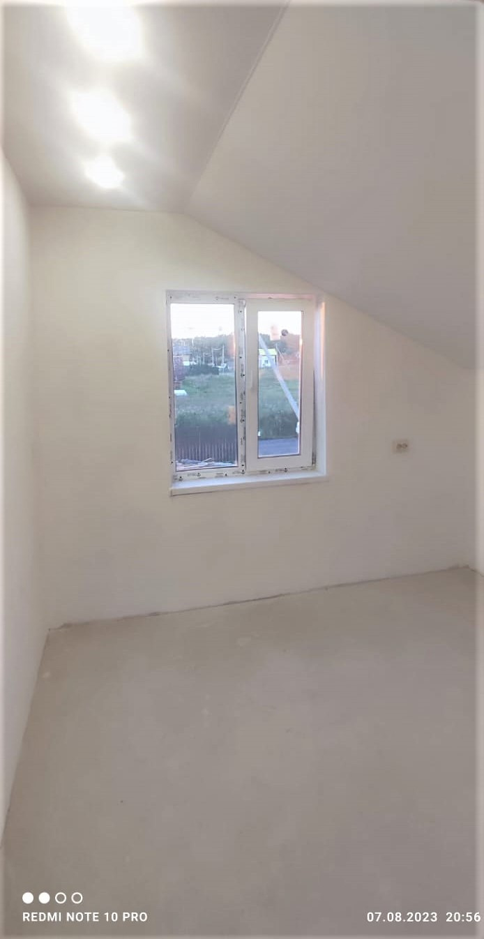 Внутренняя отделка дома завершена на 70%. По всему дому сделана разводка электричества (15 КВт), установлены розетки, выключатели, потолочное освещение. Сделаны выводы под духовой шкаф, полотенцесушитель. Сделана подводка под раковину в кухне; унитаз и раковину в гостевом санузле на первом этаже; унитаз (инсталляция), ванную, раковину и стиральную машину в совмещённом санузле на втором этаже. Установлены натяжные потолки. Стены зашиты гипроком, загрунтованы и выровнены шпаклёвкой. В санузлах стены и пол облицованы керамогранитом. Установлена лестница П-образной формы с площадкой между первым и вторым этажом.