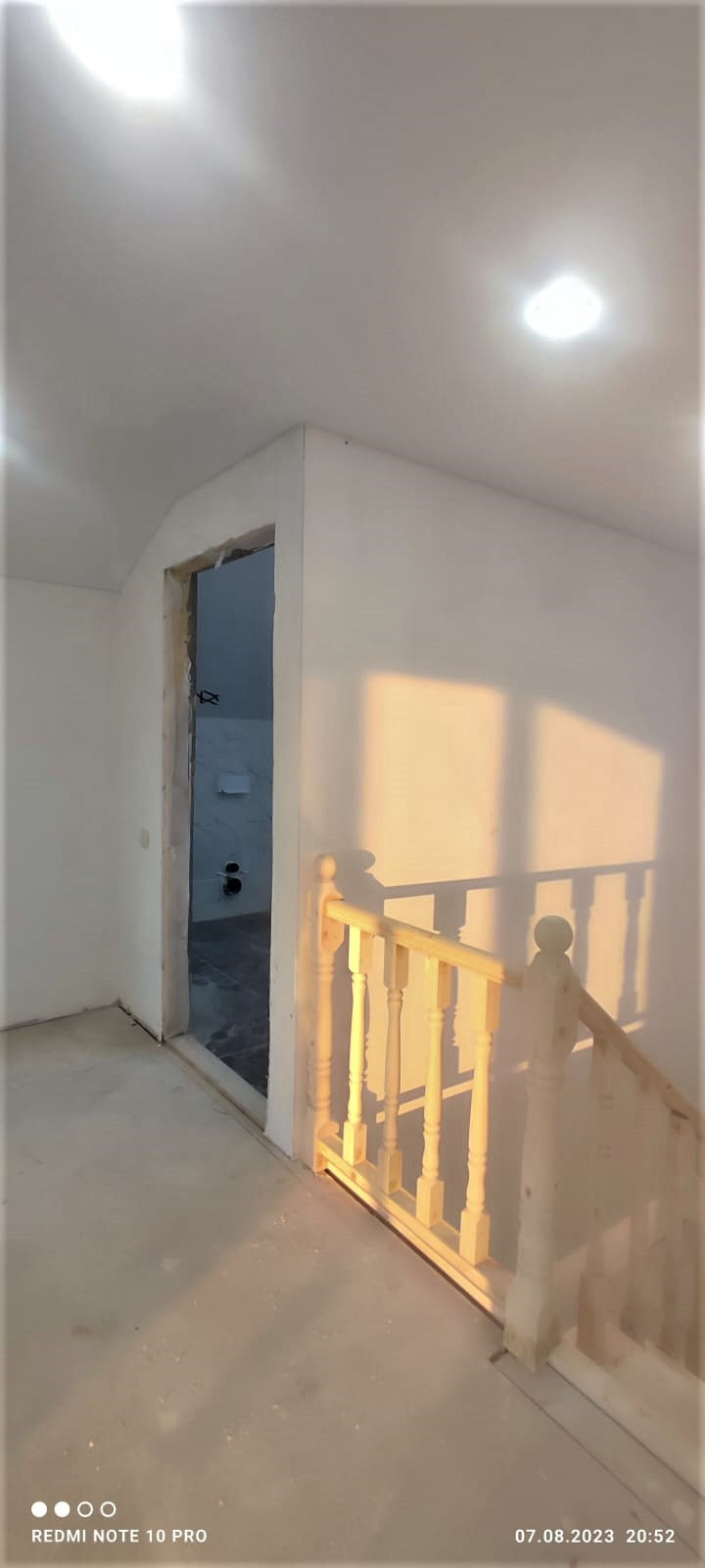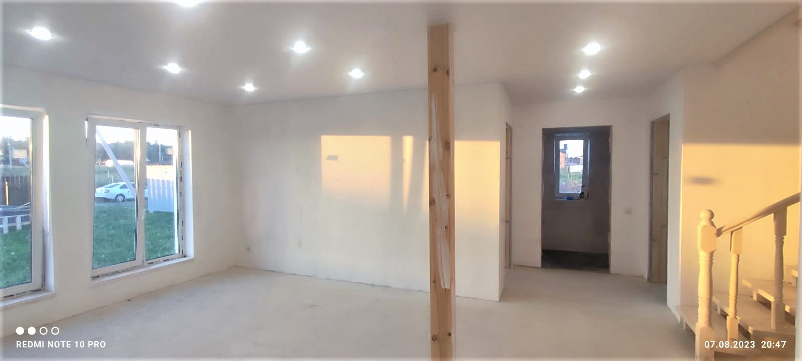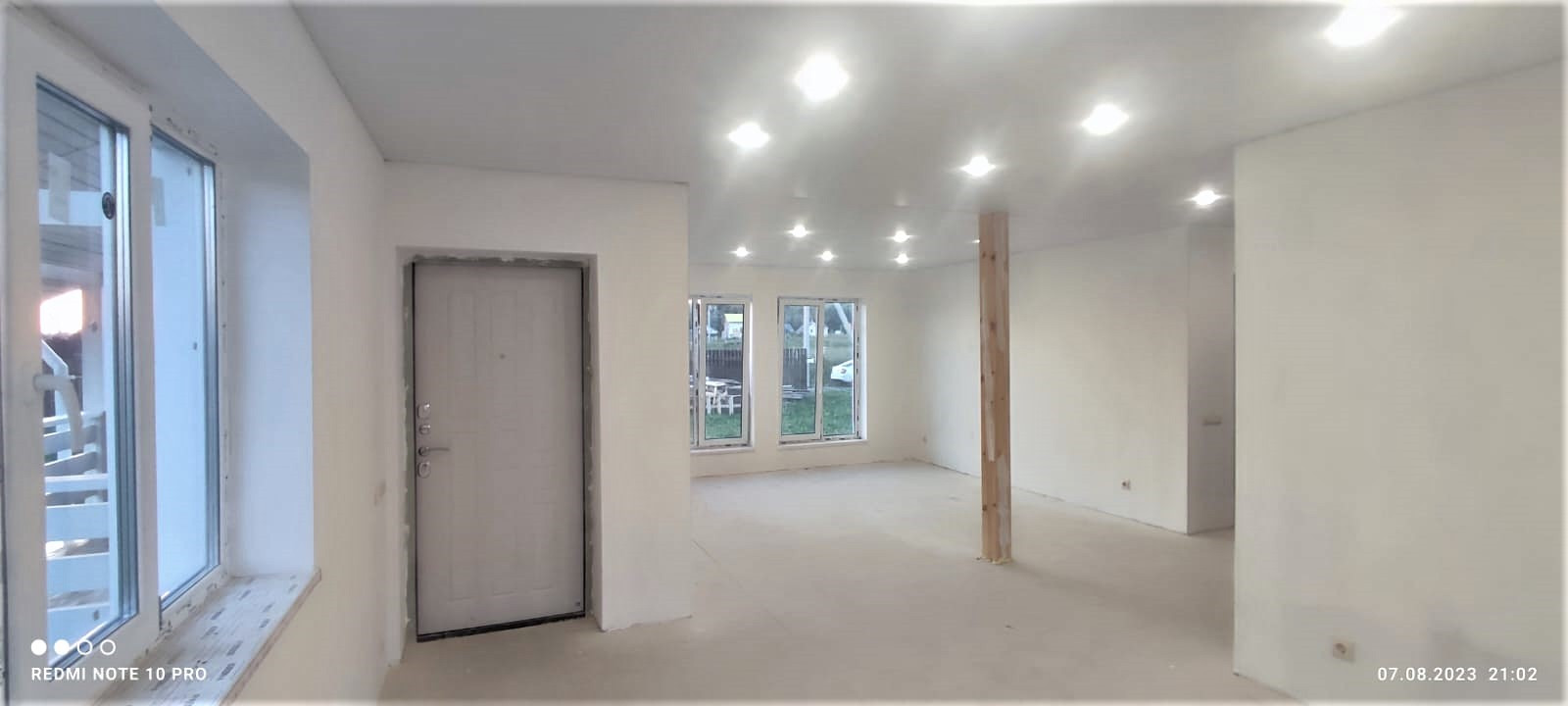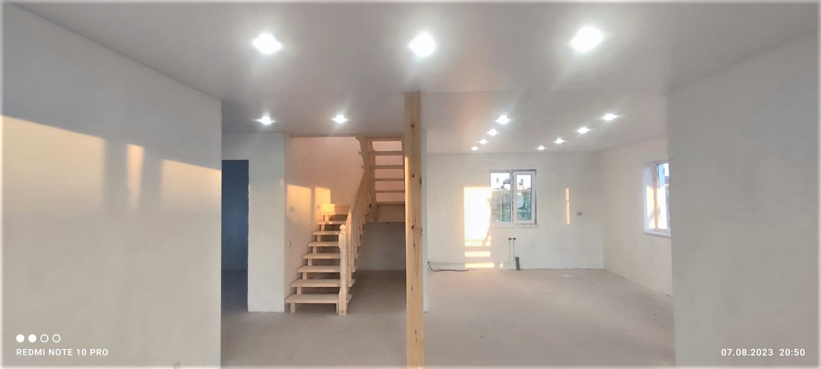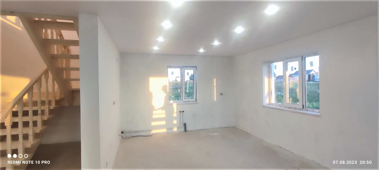Внутренняя отделка дома завершена на 70%. По всему дому сделана разводка электричества (15 КВт), установлены розетки, выключатели, потолочное освещение. Сделаны выводы под духовой шкаф, полотенцесушитель. Сделана подводка под раковину в кухне; унитаз и раковину в гостевом санузле на первом этаже; унитаз (инсталляция), ванную, раковину и стиральную машину в совмещённом санузле на втором этаже. Установлены натяжные потолки. Стены зашиты гипроком, загрунтованы и выровнены шпаклёвкой. В санузлах стены и пол облицованы керамогранитом. Установлена лестница П-образной формы с площадкой между первым и вторым этажом.