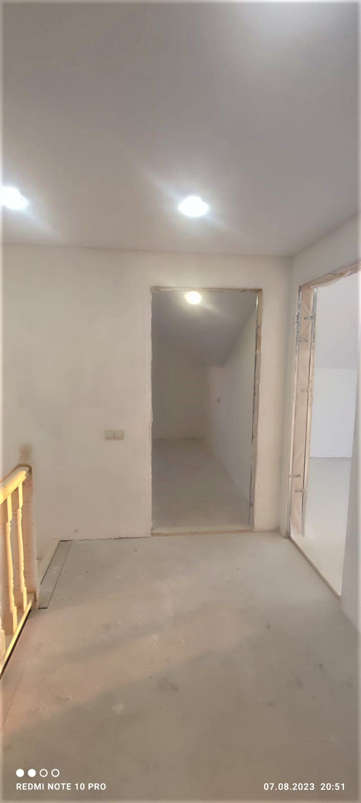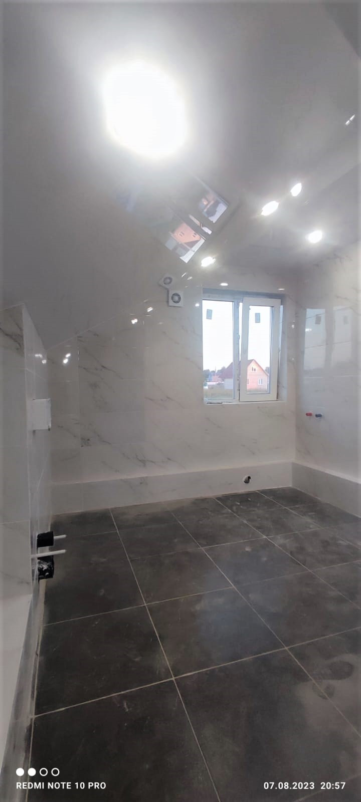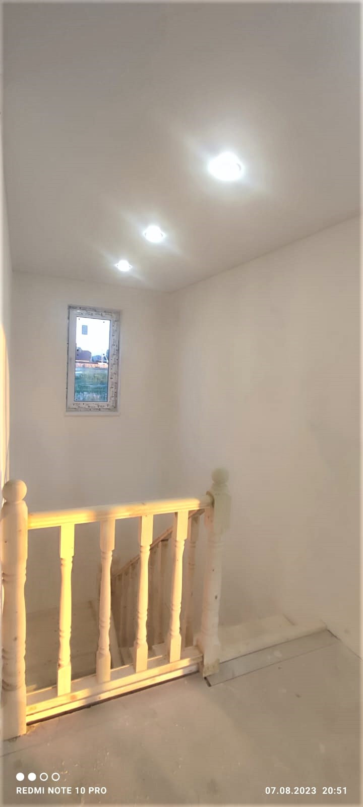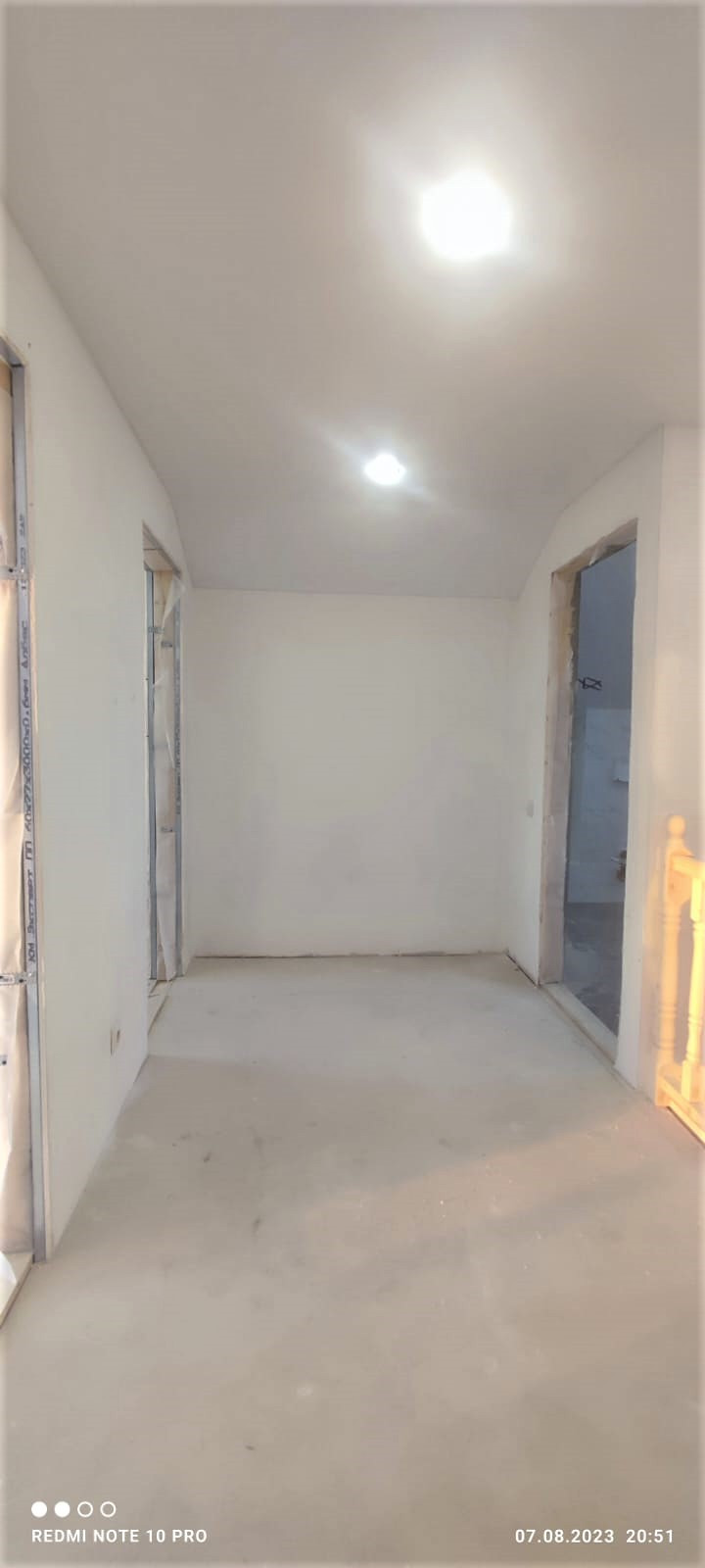 Внутренняя отделка дома завершена на 70%. По всему дому сделана разводка электричества (15 КВт), установлены розетки, выключатели, потолочное освещение. Сделаны выводы под духовой шкаф, полотенцесушитель. Сделана подводка под раковину в кухне; унитаз и раковину в гостевом санузле на первом этаже; унитаз (инсталляция), ванную, раковину и стиральную машину в совмещённом санузле на втором этаже. Установлены натяжные потолки. Стены зашиты гипроком, загрунтованы и выровнены шпаклёвкой. В санузлах стены и пол облицованы керамогранитом. Установлена лестница П-образной формы с площадкой между первым и вторым этажом.