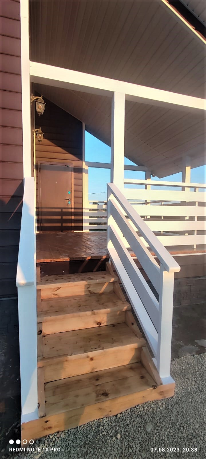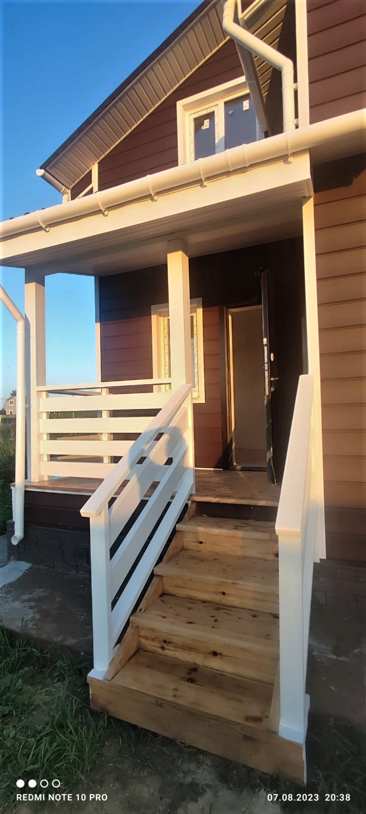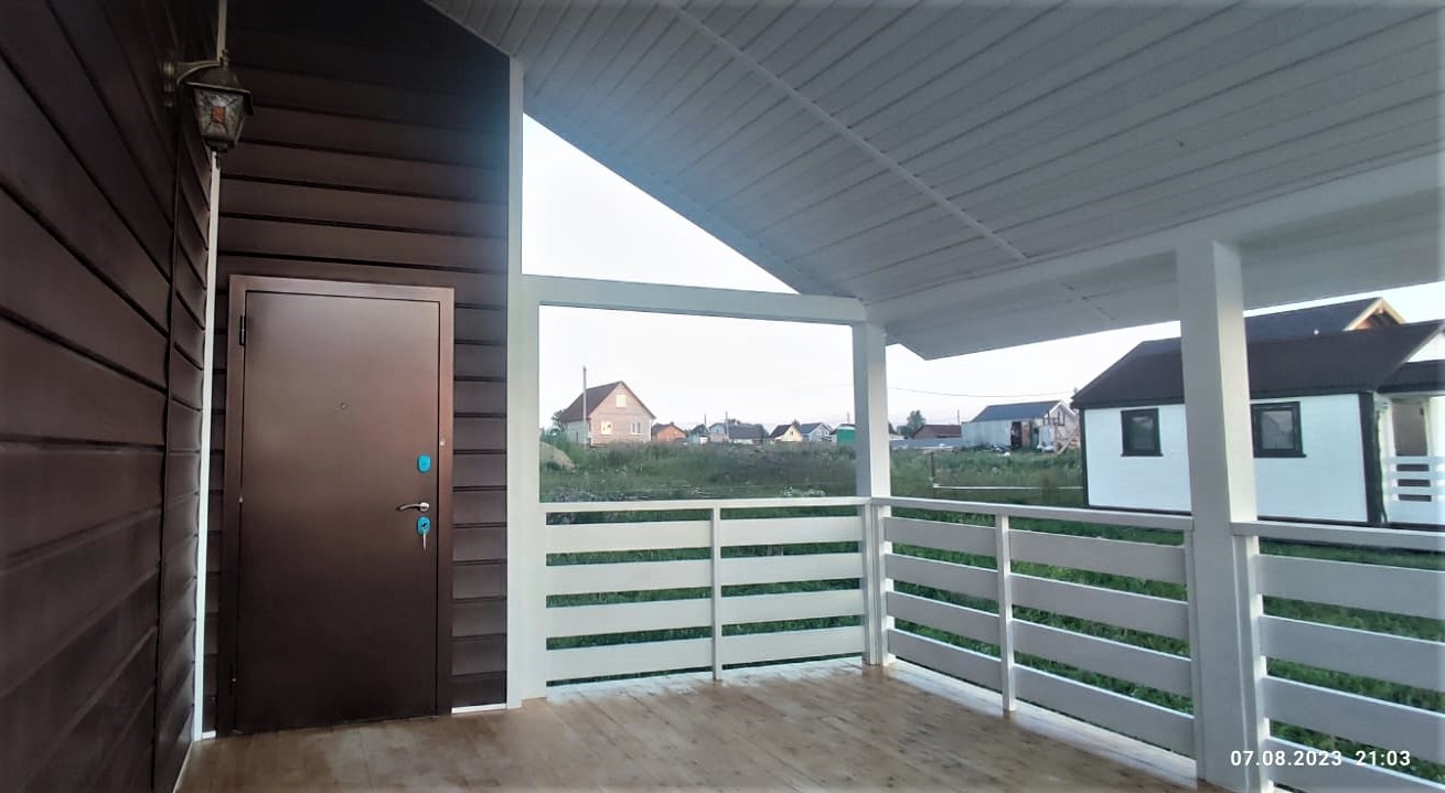 Дом двухэтажный с большой крытой террасой (15,8 м2). С террасы вход в просторную и светлую кухню-гостиную (33,5 м2). Также в доме есть парадный вход через прихожую.