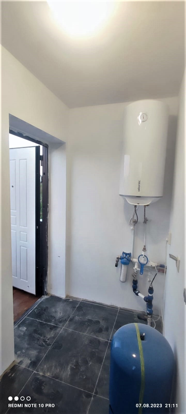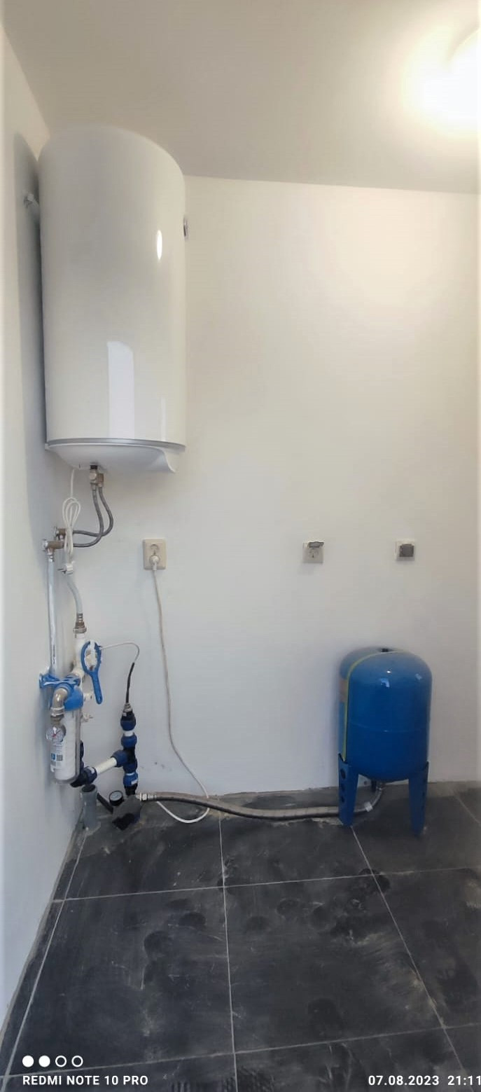 С задней стороны дома техническое помещение (бойлерная) с отдельным входом. В техническом помещении установлен бойлер, насос для подачи воды в дом от скважины и распределительный щит с автоматами.