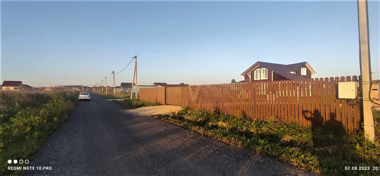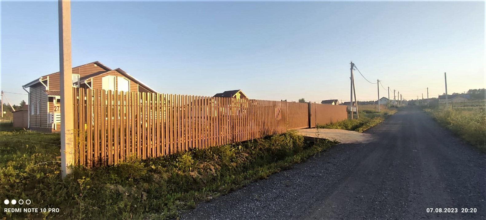 Земельный участок правильной формы, выровнен, сделан широкий заезд для автомобиля (спокойно проедет даже грузовая машина). На лицевой стороне участка установлен забор (штакетник, ламинированный под дерево), есть откатные ворота с калиткой.