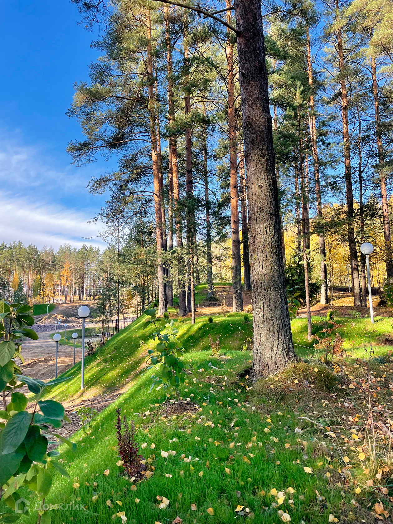Выполнены ландшафтные работы на участке: газоны, сад с многолетними плодовыми и декоративными растениями, парковки и садовые дорожки. Дренаж участка. Забор и автоматические ворота.