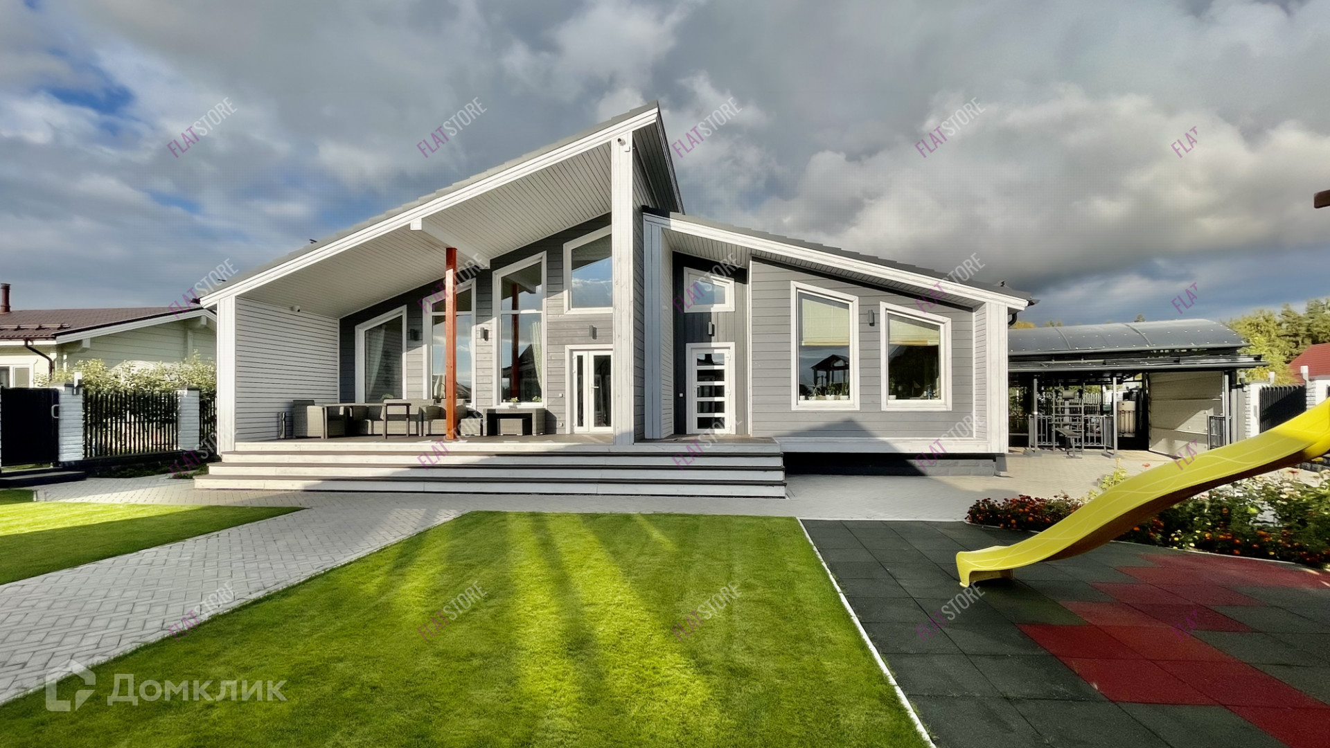 На участке основной дом, и отдельно гостевой дом, навес под авто, детская площадка.