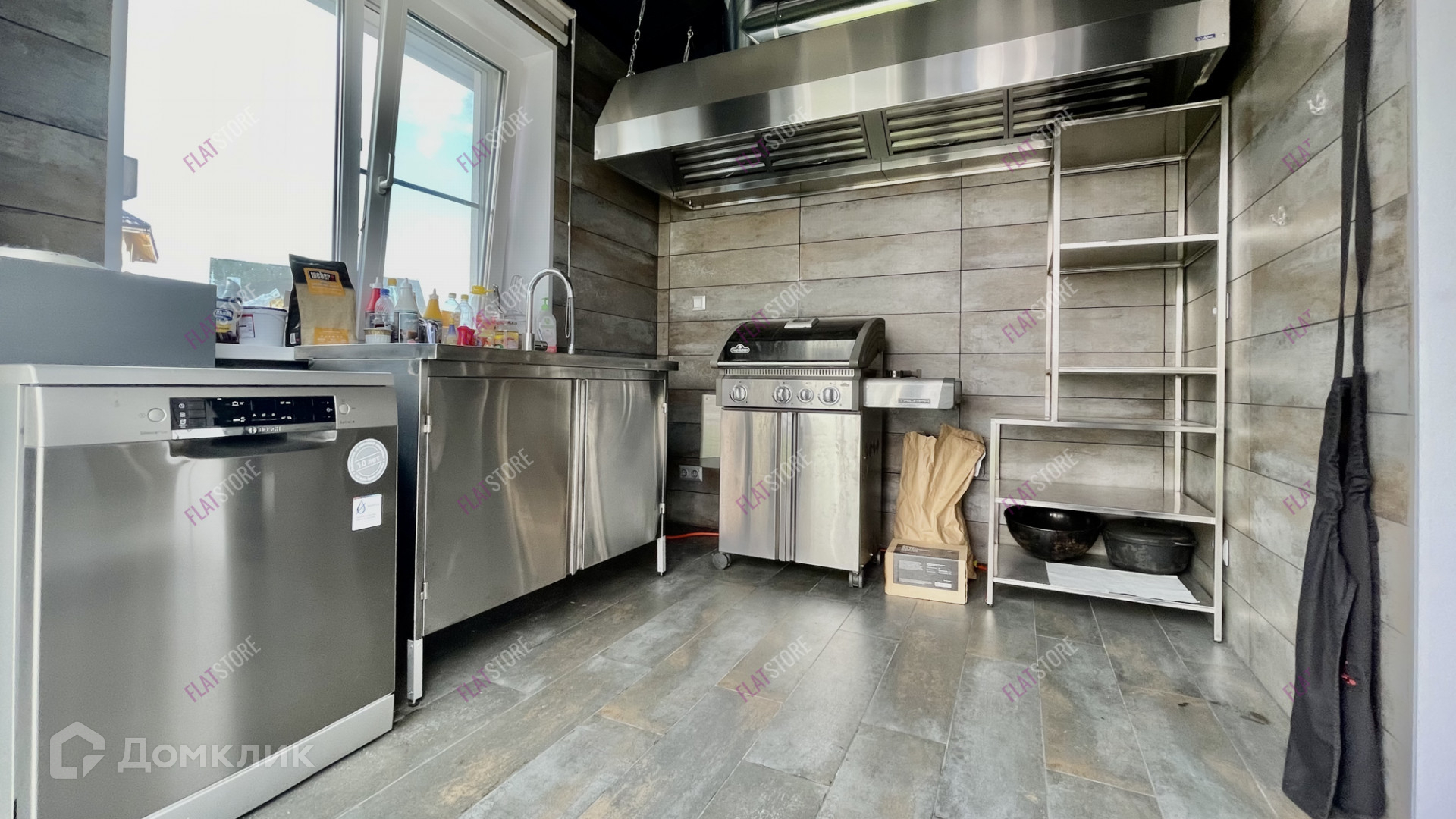 Постройка общей площадью 100м2 включает в себя кухню-столовую со столом на 15 персон, гостевым диваном и оборудованной кухней с посудомойкой и барной стойкой. Отдельное помещение оборудовано газовым грилем, мощной вытяжкой, посудомойкой Bosch и раковиной из нержавеющей стали. Также в помещении есть санузел и бойлерная с отдельным входом с улицы.