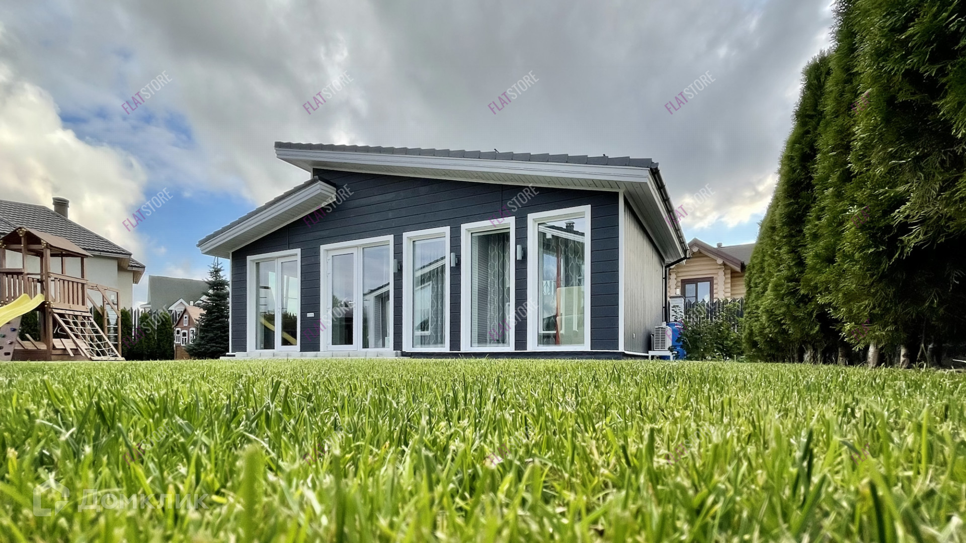 Детская площадка с качелями, горкой и домиком. По всему участку высажены плодовые и ягодные деревья, вдоль забора высажены туи и ель голубая.