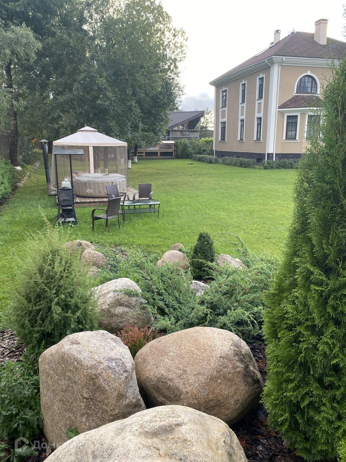 Красивый рокарий с туями, можжевельником, вереском, сосной, кизильником. На территории высоченная сосна, маленькие кедры, дуб, ели, около ста туй.