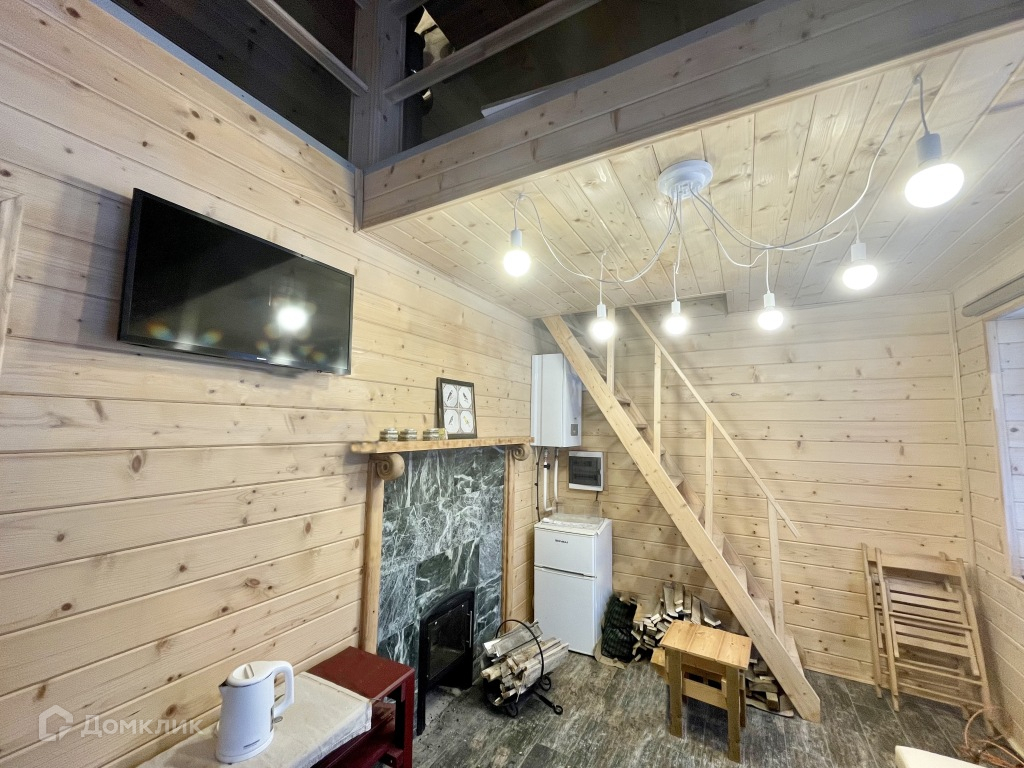 На первом этаже расположена кухня, гостиная с камином, санузел и чулан, в котором можно хранить вещи. На втором этаже 2 спальни и совмещенный санузел. В доме есть все необходимое для комфортного проживания: спальные места, места для хранения вещей, кухонный гарнитур, ванна, телевизор. Также в доме очень уютная обстановка и дизайнерский ремонт. Материал стен: СИП-панели