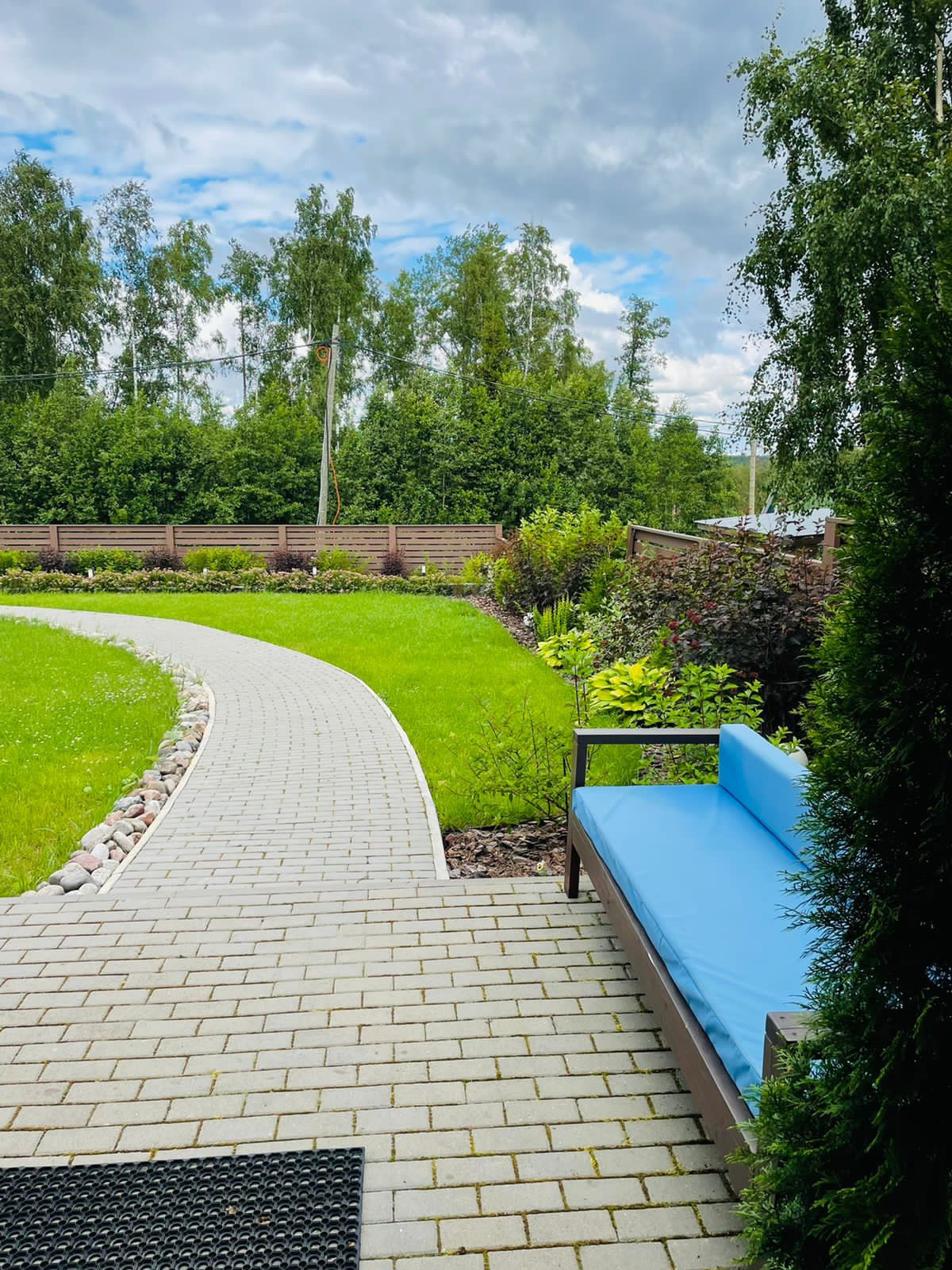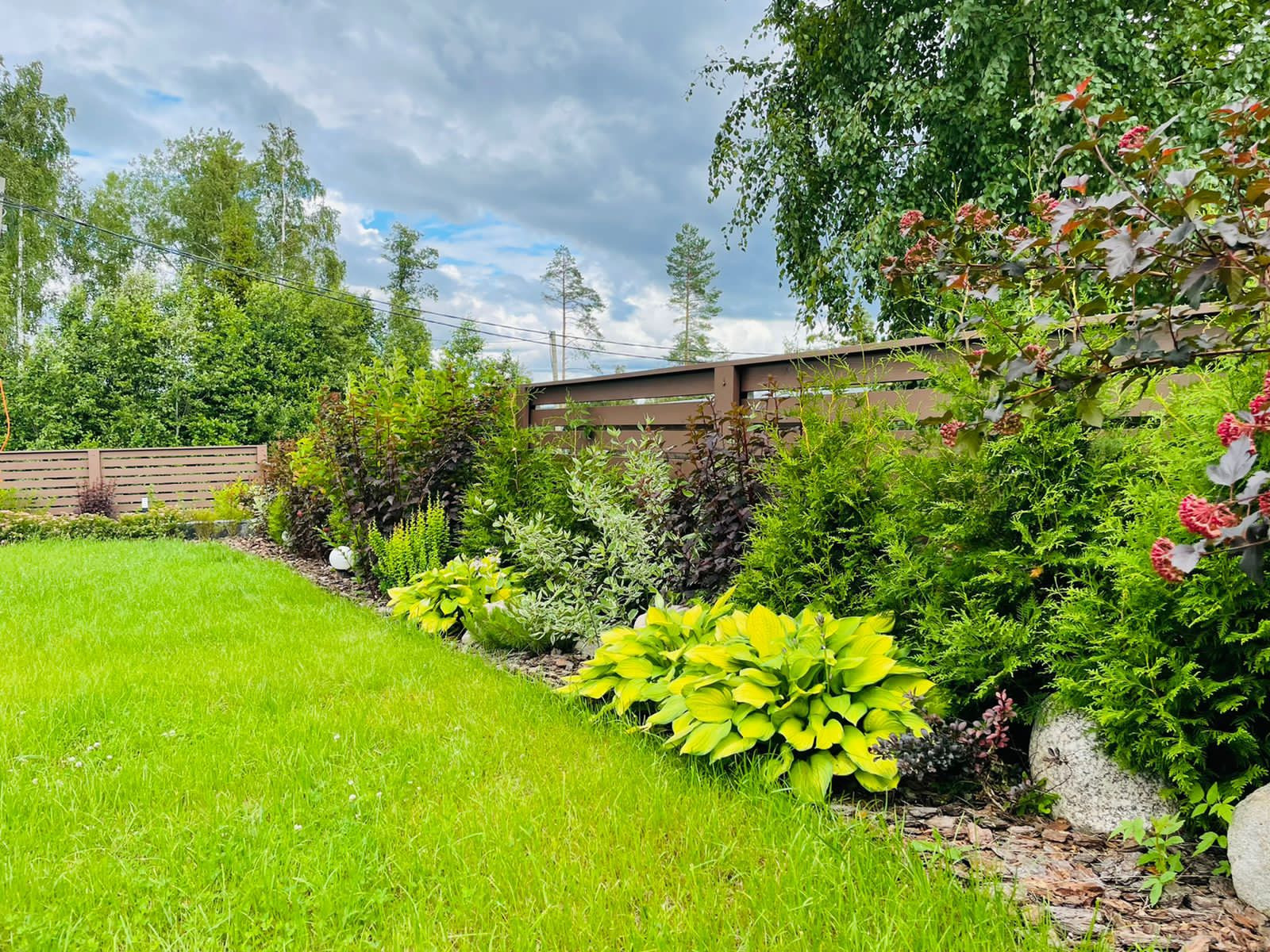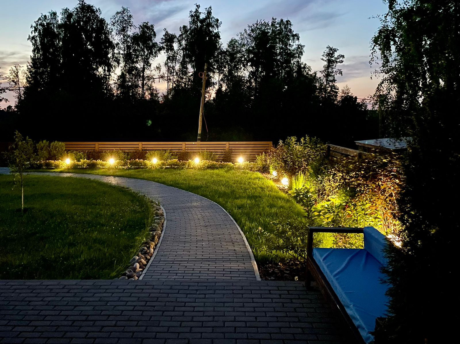 На участке два уровня: выполнены ландшафтные работы, проведено освещение, установлен забор с откатными воротами. Также предусмотрено место под строительство основного дома (подготовлено 2 проекта).