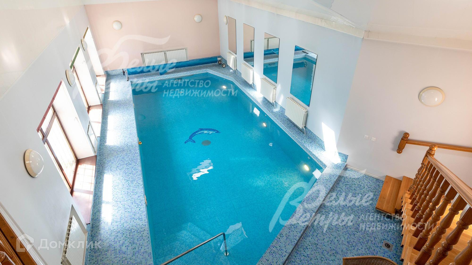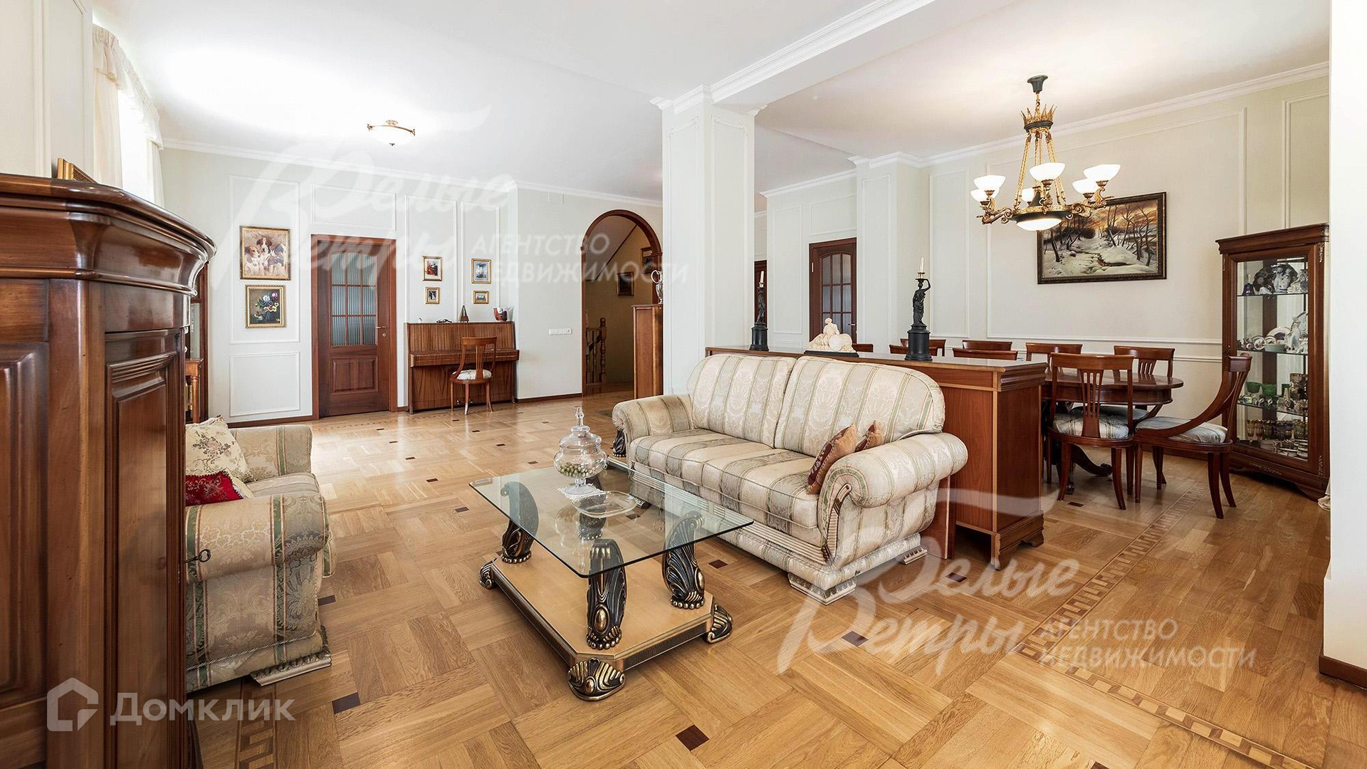 Внутренняя отделка: отделка выполнена в классическом стиле. Стены в гостиной покрашены, с элементами декора из лепнины, в спальнях обои. На полу паркет, на мансарде - инженерная доска, в санузлах - плитка, в бассейне - мозаика. Потолок подвесной с точечным освещением и люстрами. Установлена вся сантехника. Двери межкомнатные из массива со стеклянными вставками..