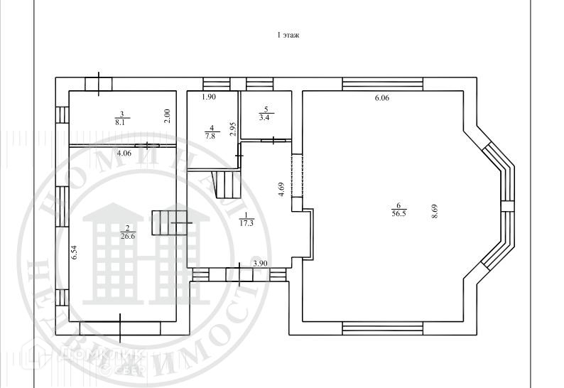 1-й этаж: холл -17,3 кв.м, гостиная с кухонной зоной - 56,5 кв.м., с/у -7,8 кв.м., прачечная, кладовая, гараж - 26,6 кв.м., котельная.