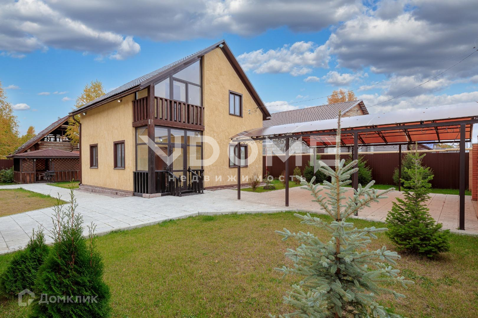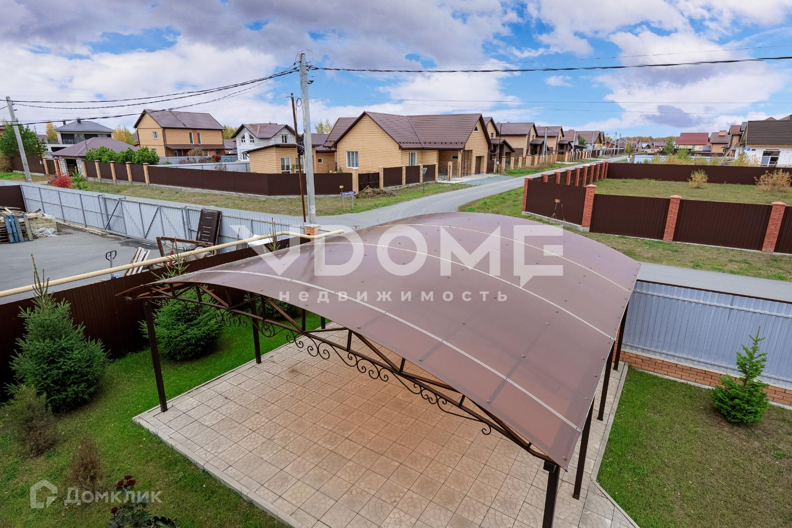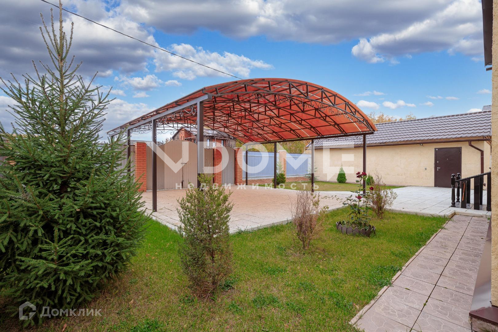 Двор дома – это красивая, продуманная до мелочей, ухоженная территория с идеально ровным газоном.  Есть посадки плодово-ягодных культур, хвойных пород деревьев. Так же между воротами и домом сделан кованый навес, под которым с лёгкостью разместятся две машины.