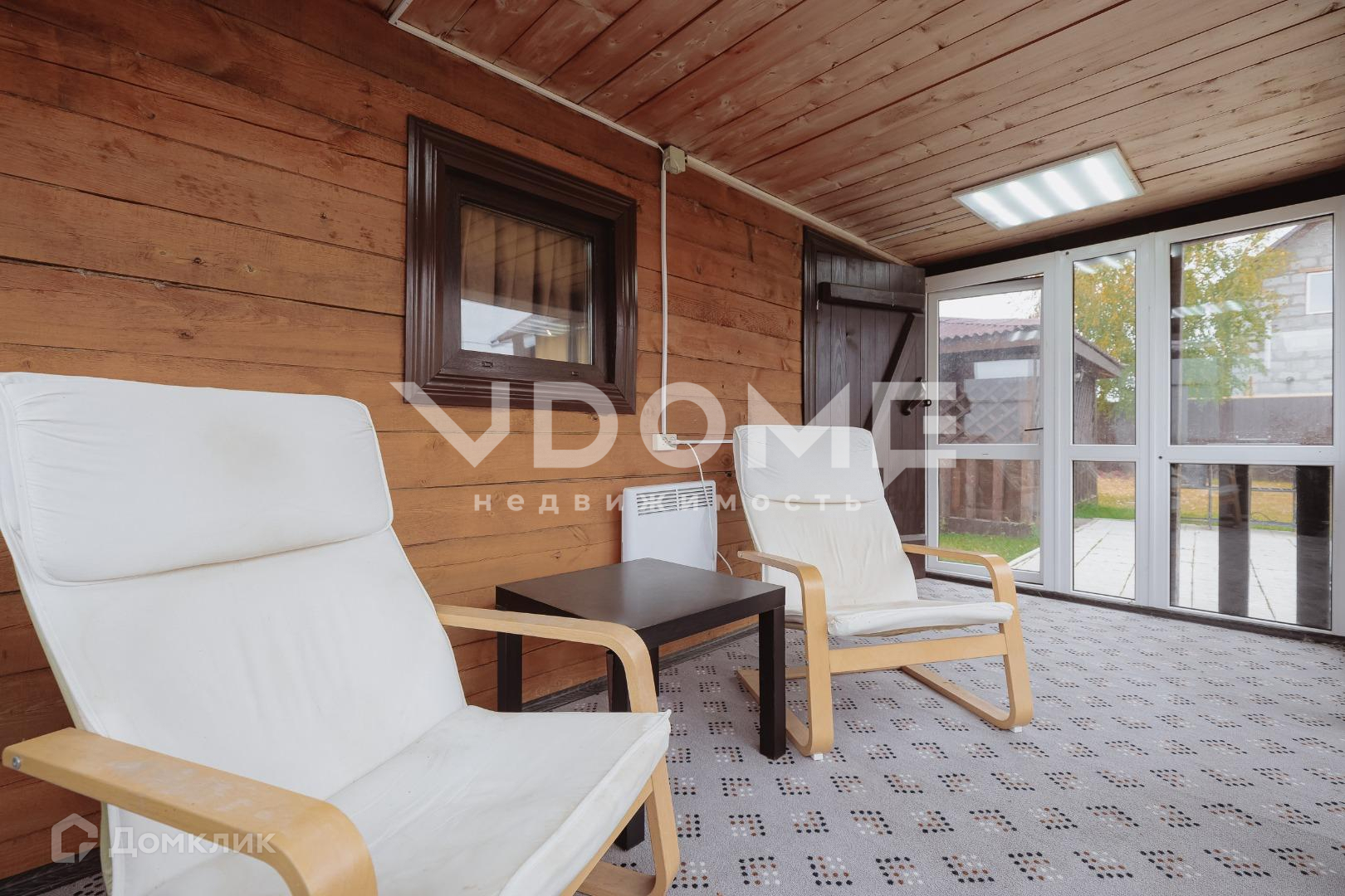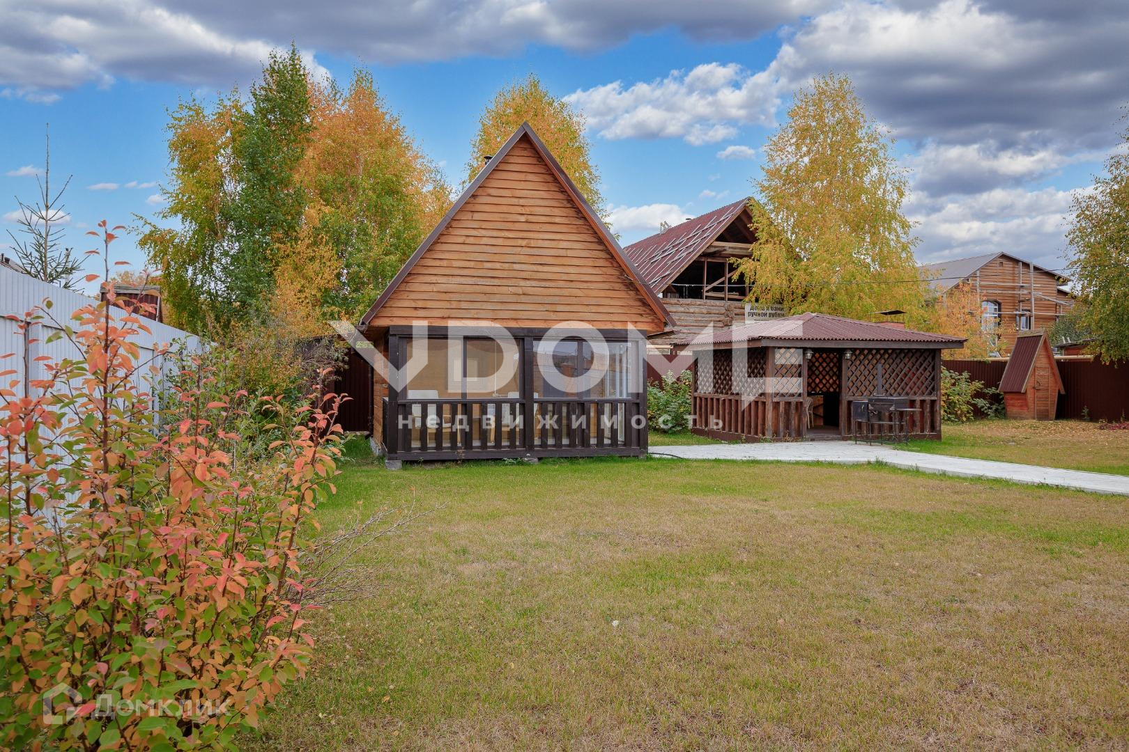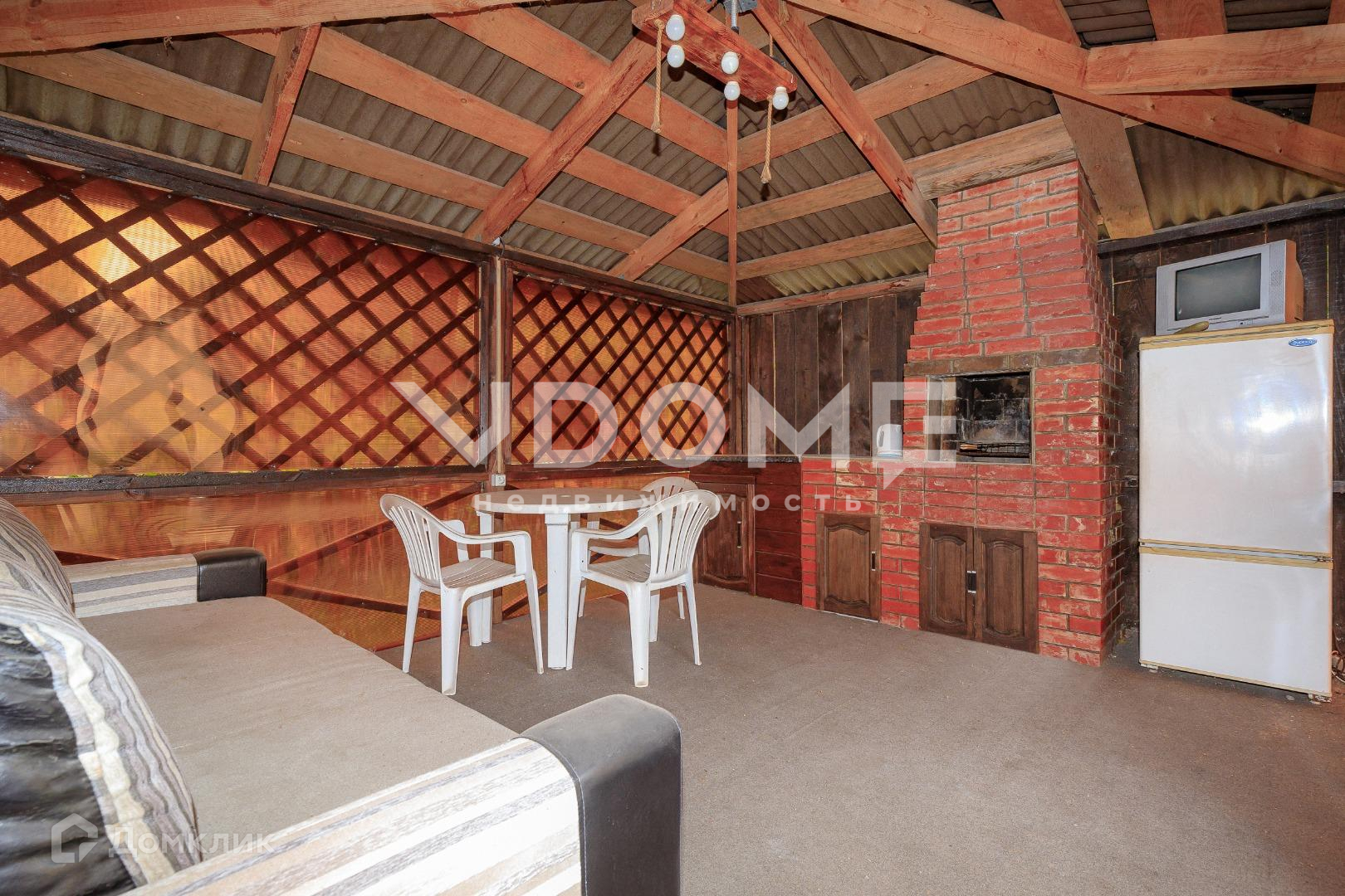 Рядом с ней стоит красивая и удобная летняя беседка из дерева, с проведённым светом, где установлена мебель и техника. В ней можно уютно расположиться летом и провести время с семьёй и друзьями. Рядом с беседкой остаётся большой красивый мангал.