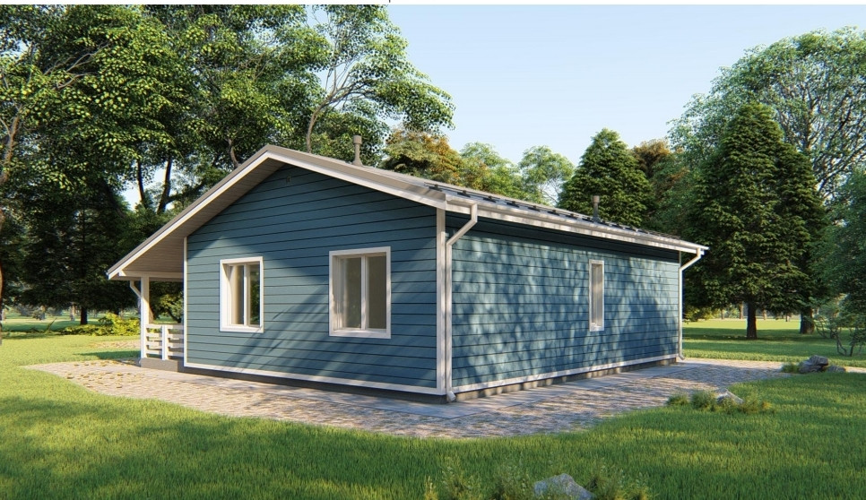 деревянный силовой каркас выполнен по канадской технологии согласно проектной документации, с соблюдением всех архитектурных норм и правил. Каркас дома снаружи обшит жесткой ветрозащитной плитой, что придаёт дополнительную жёсткость каркасу, обеспечивает дополнительное утепление и не продуваемость дома при ветреной погоде. В качестве финишной отделки имитация бруса с предварительной покраской финской краской TEKNOS. В вентиляционный зазор между каркасом и отделкой, обязательно ставим нержавеющую сетку от проникновения грызунов;