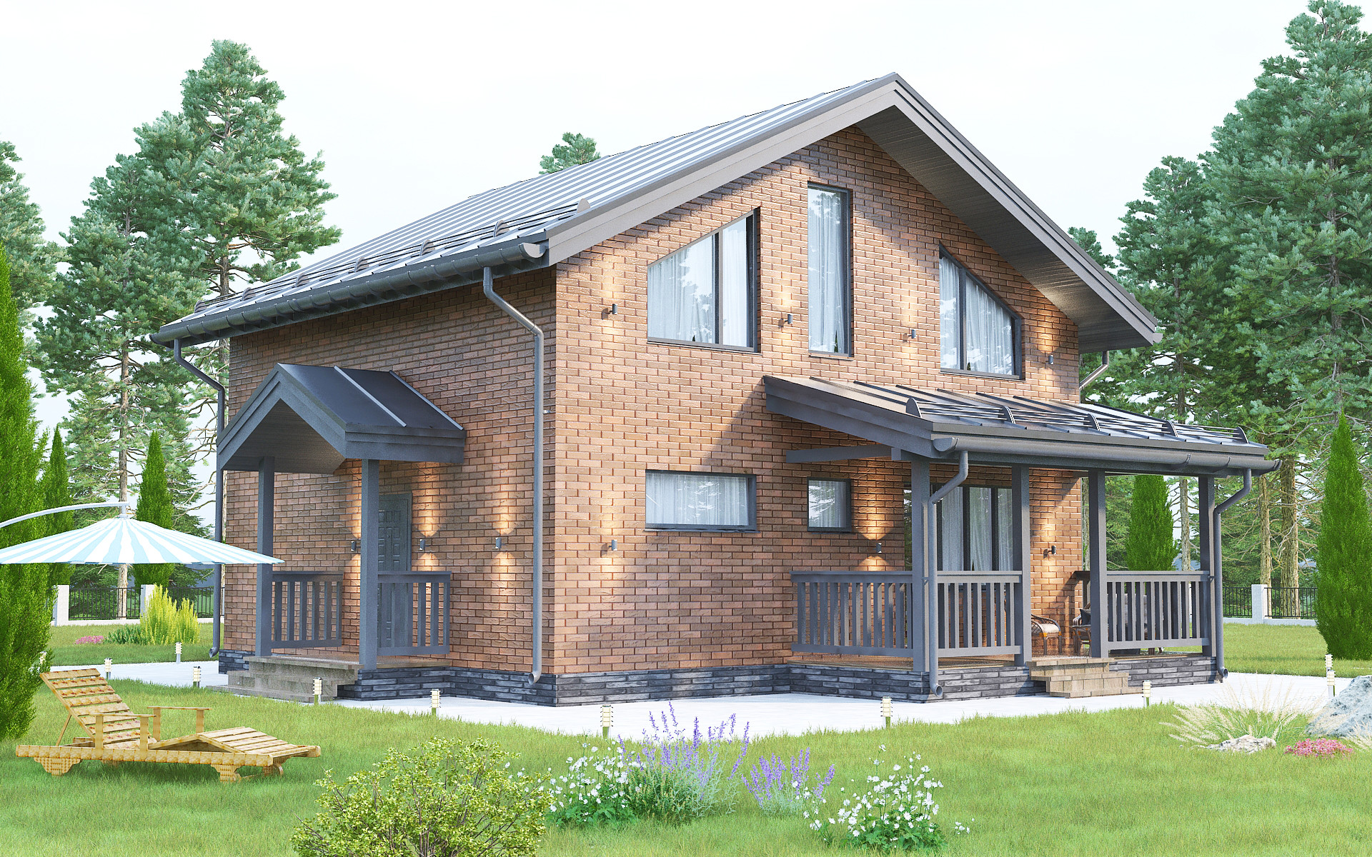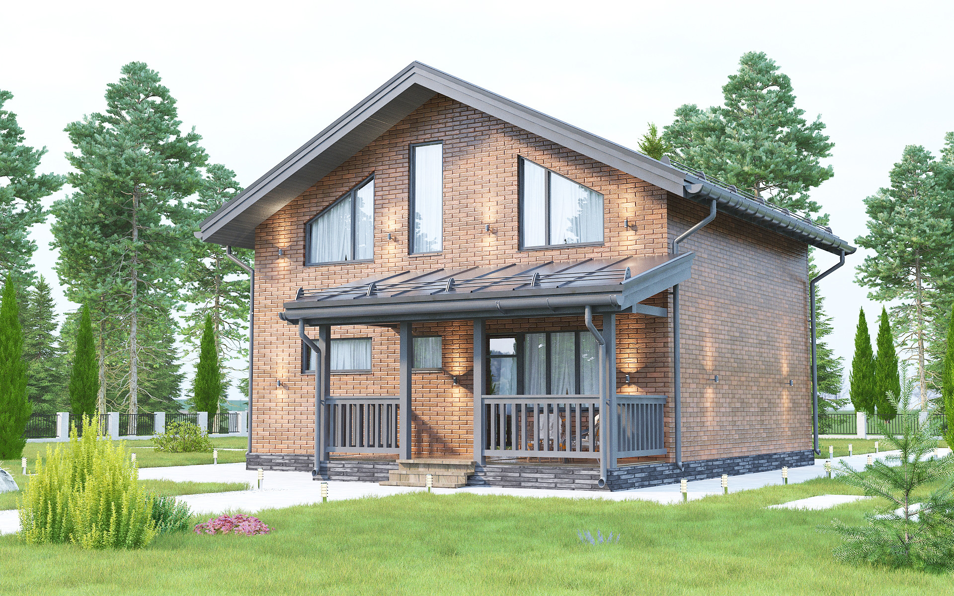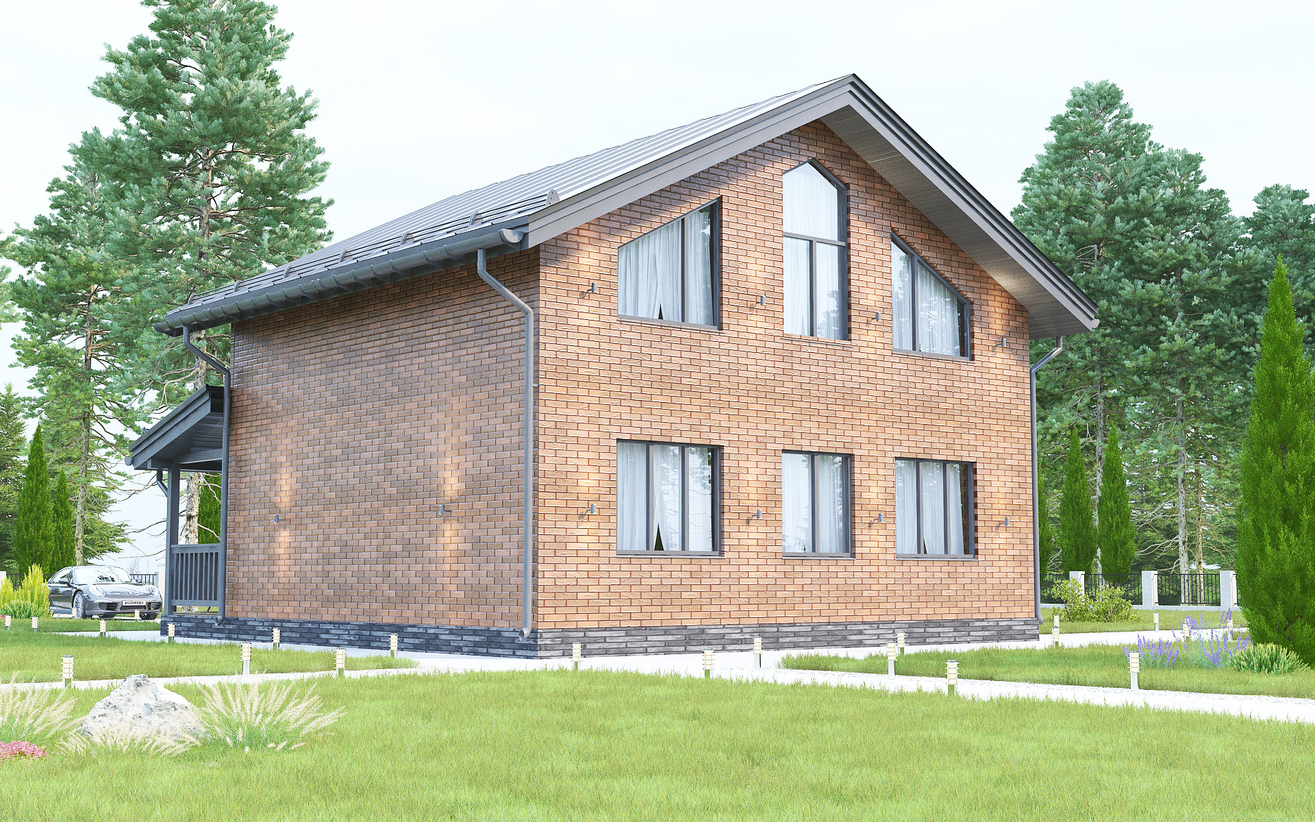 "Проект дома "КД-120" выполнен из керамзитоблока с облицовочным кирпичом "Флеш-готика", рифление «Рустик». Размеры дома 7,4мх8,5м. В проекте два этажа четыре спальни, два сан.узла и дополнительные комнаты. На 1-ом этаже: