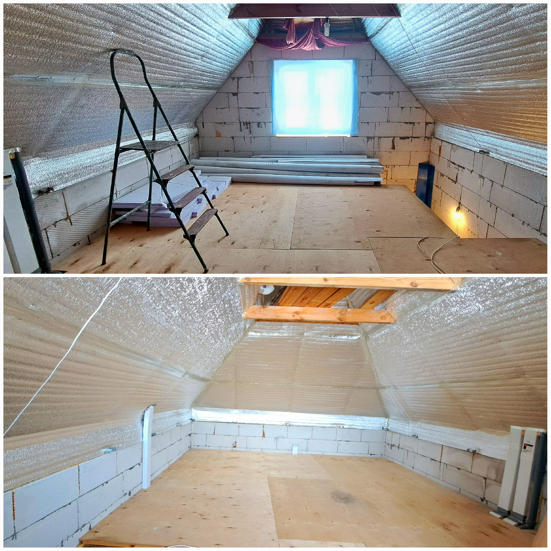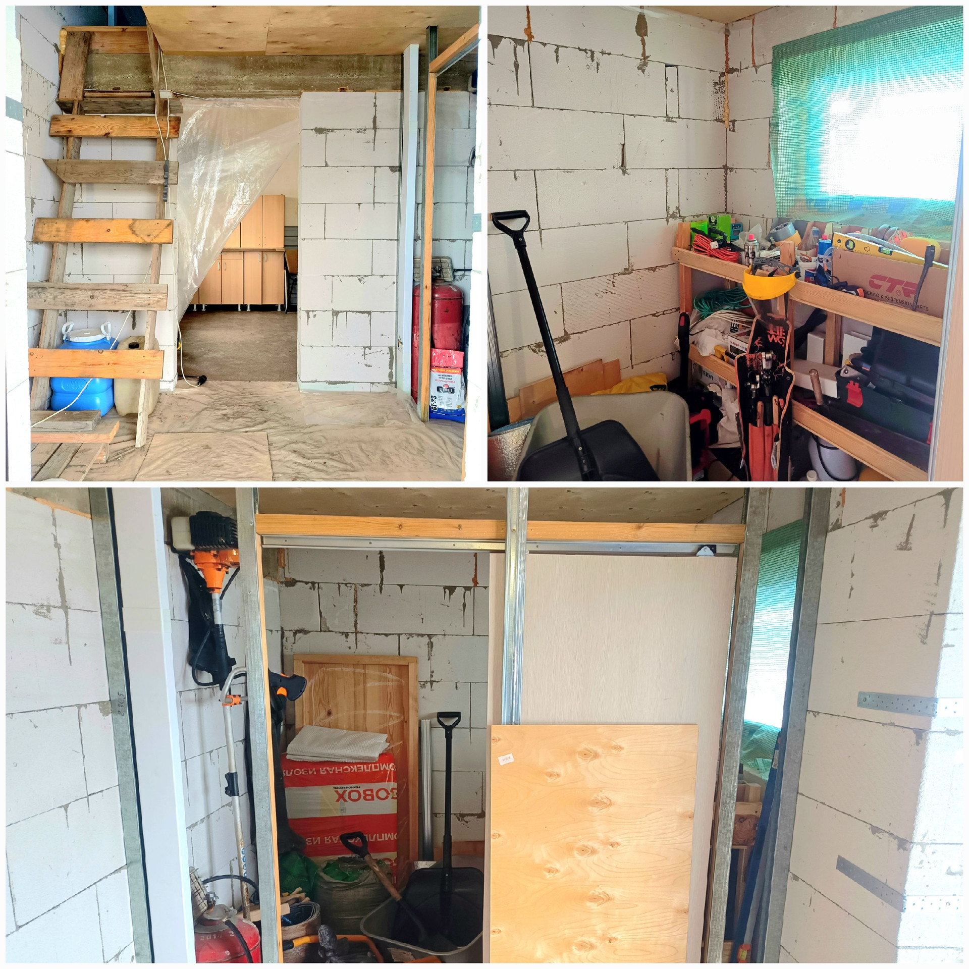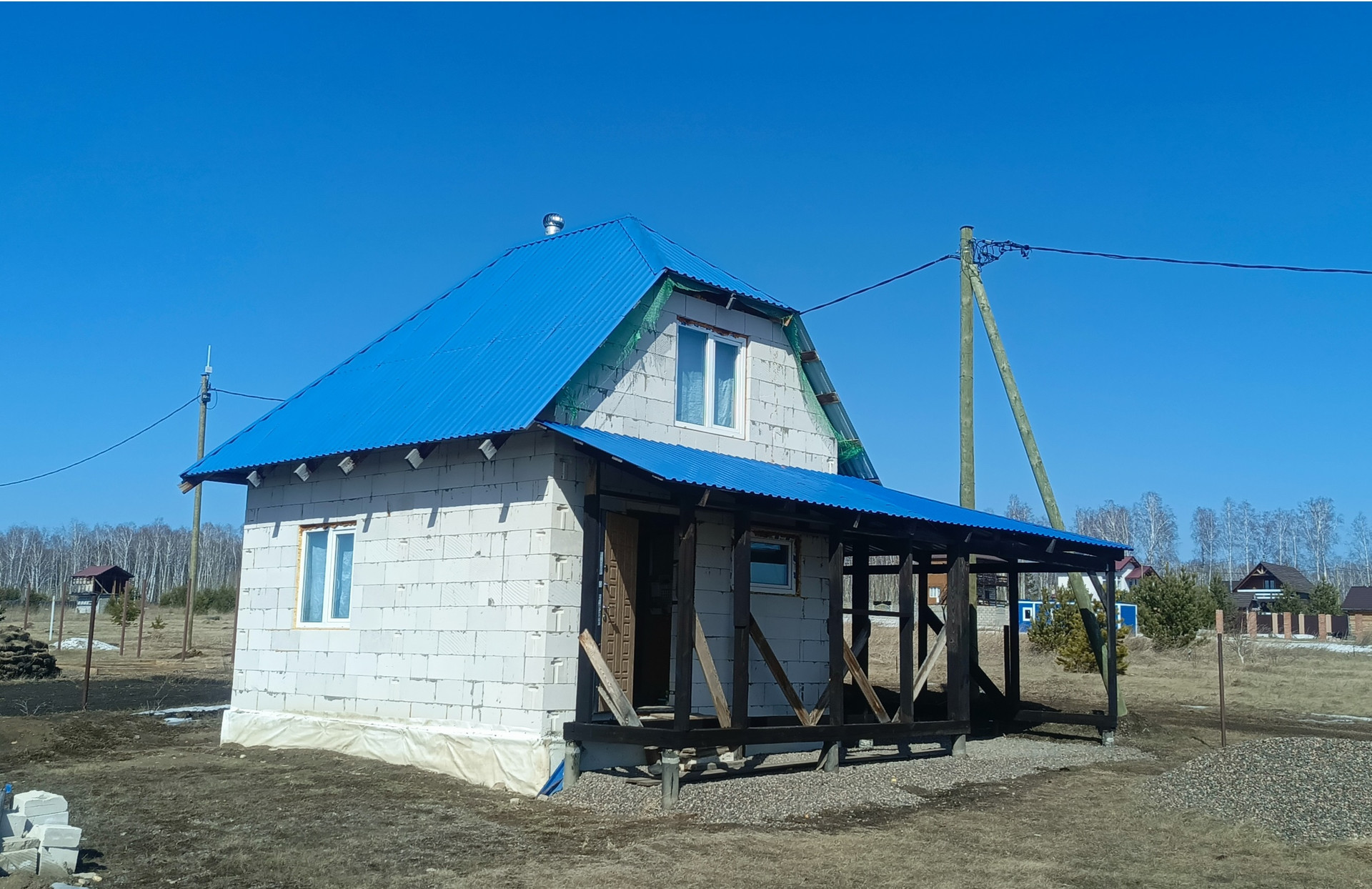 Дом - монолитная ж/б лента 30*90 см, залита с гидроизоляцией и утеплением, на подушку из щебня. Перекрытия деревянные, лаги 50*150 с шагом 60, утепленные, зашиты доской 25мм + фанера 12мм. Стены из газоблоков "Силекс" Б3-500, 30 см толщина. Второй этаж утеплен, окна пластиковые, кровля профлист 0,45 мм. Осталось доделать электропроводку, чистовую отделку и капитальную лестницу. Снаружи организована крытая пристройка на ж/б сваях, планировался гараж.