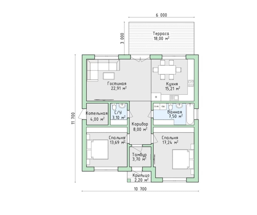 В доме расположены 2 спальни, одна большая кухня-гостиная, гардероб,  2-санузла, техническая комната