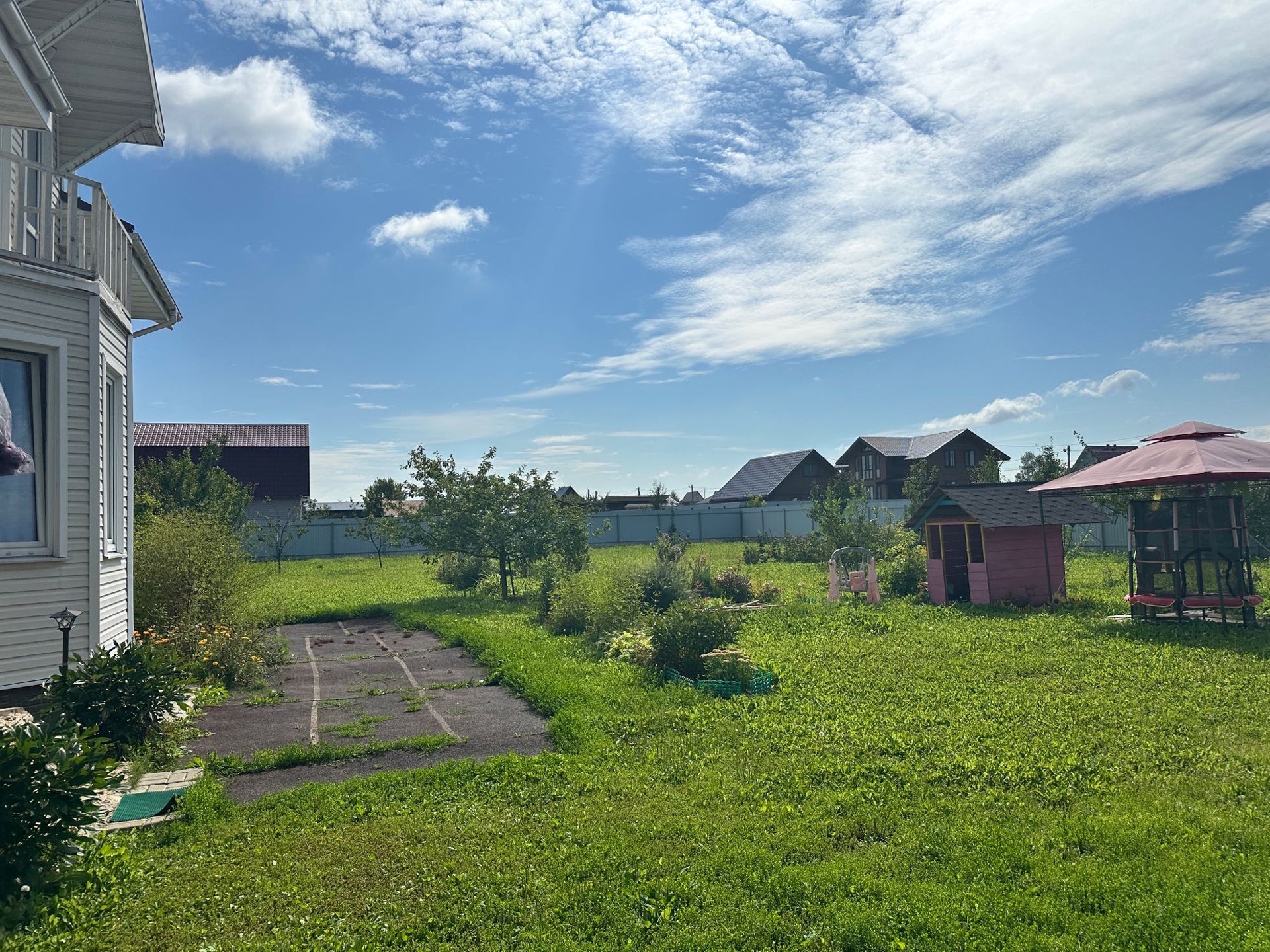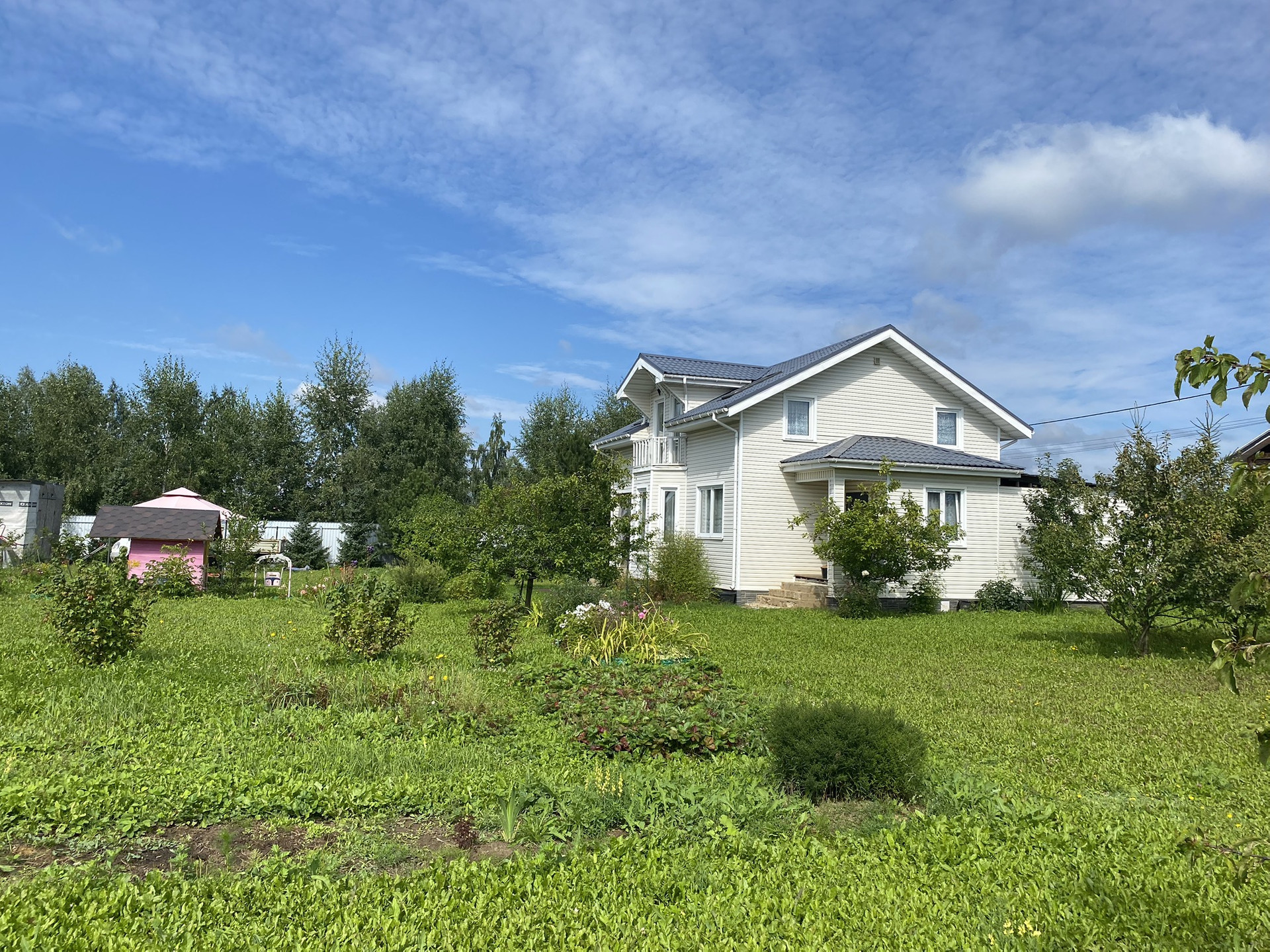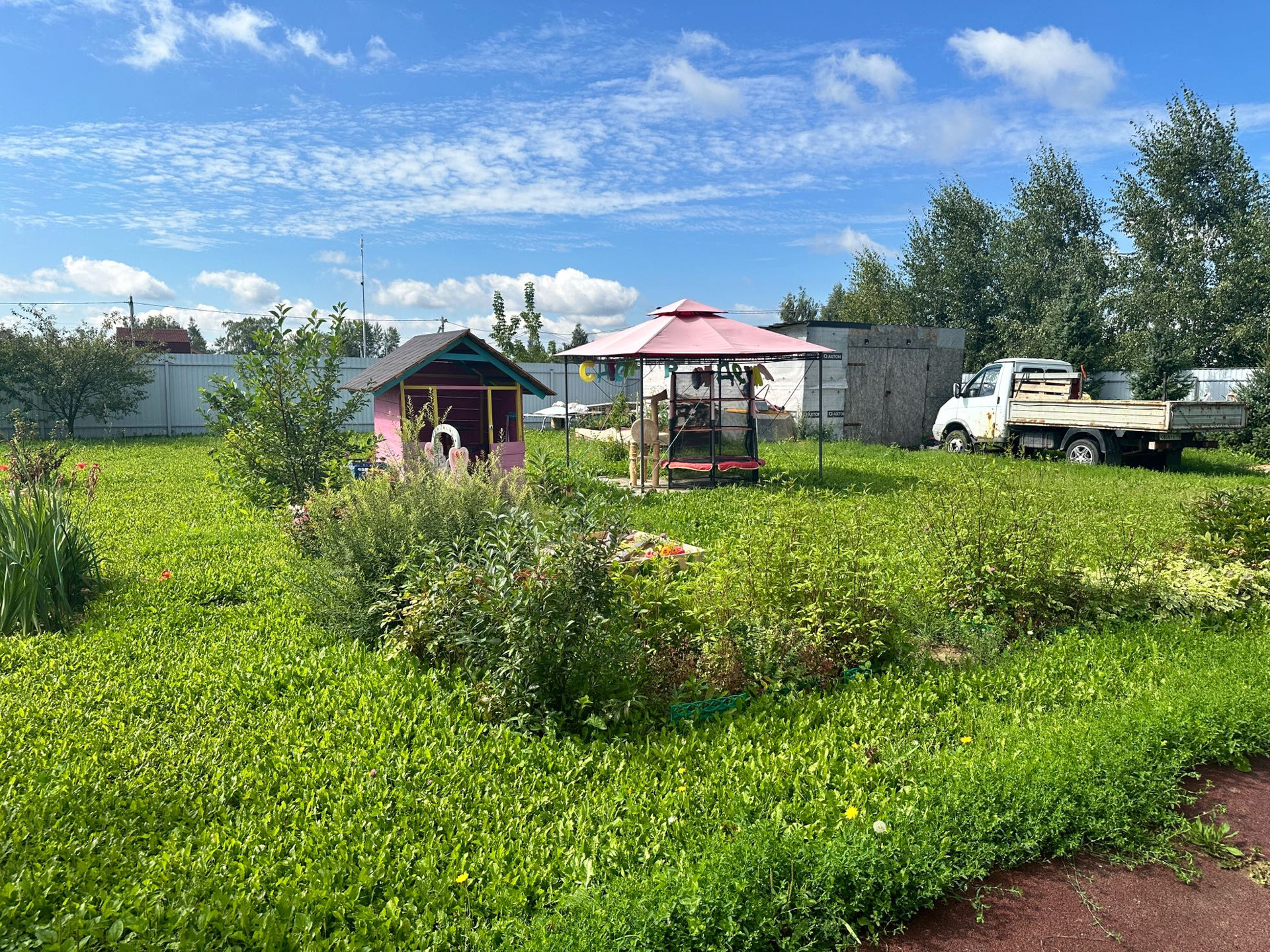 Участок большой, сухой, ровный, огорожен со всех сторон забором из профлиста. На участке растут хвойные (сосны, ели), молодые плодово-ягодные деревья, кустарники и цветы.