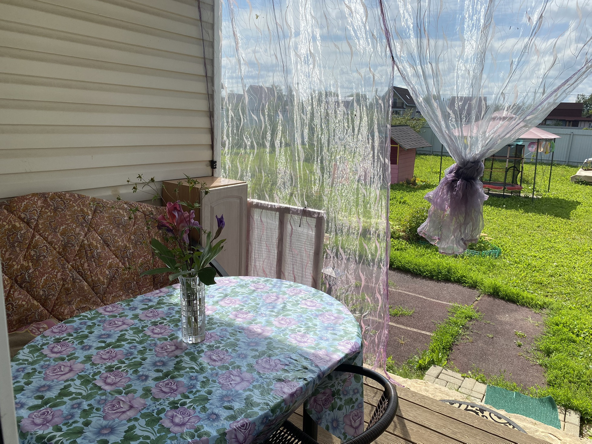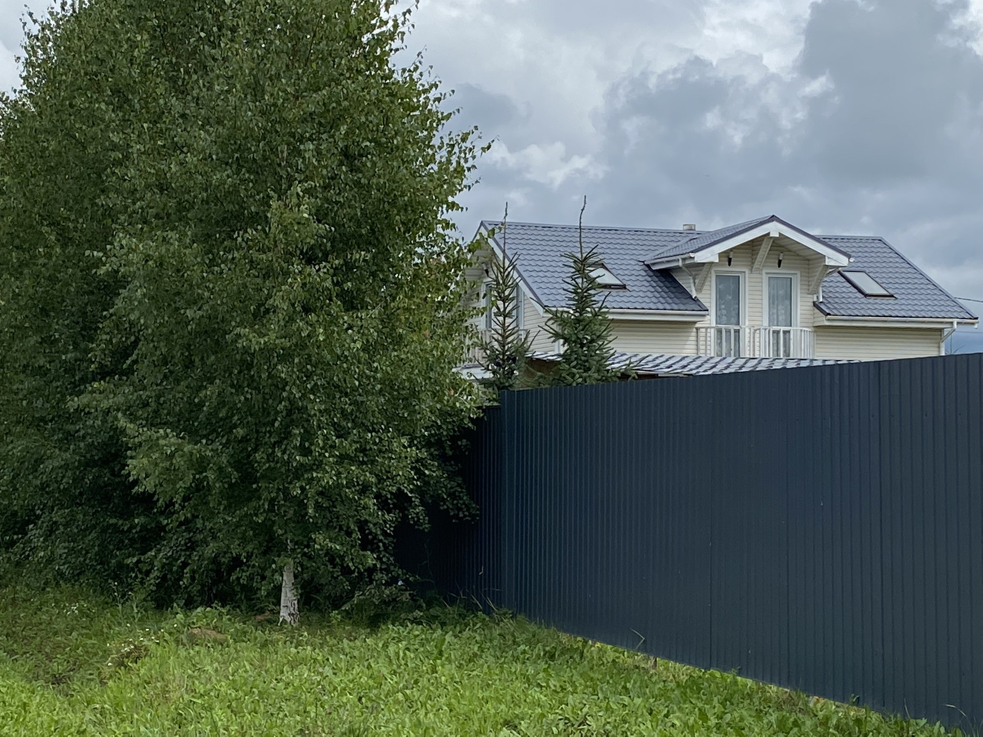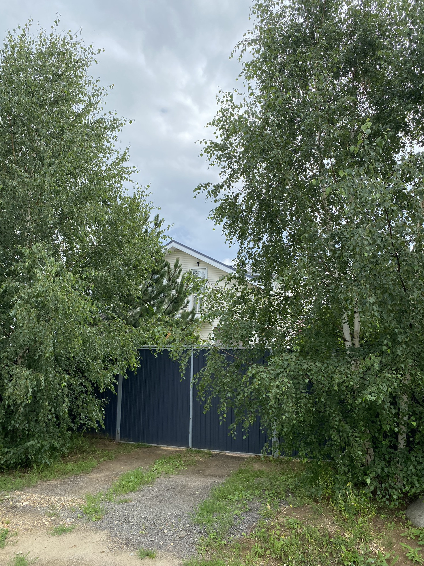 Участок большой, сухой, ровный, огорожен со всех сторон забором из профлиста. На участке растут хвойные (сосны, ели), молодые плодово-ягодные деревья, кустарники и цветы.