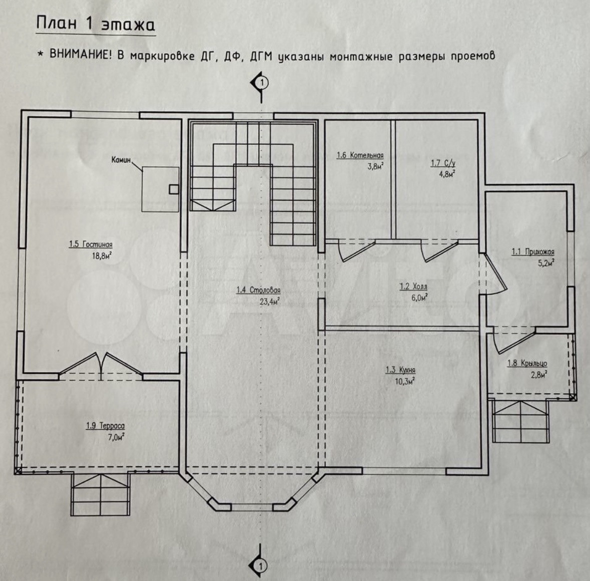 На первом этаже: гостиная с камином, с выходом на террасу, большая кухня со столовой, котельная, ванная комната с с/у, два входа в дом.
