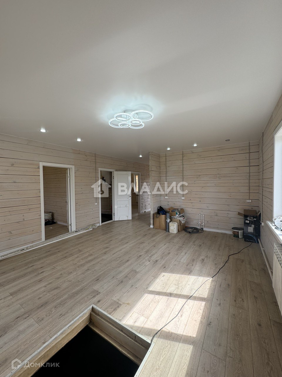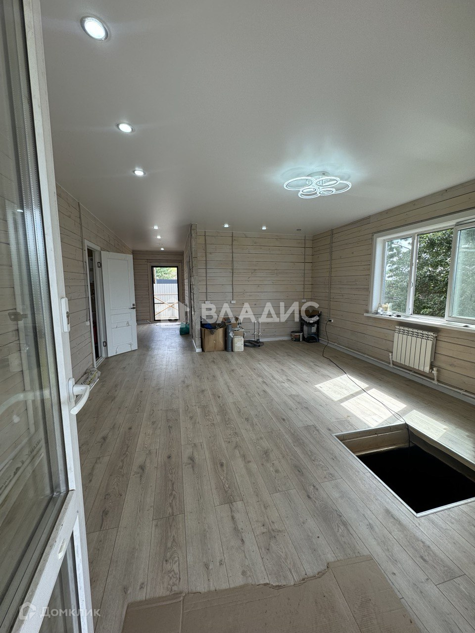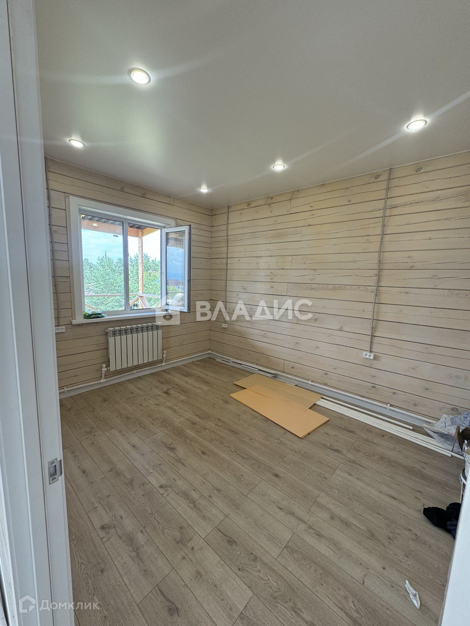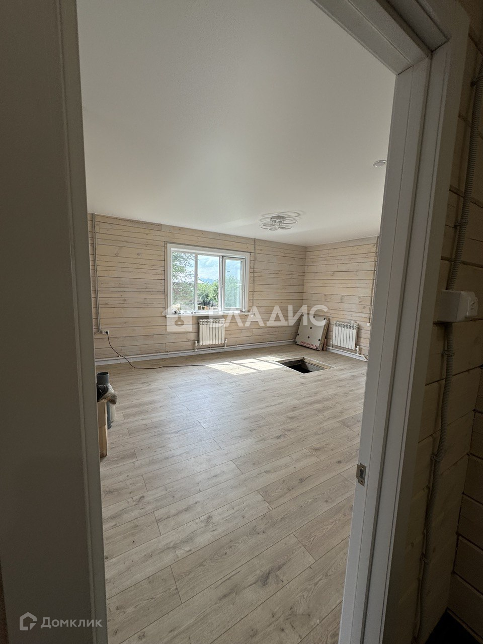 Утепленный пол 200 мм, черновой пол, фанера, ламинат 33 класса. Стены покрыты антисептиком с колером.