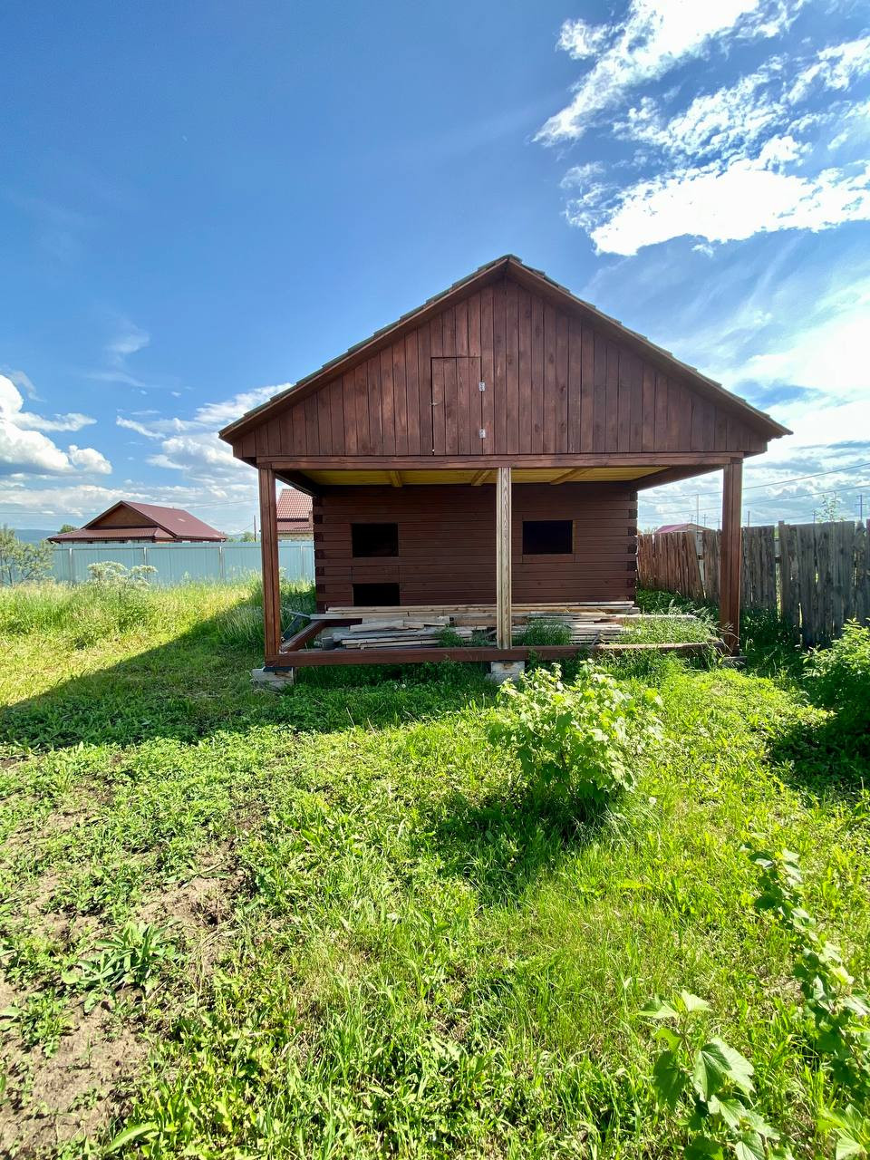 Первый дом имеет две комнаты по 18 квадратных метров, и террасу 18 квадратных метров. Строительство дома начато в 2021г. при использовании брус зимний шлифованный.