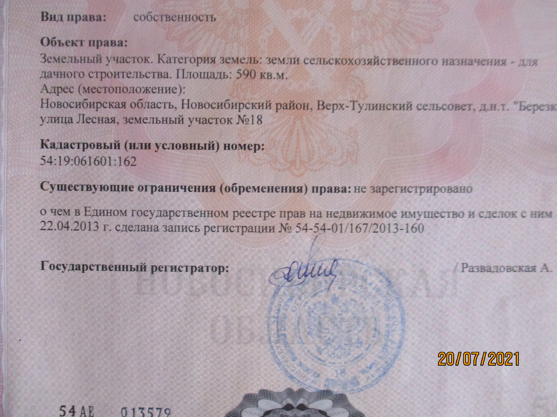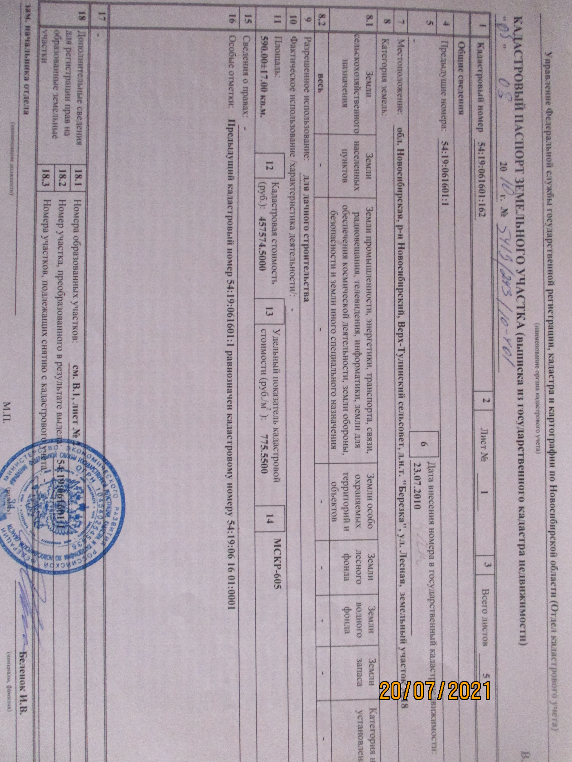 ИЖС, назначение: земли сельскохозяйственного назначения. Участок ровный, квадратной формы, 30 * 30 м, расположен посредине общества по ул. Лесная. 21 км, Ордынской трассы, + 3 км, по асфальтированной дороге, чуть дальше посёлка Крупской. До поселка ходит маршрутное такси от м. Студенческая.