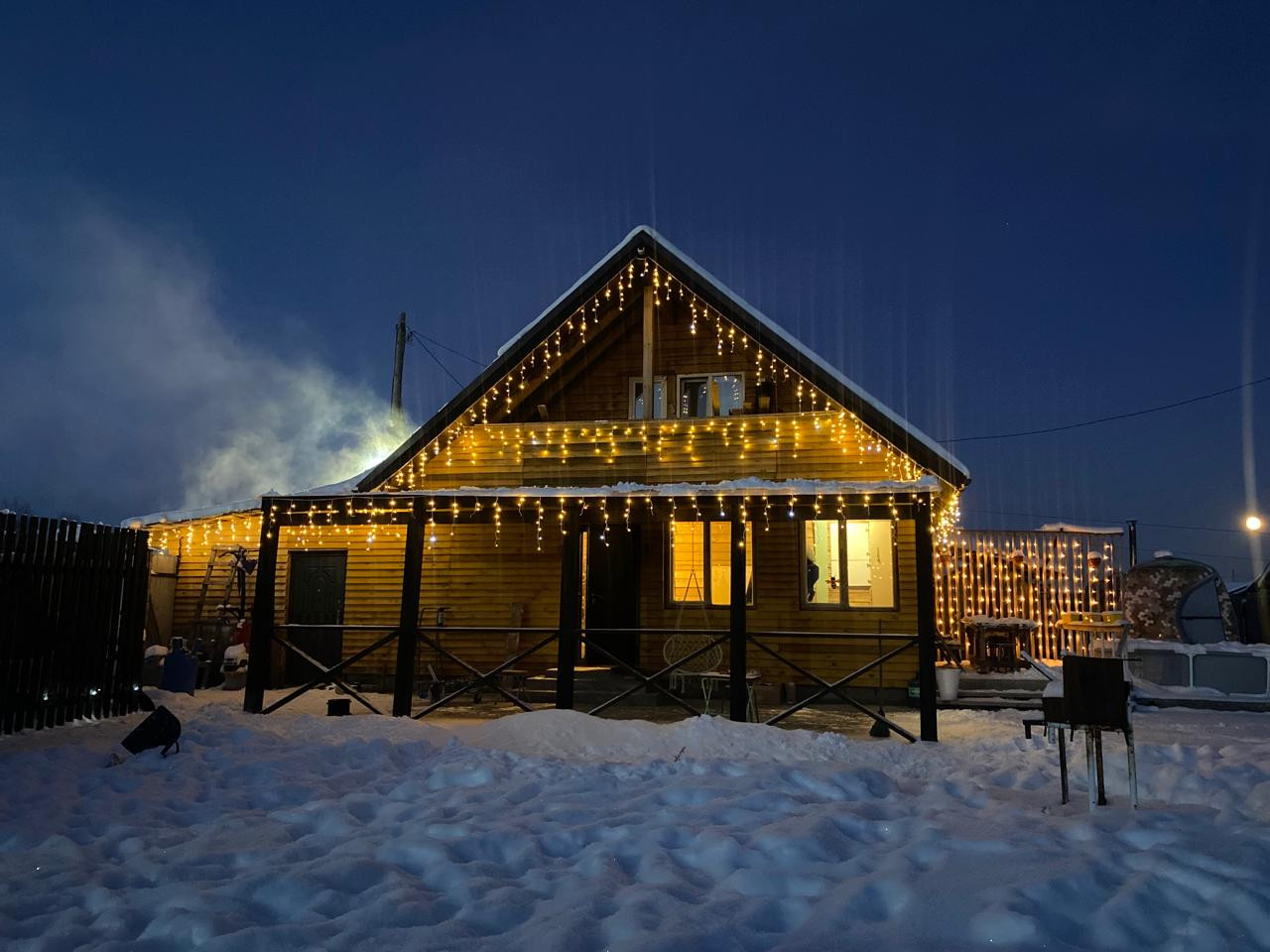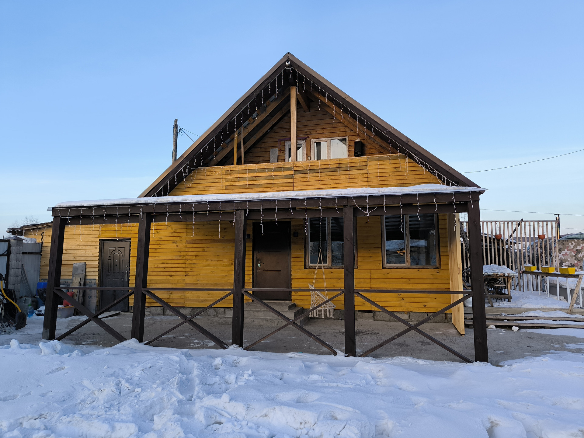 Есть современная зона барбекю, огромная детская площадка с постройками.