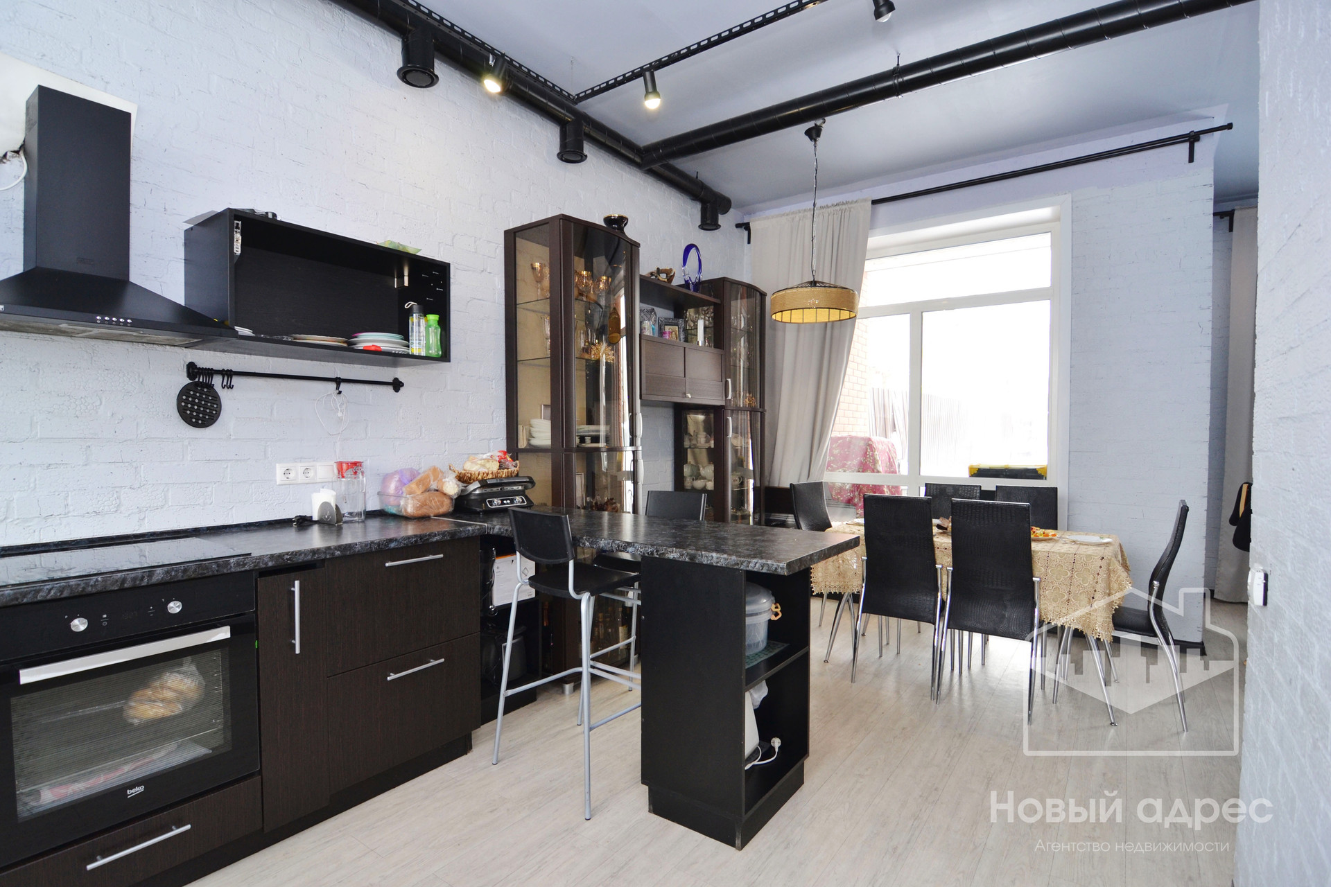 При продаже остается кухонный гарнитур, бытовая техника, мебель.
