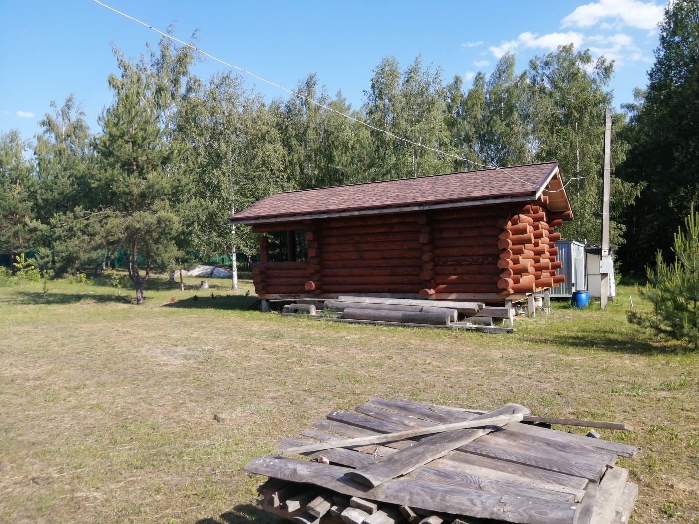 Баня одноэтажная, общей площадью 45 кв.м. по осям бревен с учетом террасы, размером 6х7.5 м. Построена в апреле 2021 г.  Бревно, зимней рубки из северного леса, диаметром 280 мм. Фундамент: ж/б сваи 150х150х3000 мм. Все проделанные работы и отделка идентичны дому и описаны выше. Баня готова к чистовой отделке.