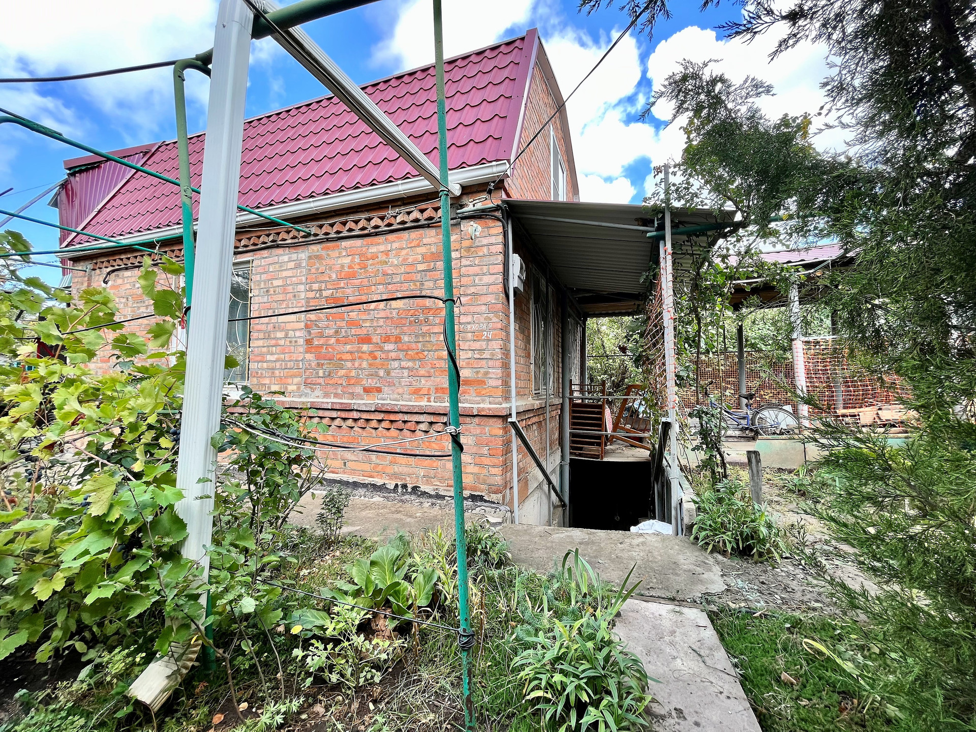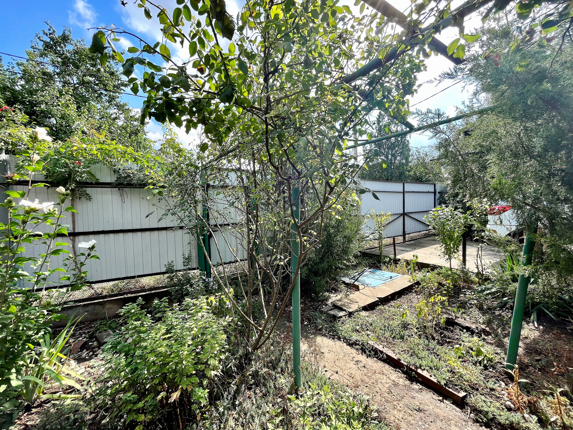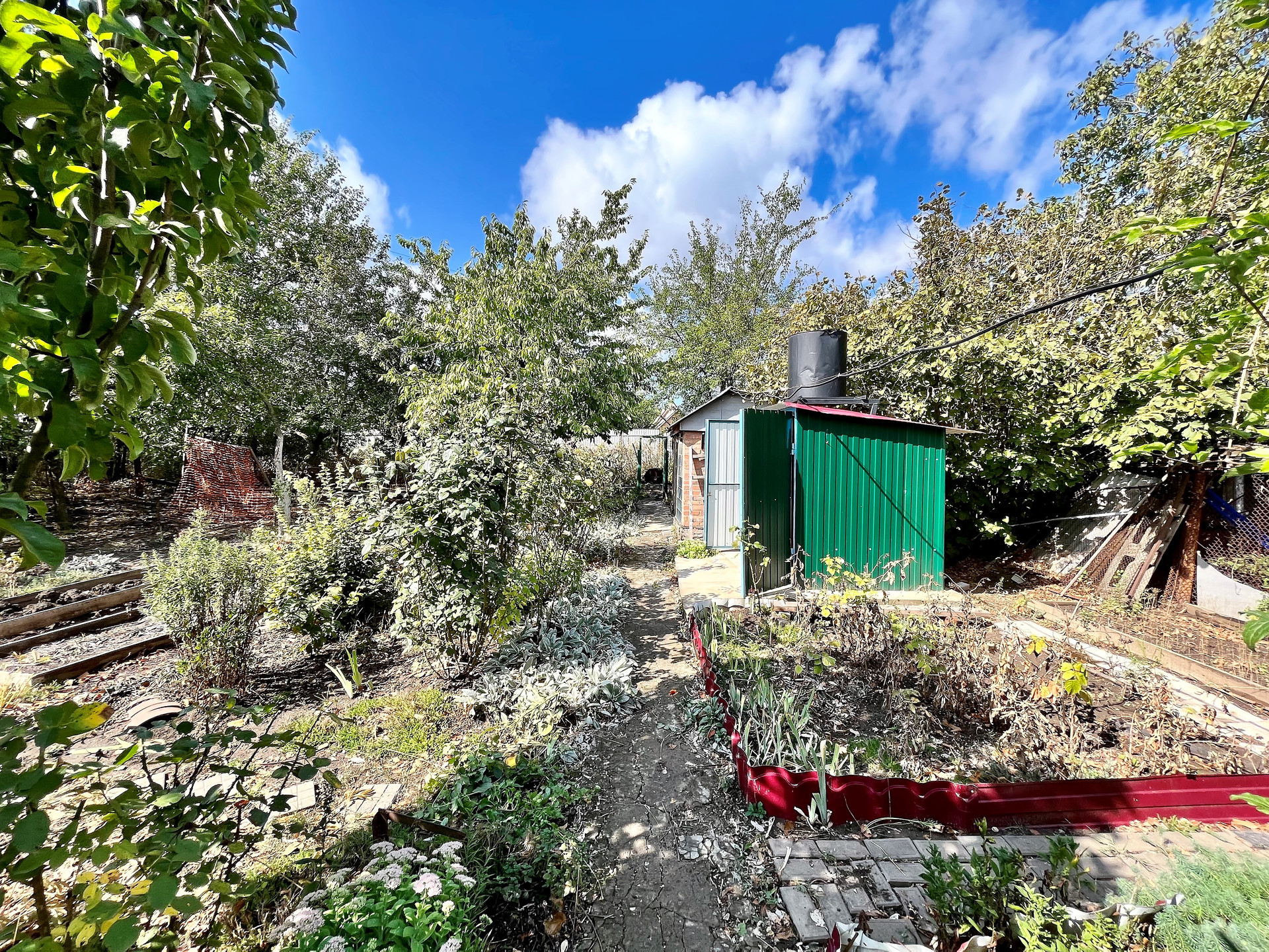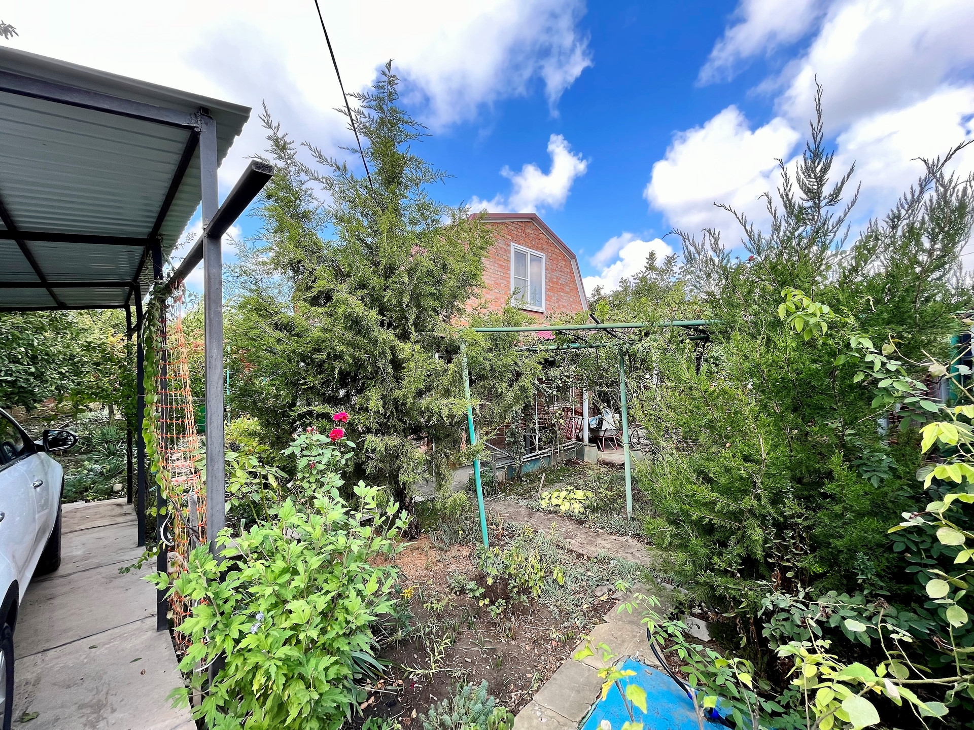 - Полноценный плодоносящий сад с обилием фруктов и ягод, в котором растут вишня, яблоня, тютина, калина, малина, клубника, виноград, а также цветы и туи .