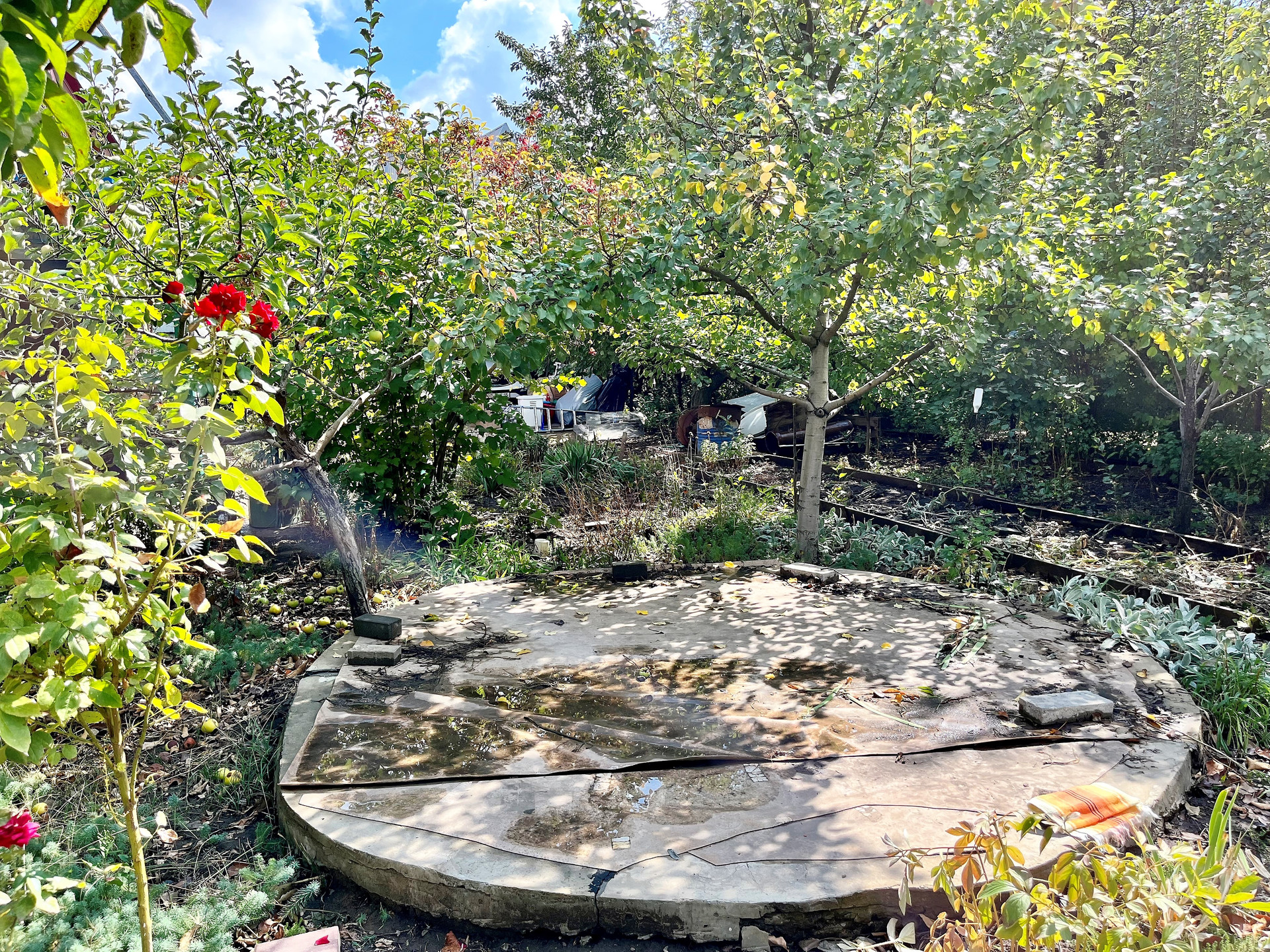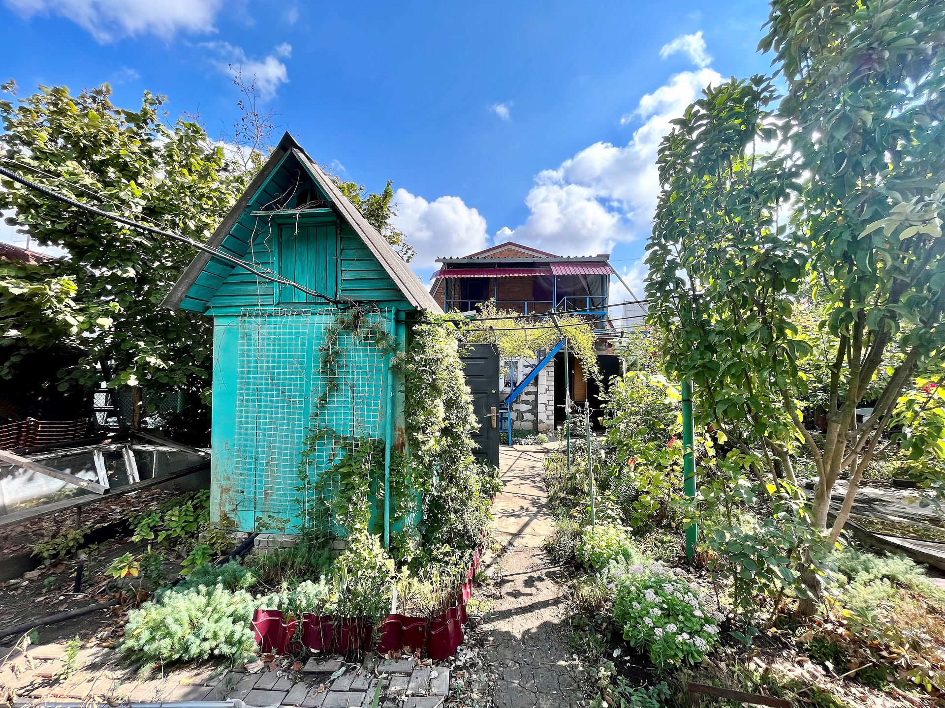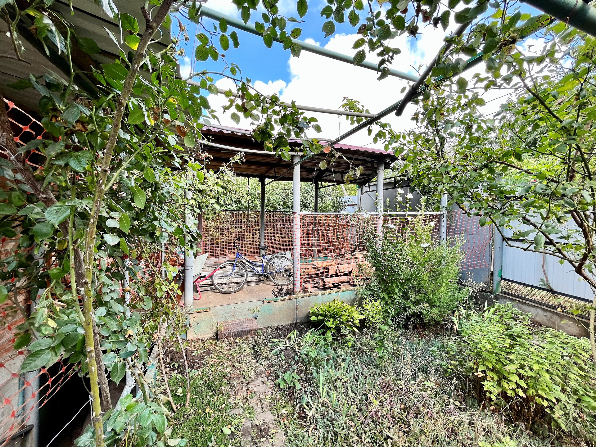 - Полноценный плодоносящий сад с обилием фруктов и ягод, в котором растут вишня, яблоня, тютина, калина, малина, клубника, виноград, а также цветы и туи .