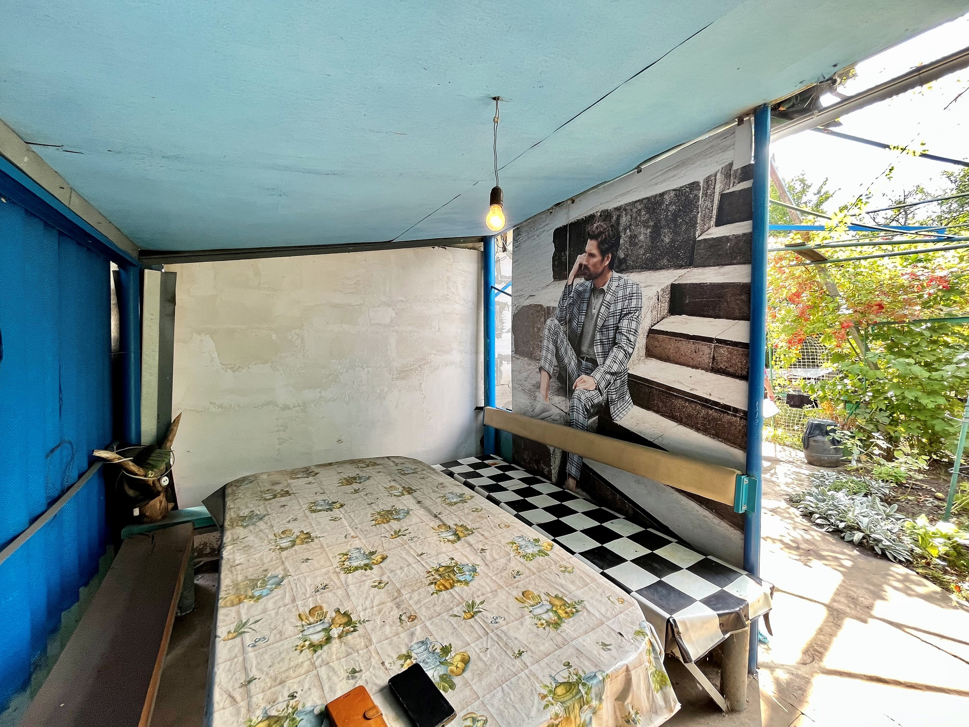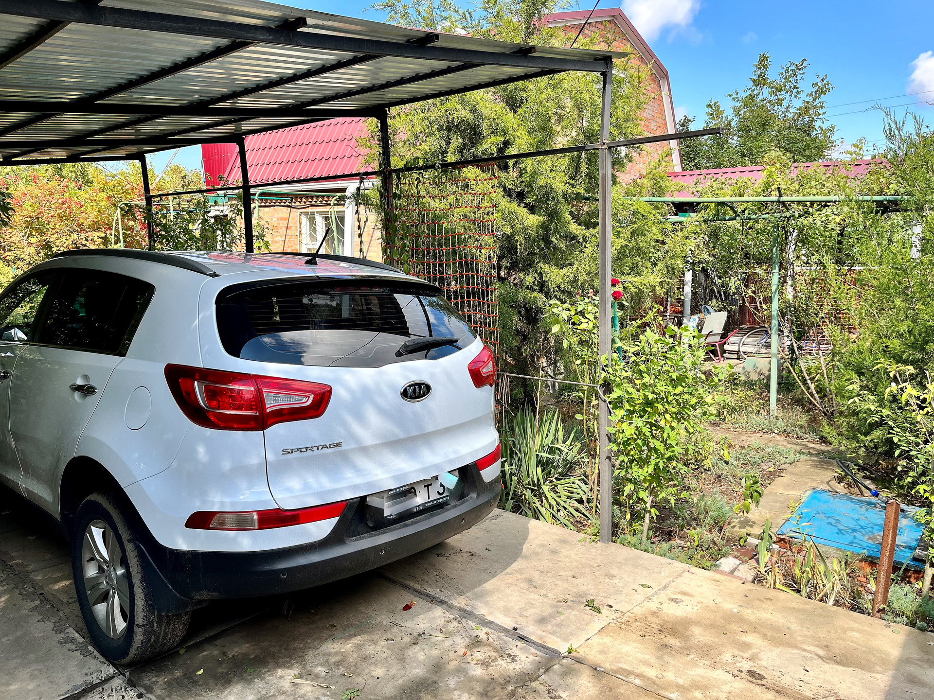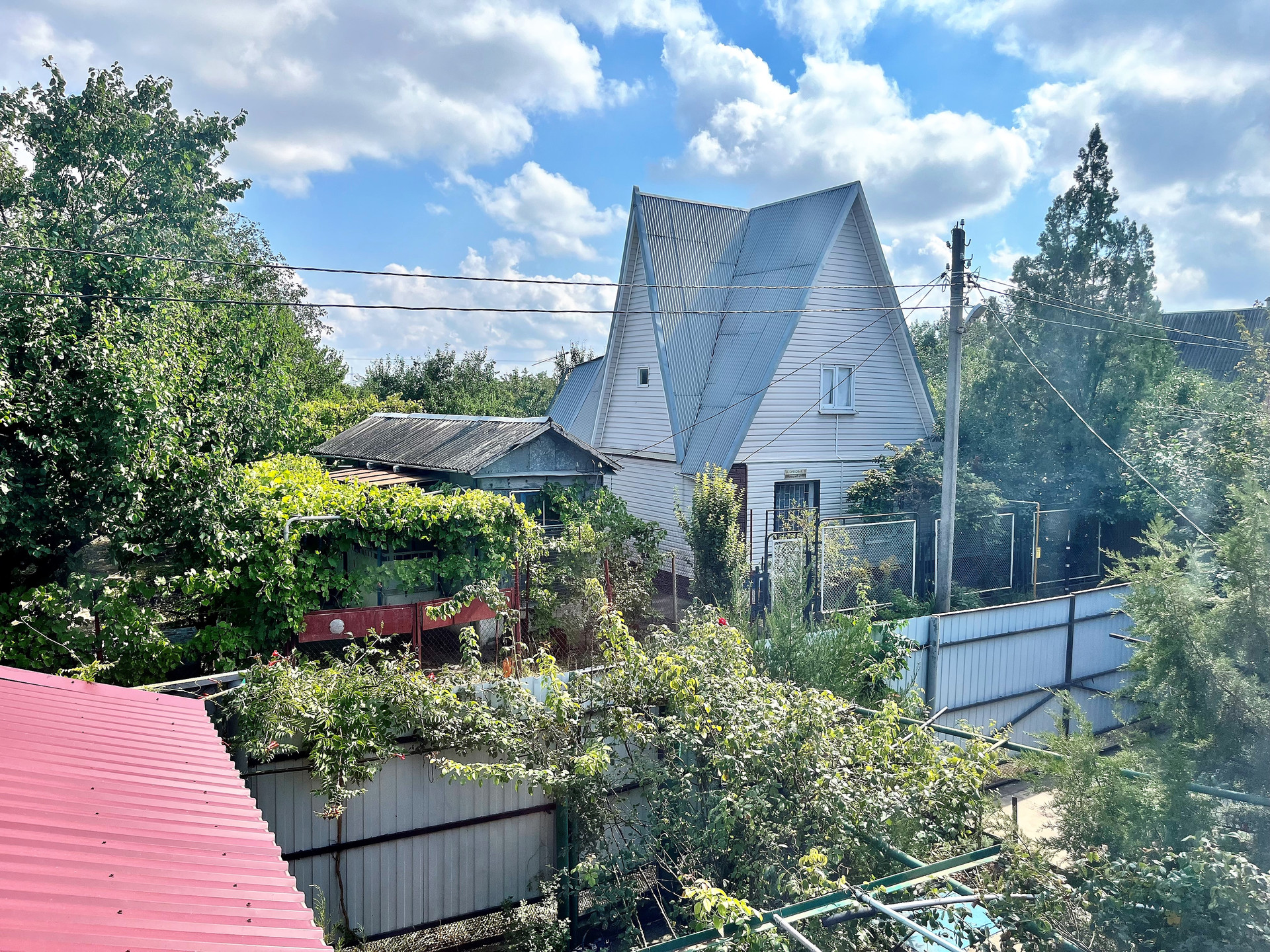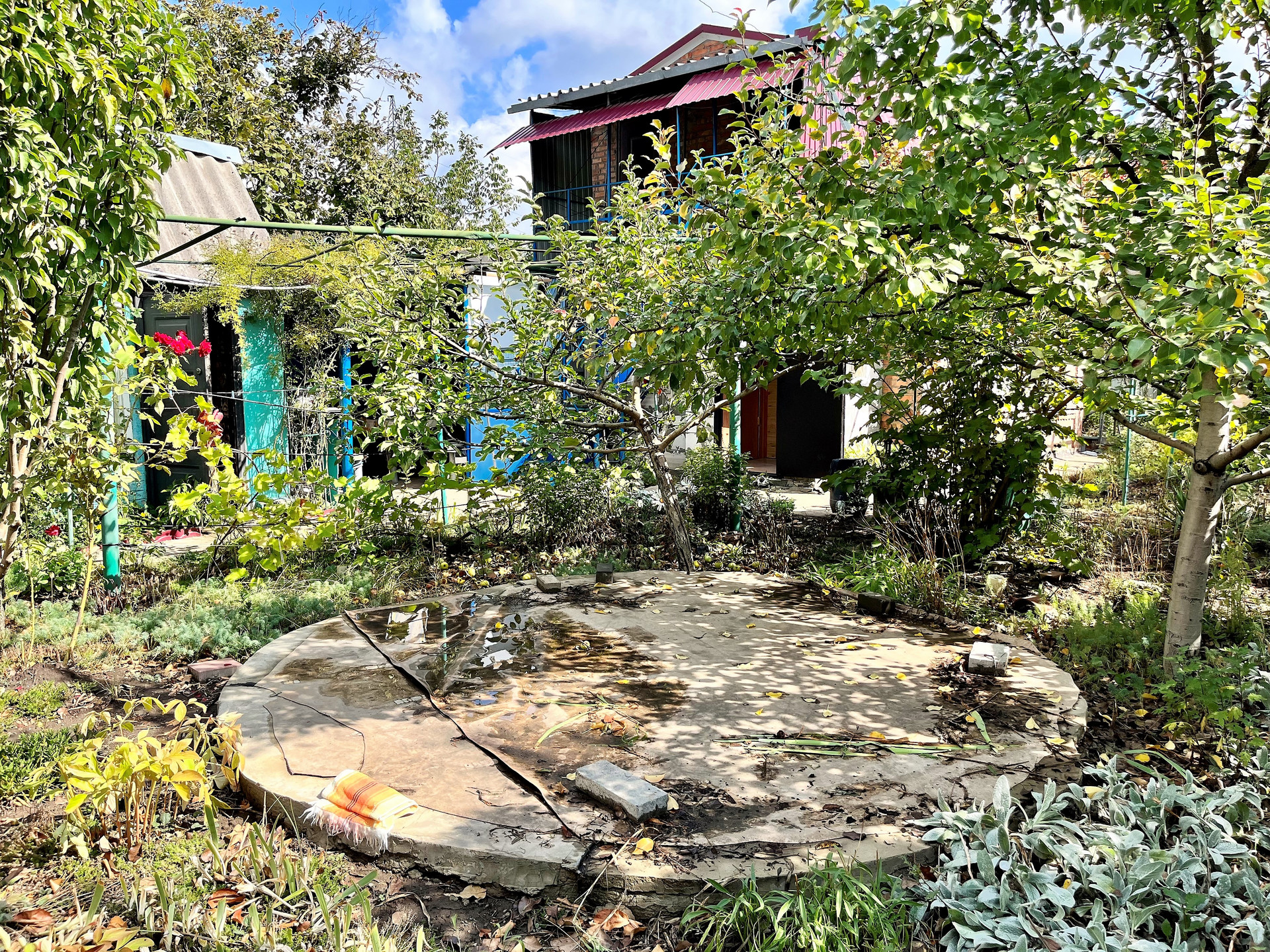 - Полноценный плодоносящий сад с обилием фруктов и ягод, в котором растут вишня, яблоня, тютина, калина, малина, клубника, виноград, а также цветы и туи .