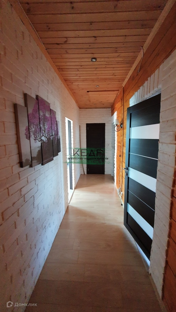 Дом построен из бруса, на ленточном фунаменте, утеплен. На первом этаже расположены кухня-гостиная (40м2), просторная ванная комната (18м2), прихожая с гардеробной (14 м2), утепленная веранда (10 м2) с выходом в теплый гараж. Из гостиной есть выход на террасу (в данный момент достраивается). На втором этаже 3 спальни по 18 м2, одна из них с внушительным балконом (10 м2), сан.узел (2 м2).