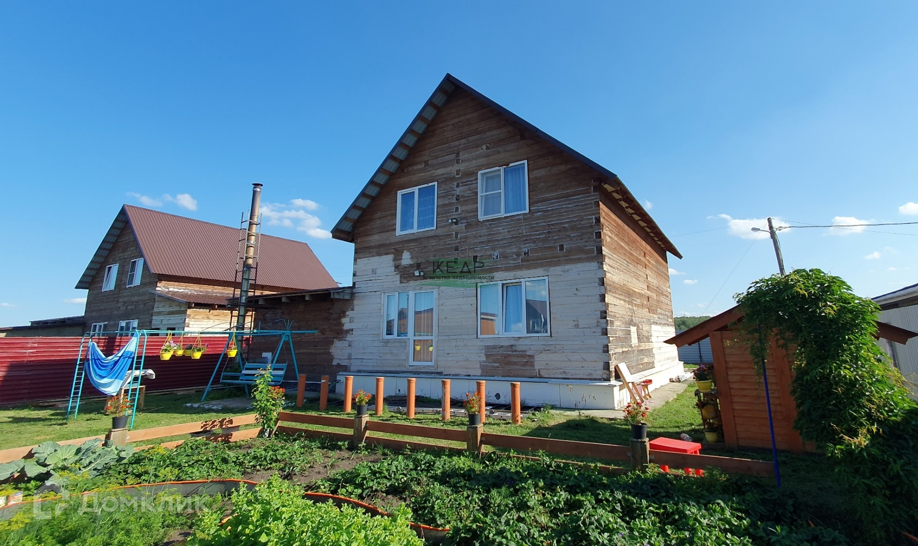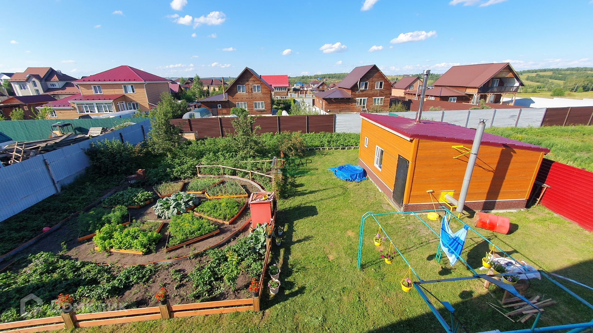 Участок полностью огорожен забором из профлиста. Территория облагорожена, гармонично сочетает в себе зону отдыха и огородничества. Есть детская площадка.