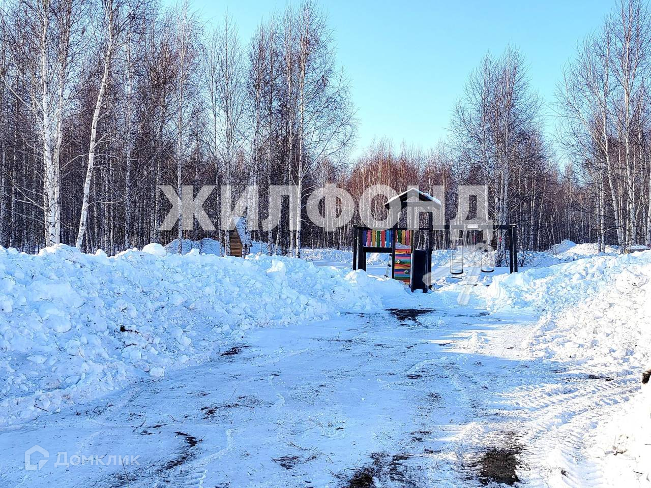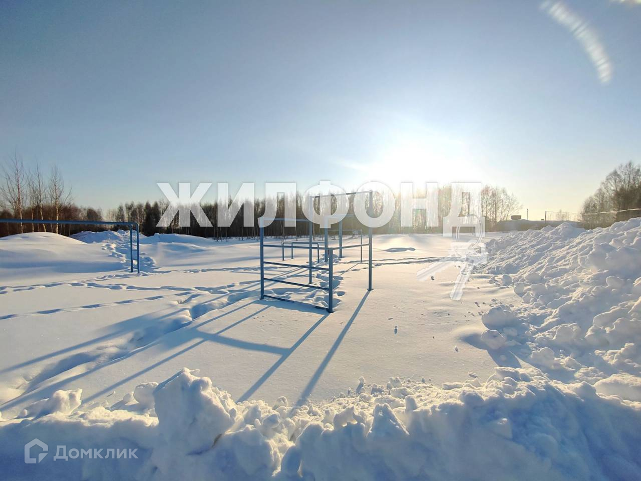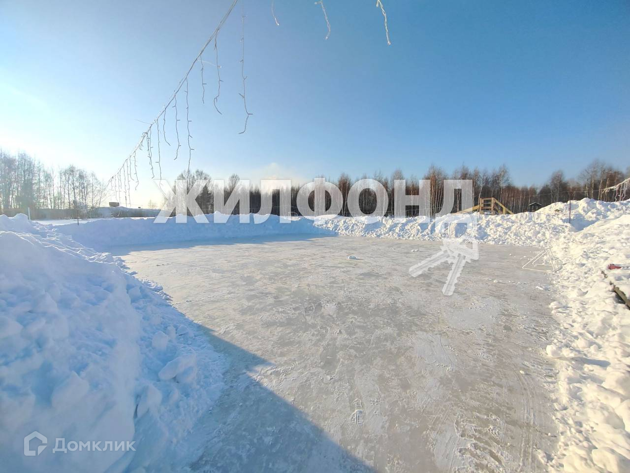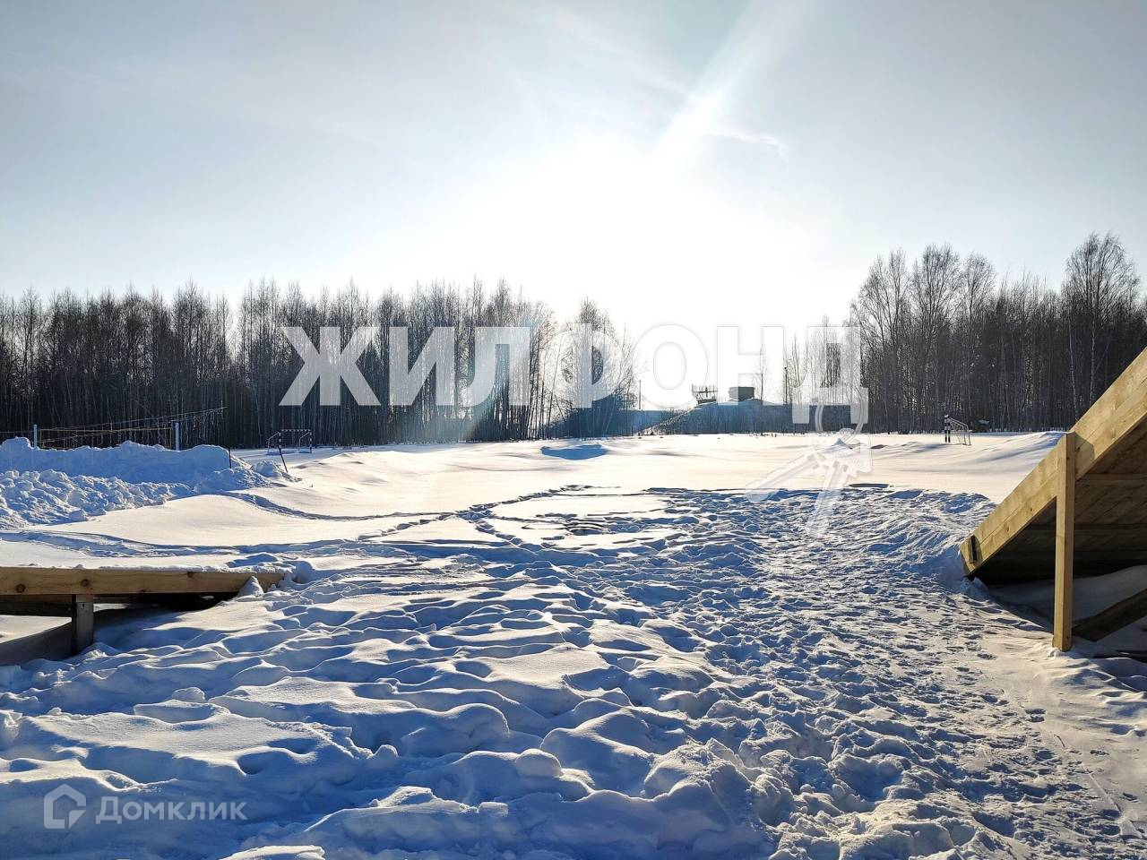 Большая детская площадка с футбольным и волейбольным полем, залитым катком, детскими сооружениями.