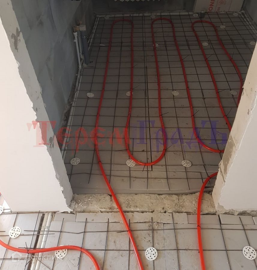 * Пол – водяной теплый, выполнена полусухая стяжка по маякам (под ламинат/линолеум), финишная затирка пола под «вертолёт»