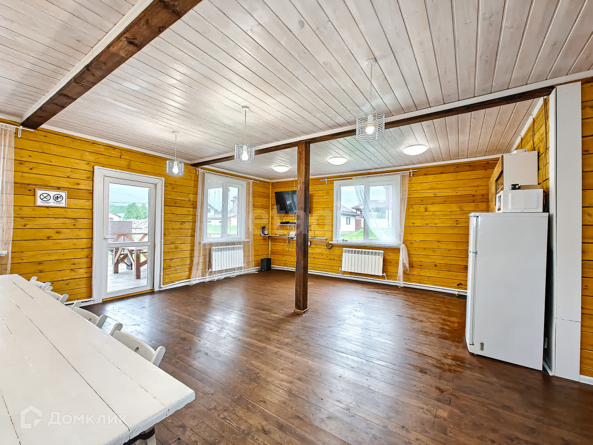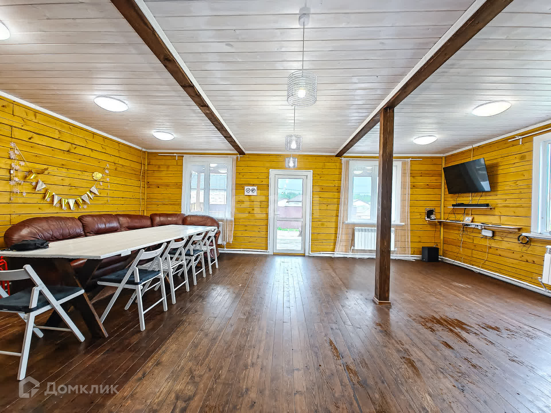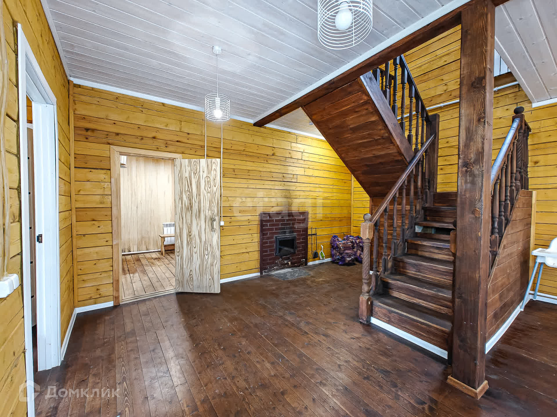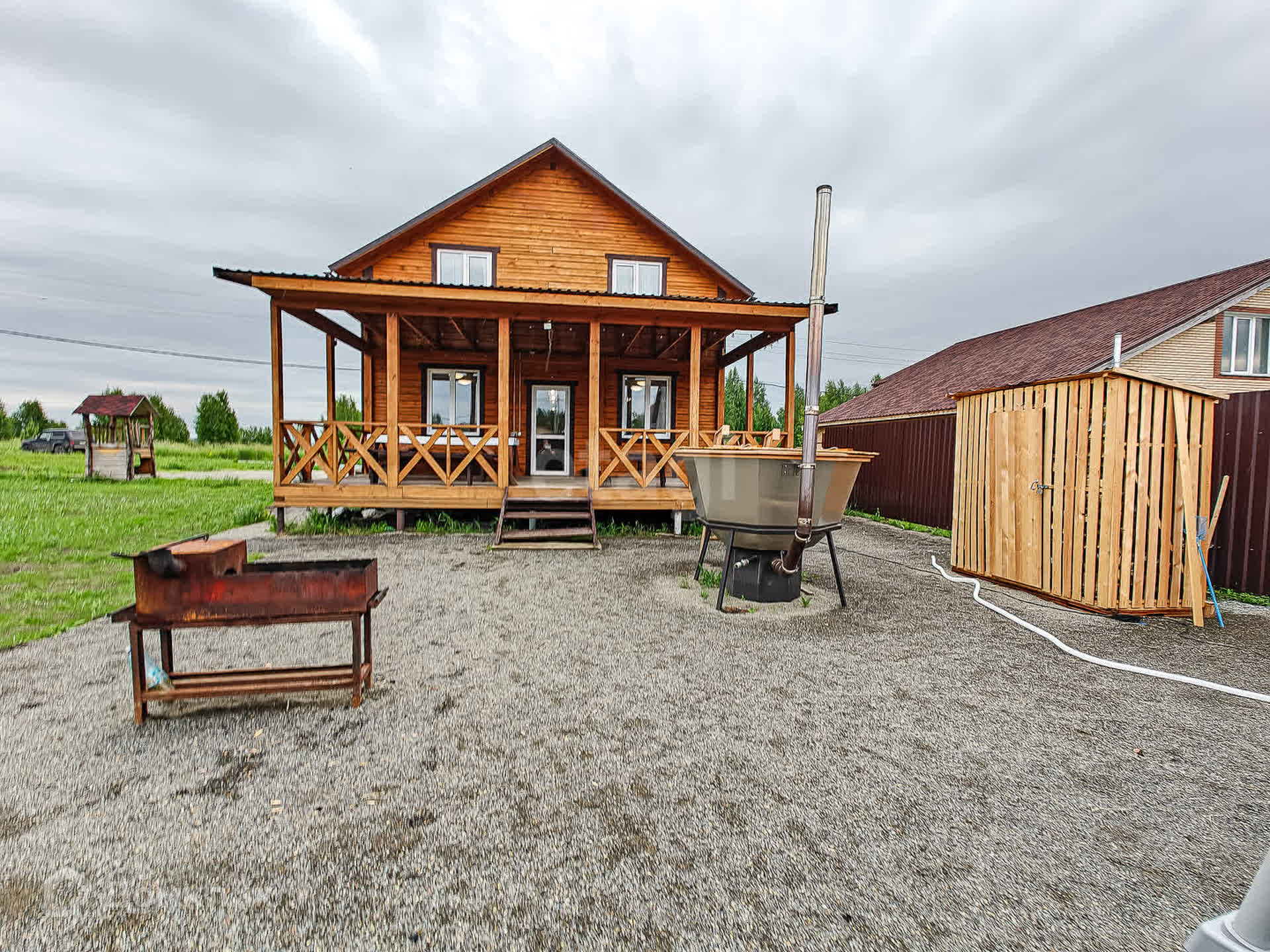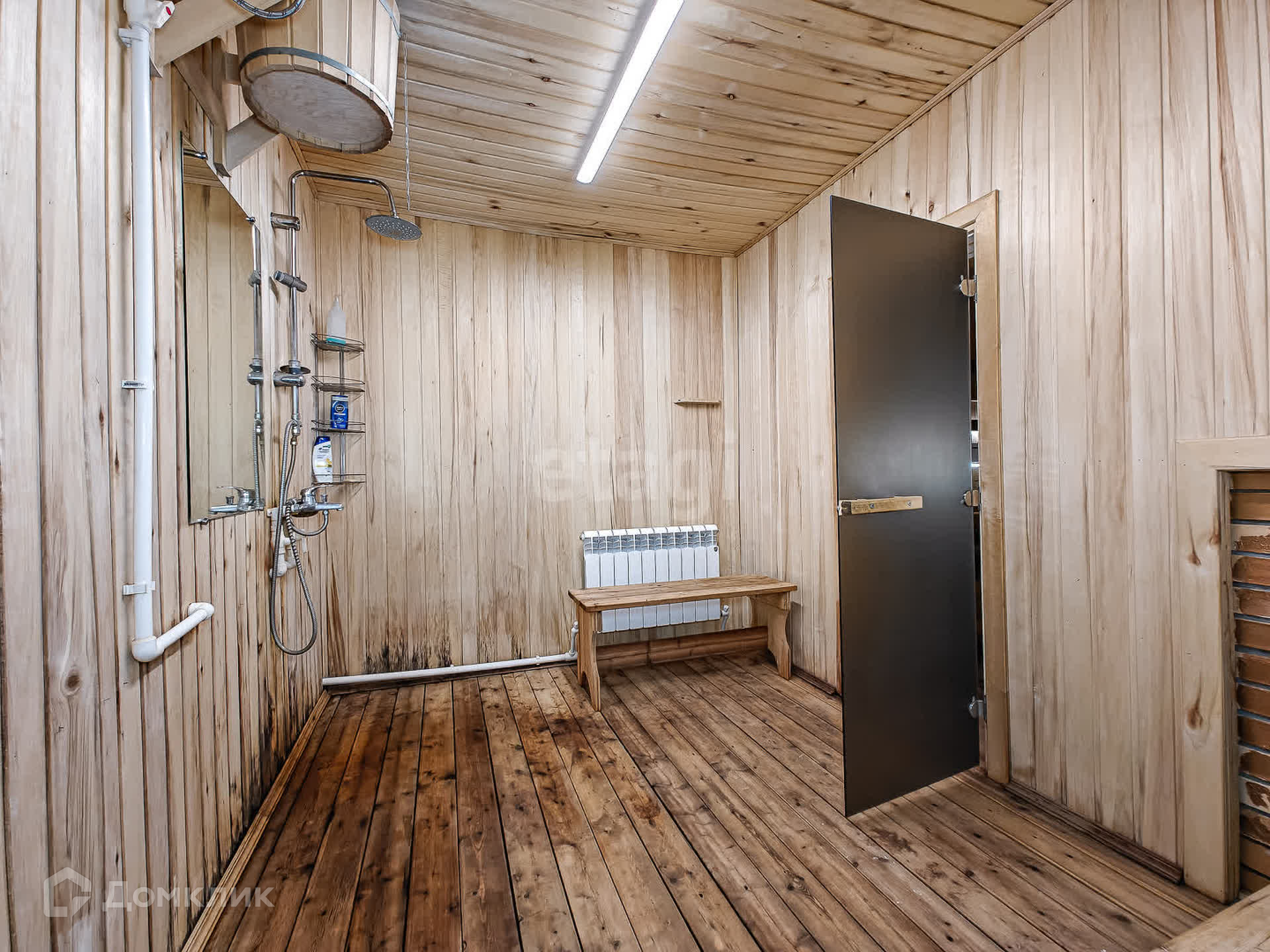 Первый этаж в доме - котельная, с/узел, большая кухня-гостиная и баня с большим предбанником. Из гостиной - выход на просторную террасу.