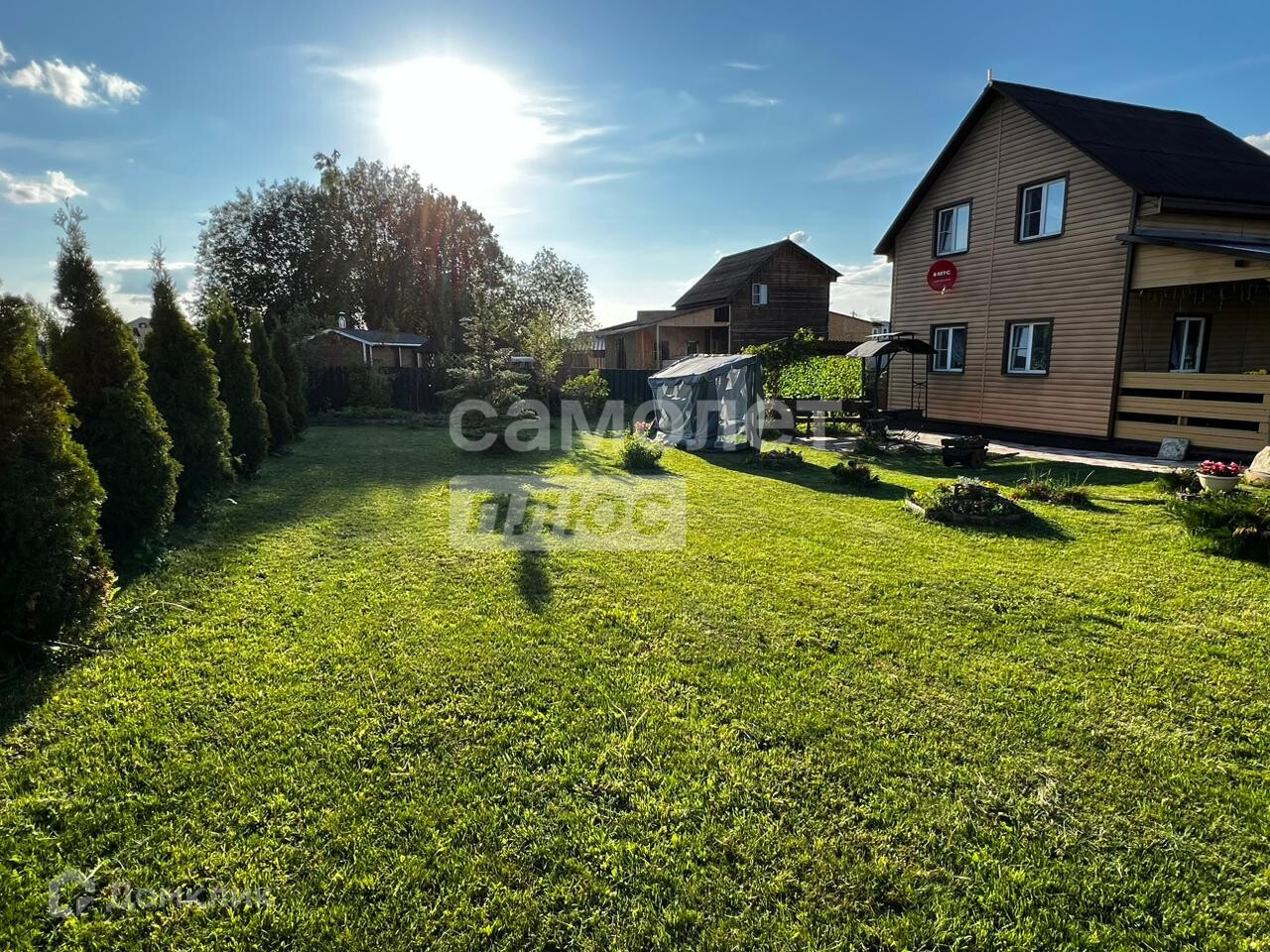 Земельный участок: Участок: 7,5 соток. Ровный, прямоугольной формы. Проведен ландшафтный дизайн. По периметру высажены туи. Красивый ухоженный газон. Имеется большое количество хвойных насаждений, плодовых кустов.