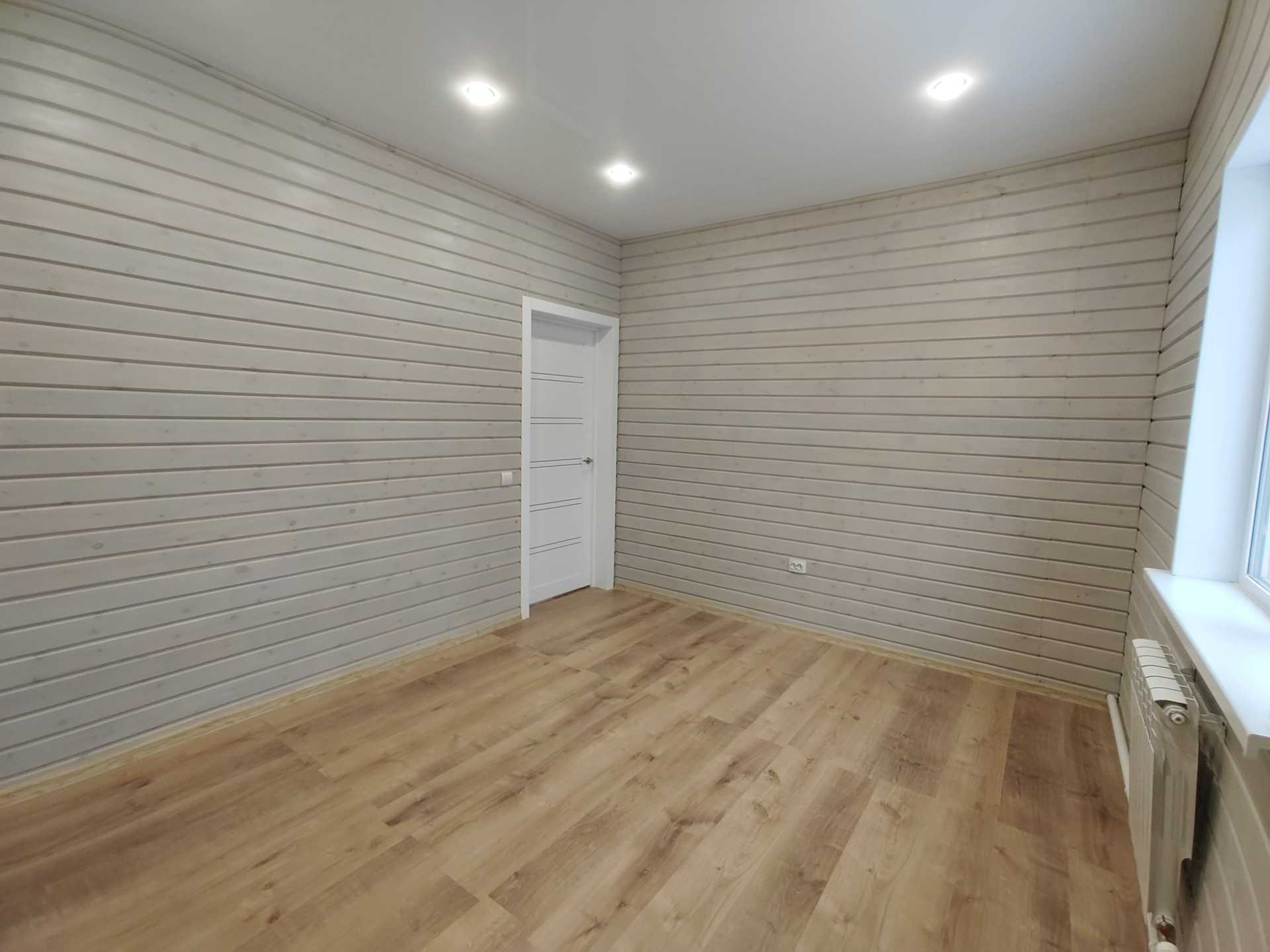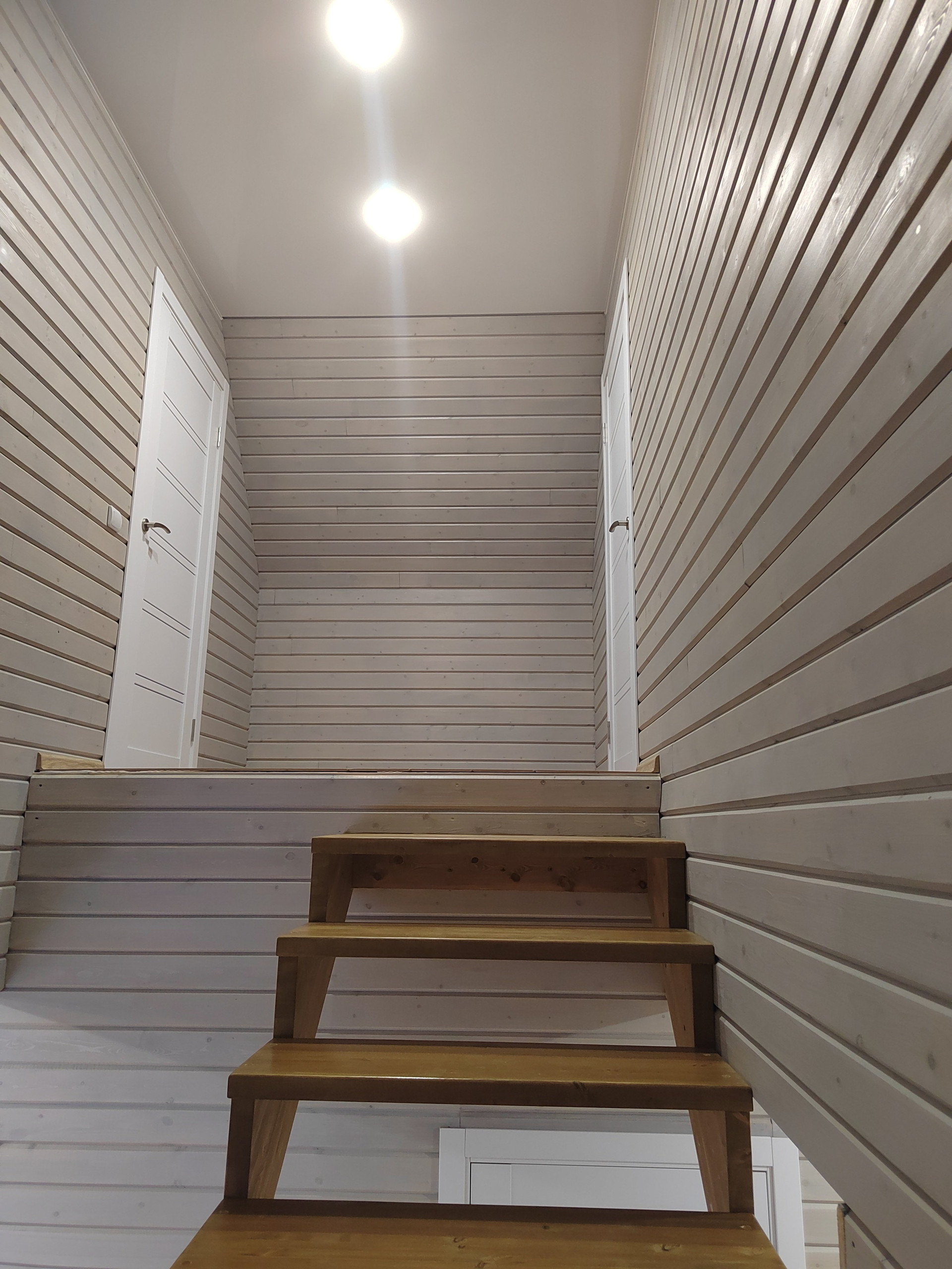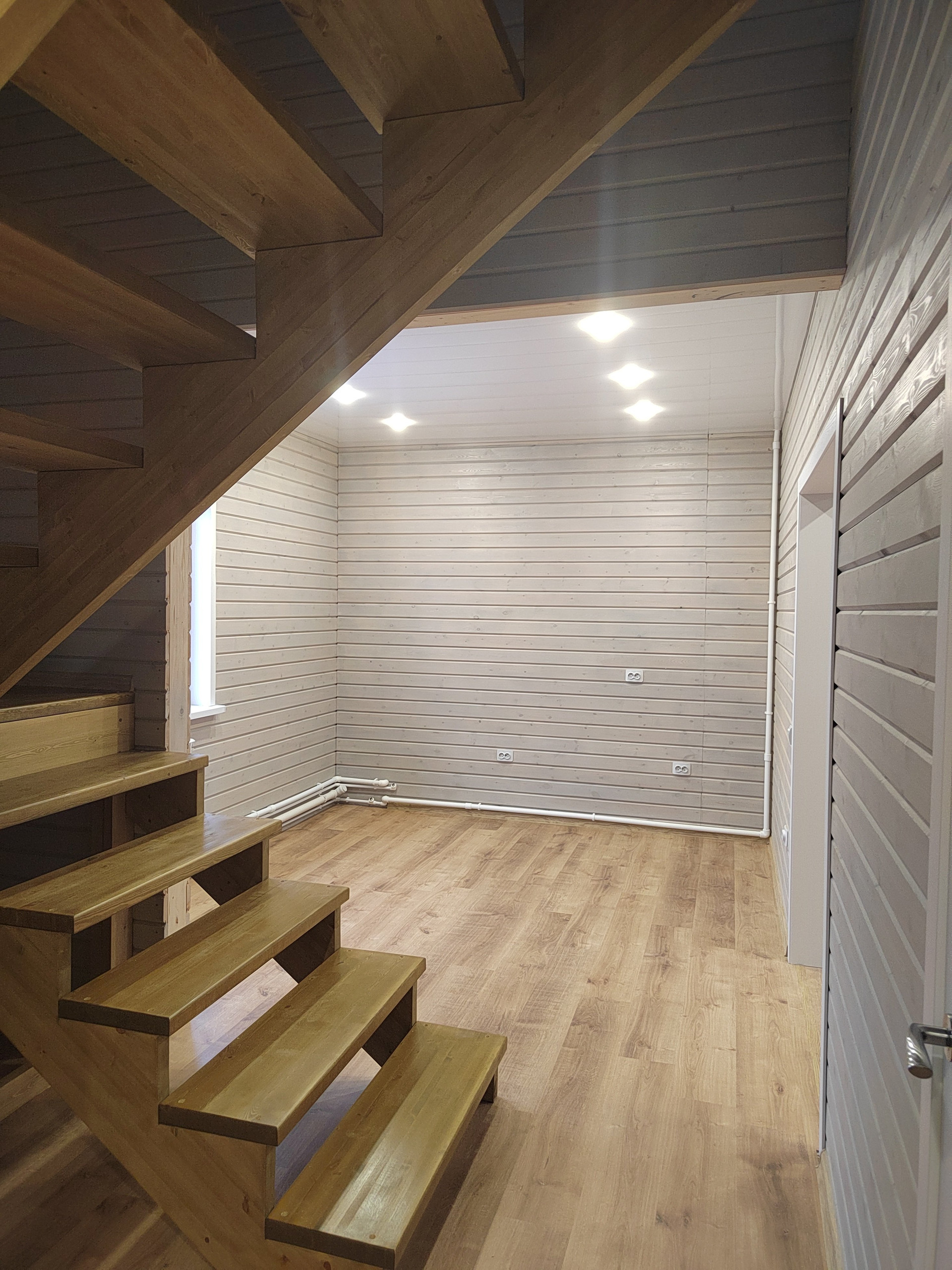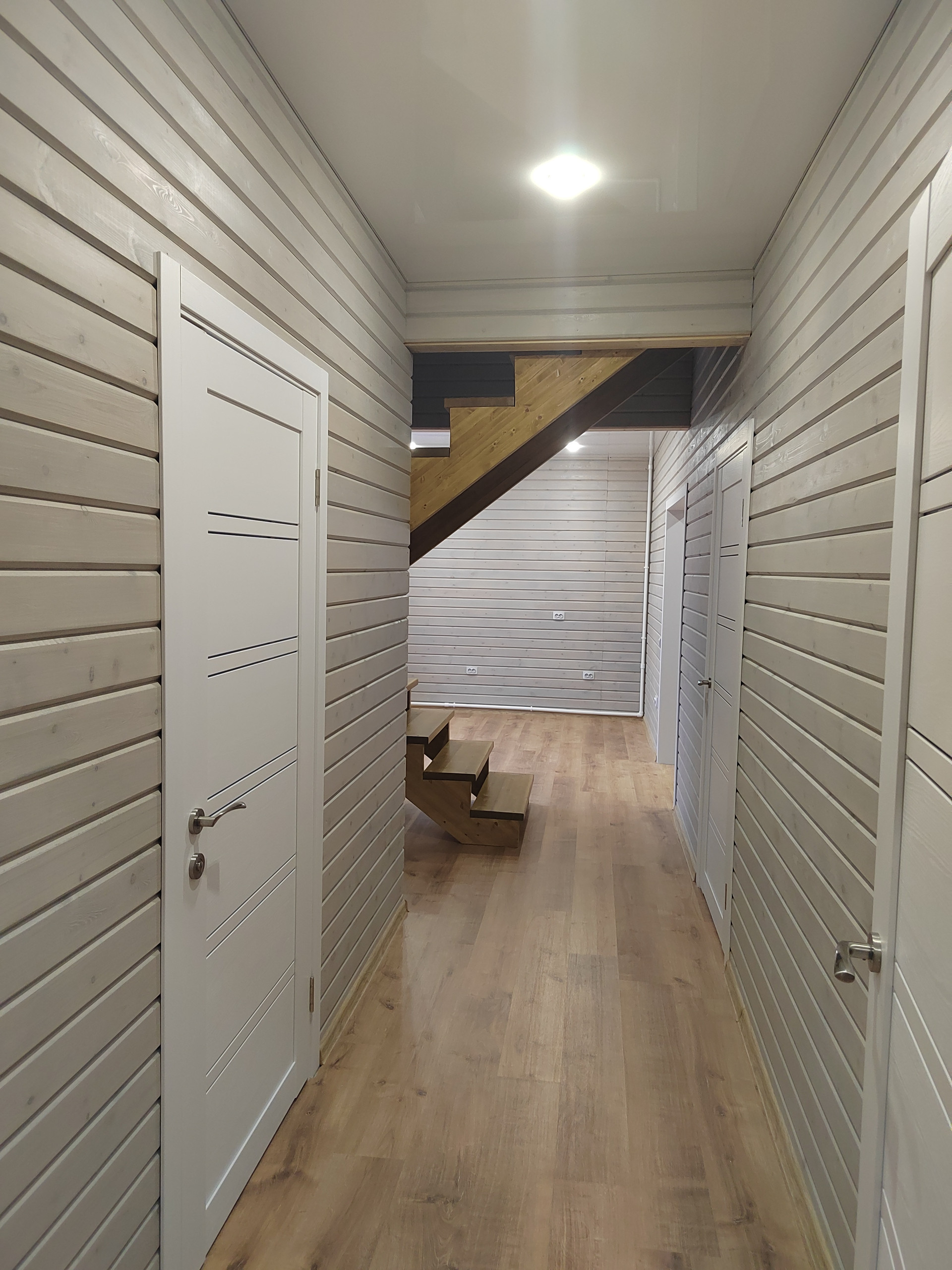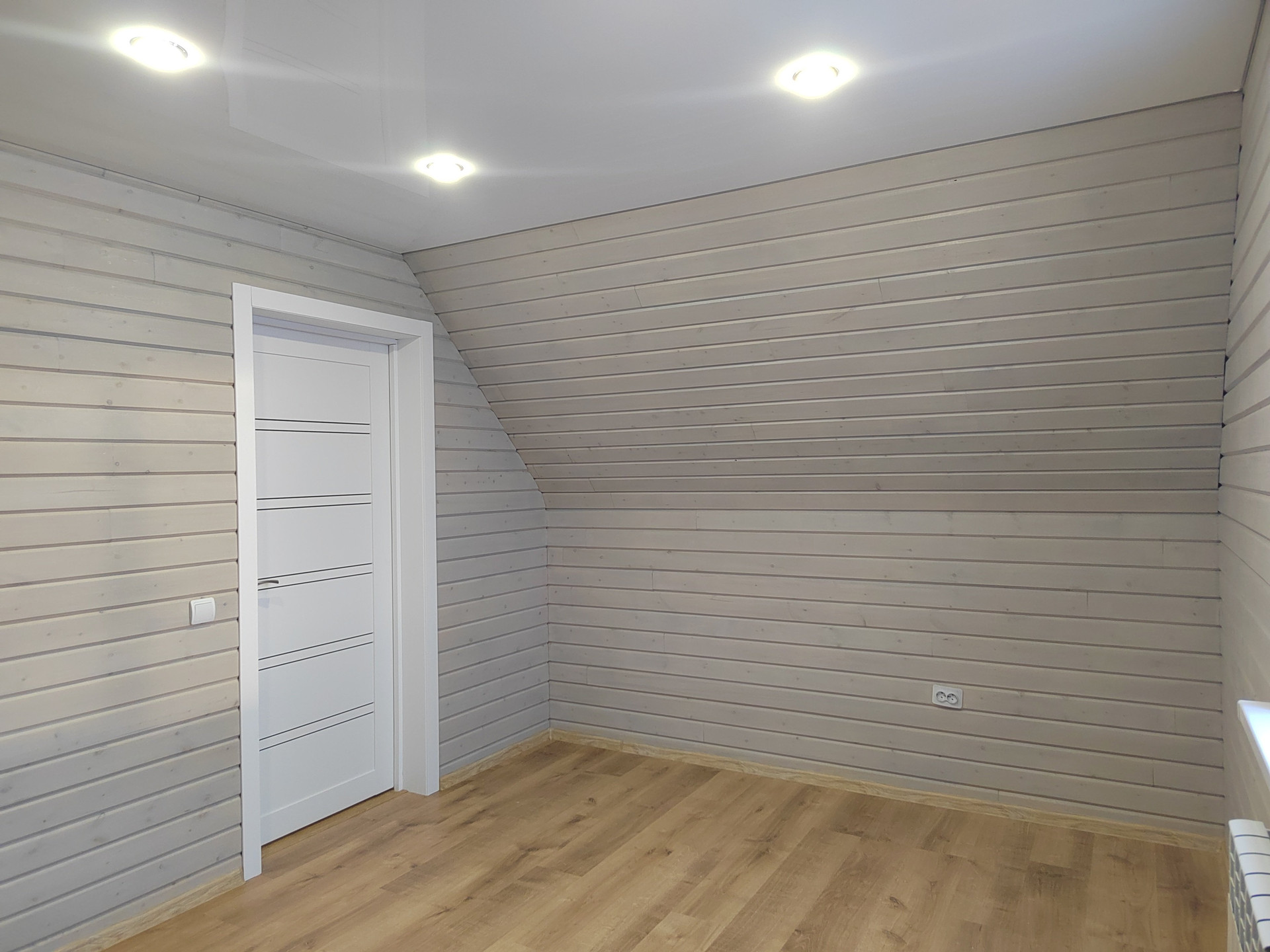 Второй этаж: две спальни. Стены -дерево с имитацией бруса , пол- ламинат. Потолок натяжной с современными точечными светильниками.