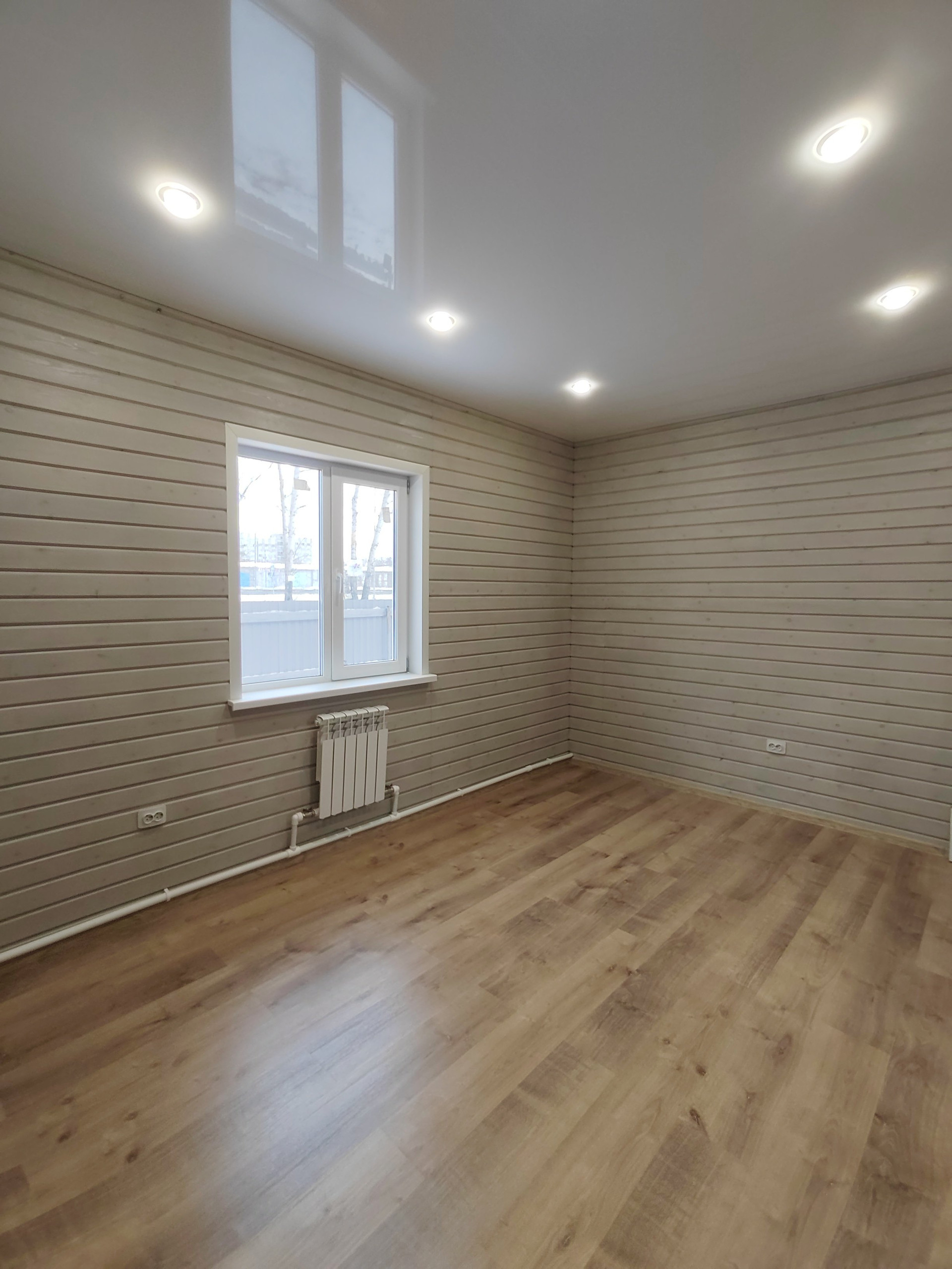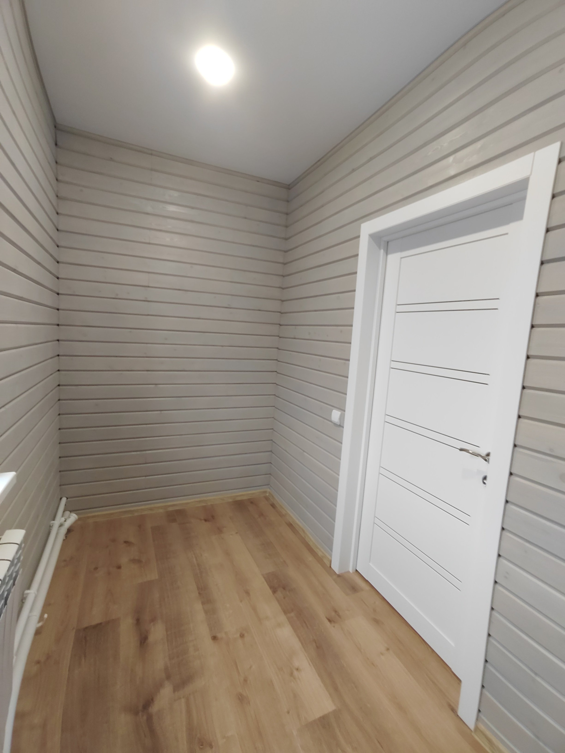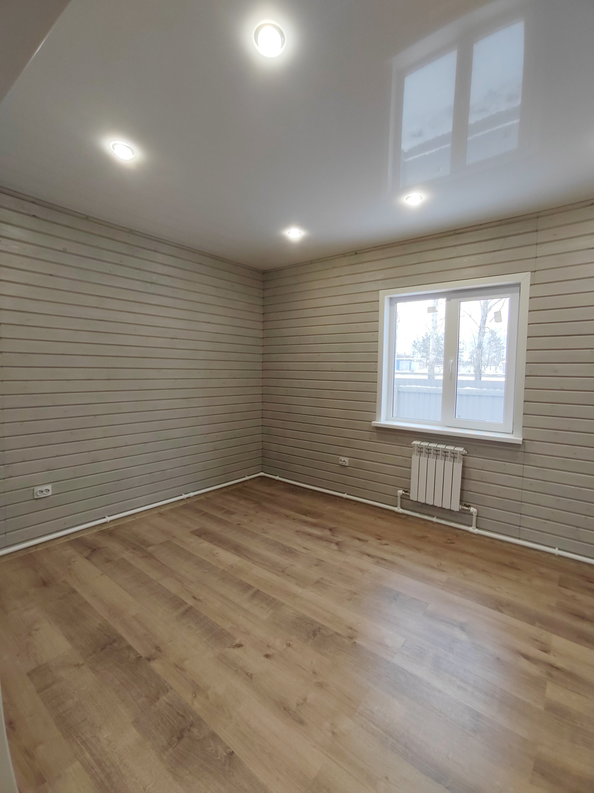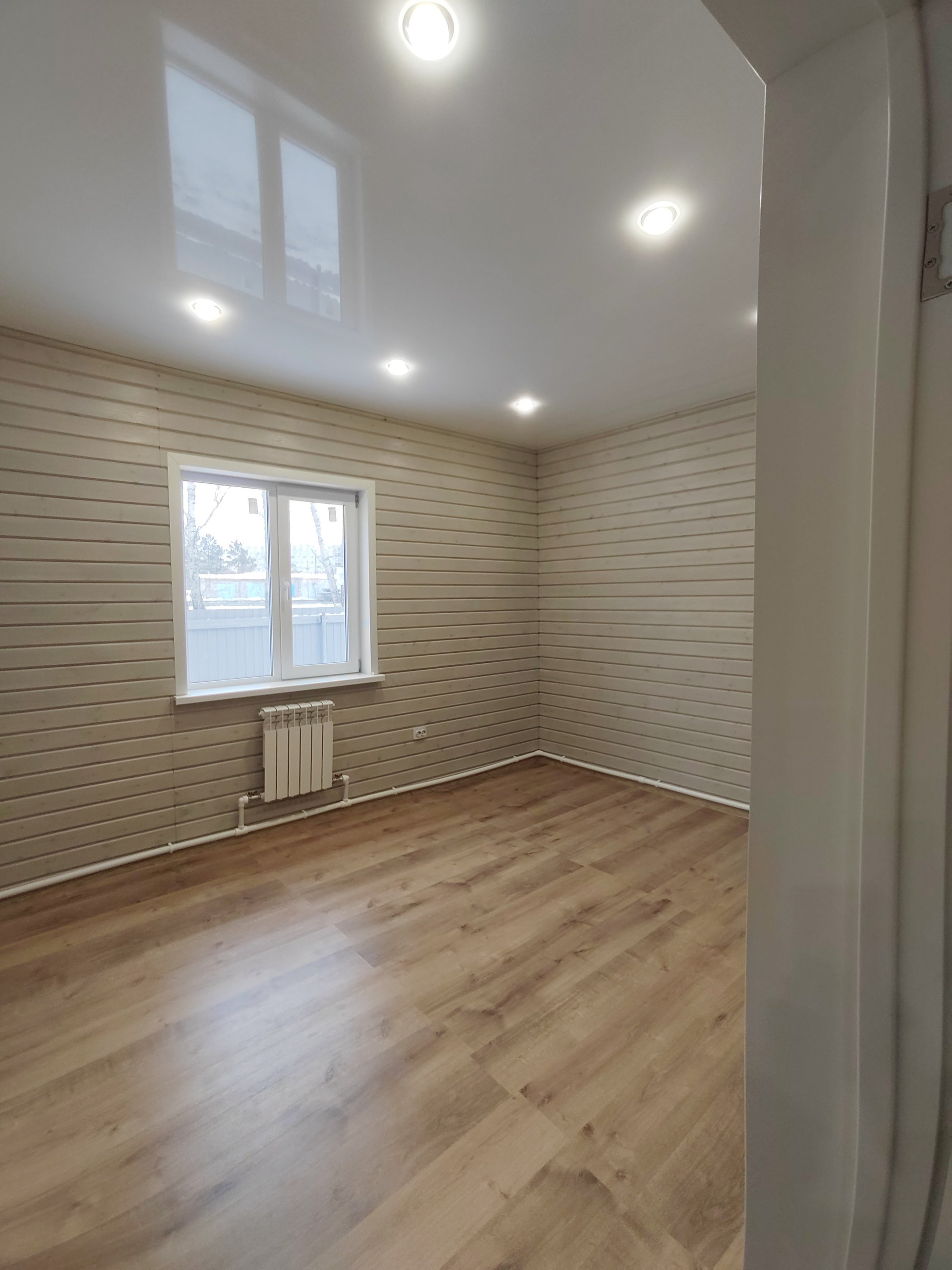 Второй этаж: две спальни. Стены -дерево с имитацией бруса , пол- ламинат. Потолок натяжной с современными точечными светильниками.