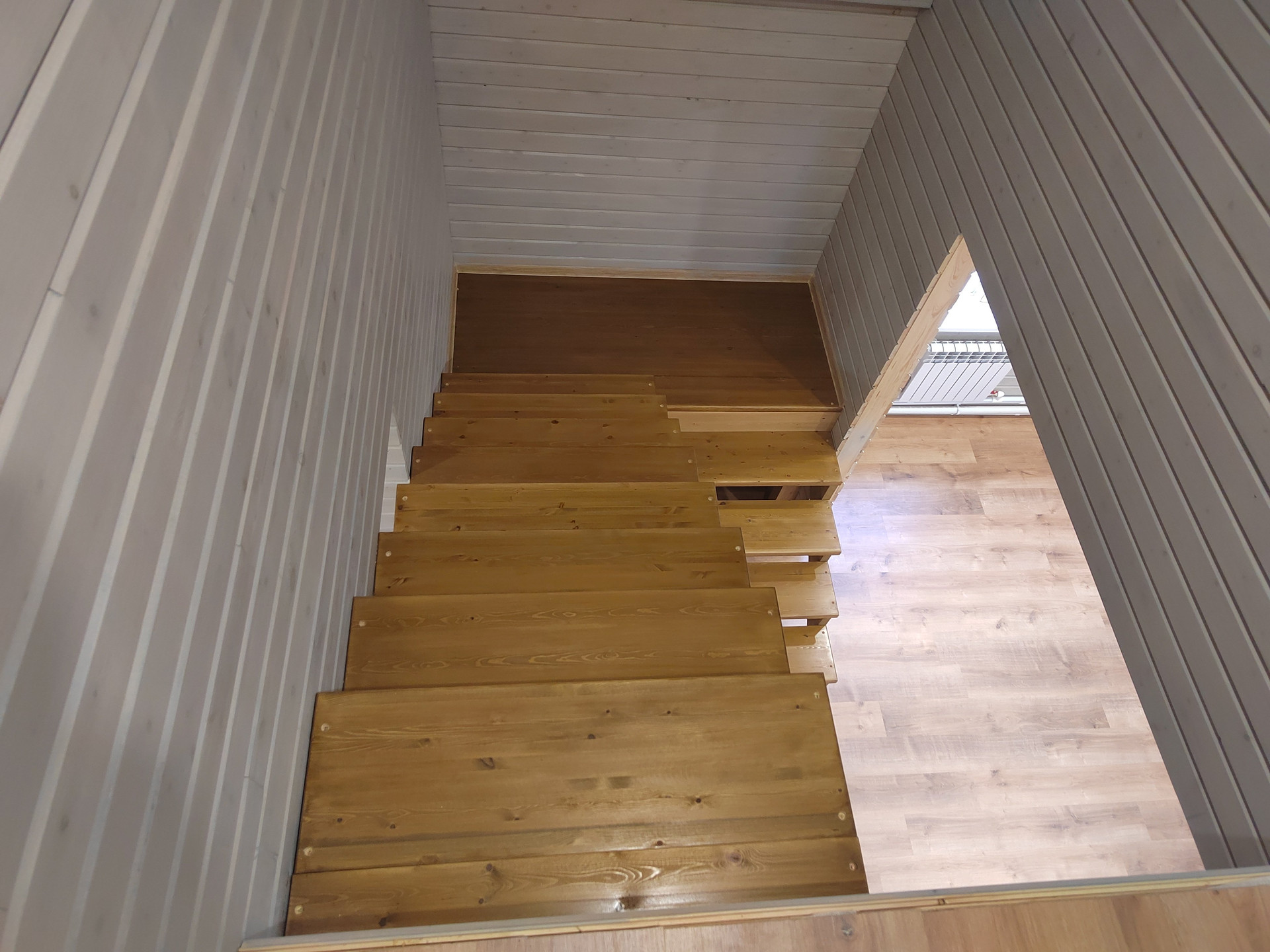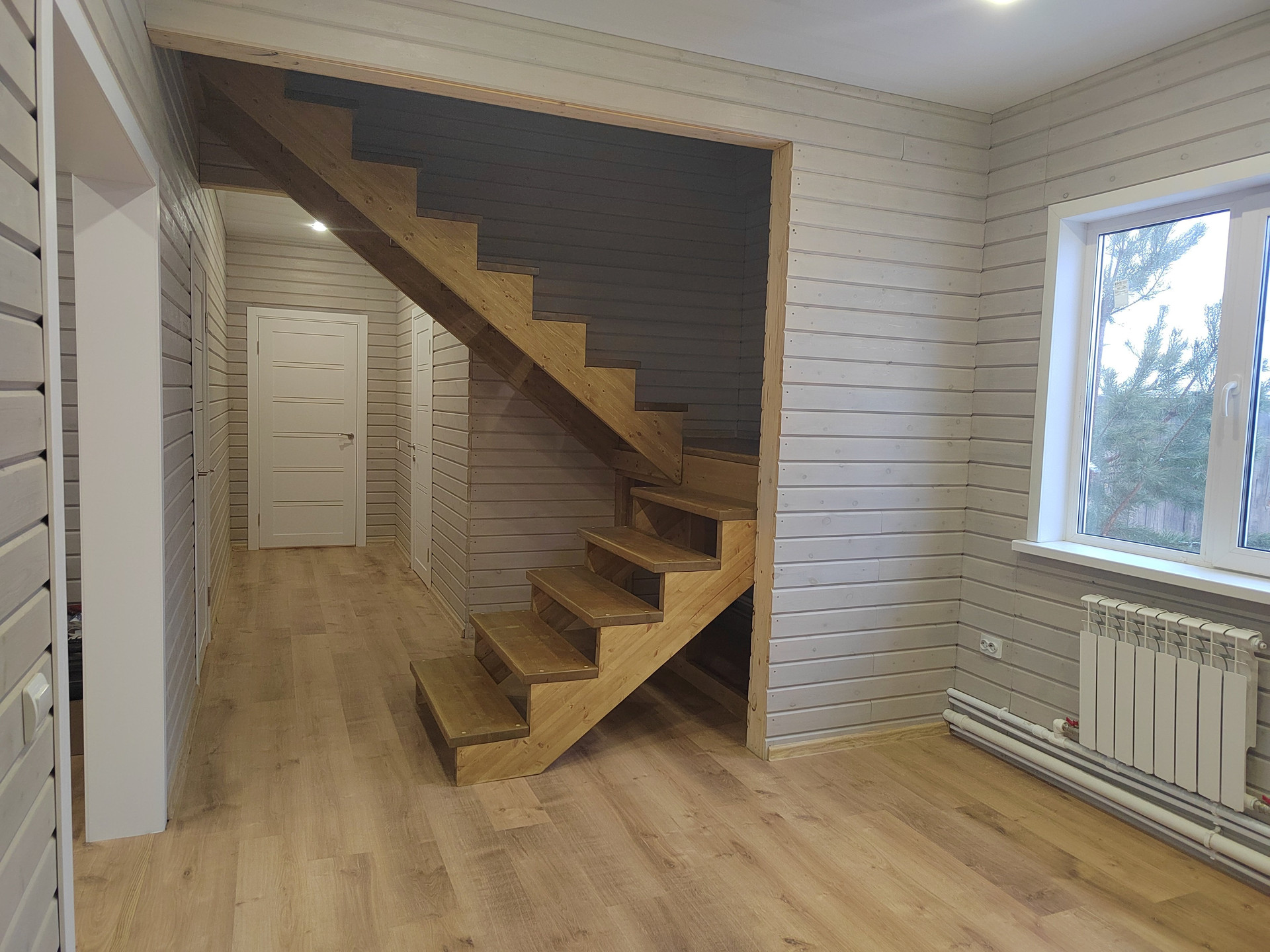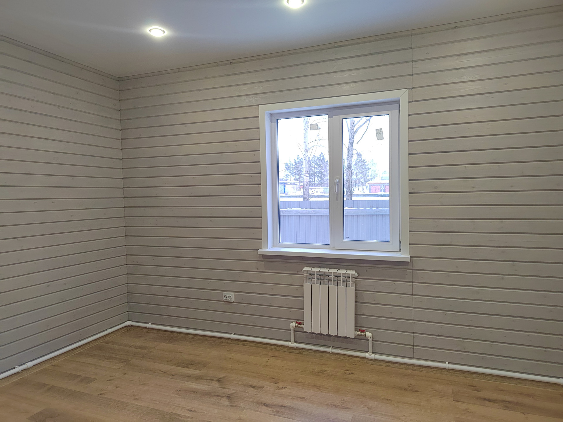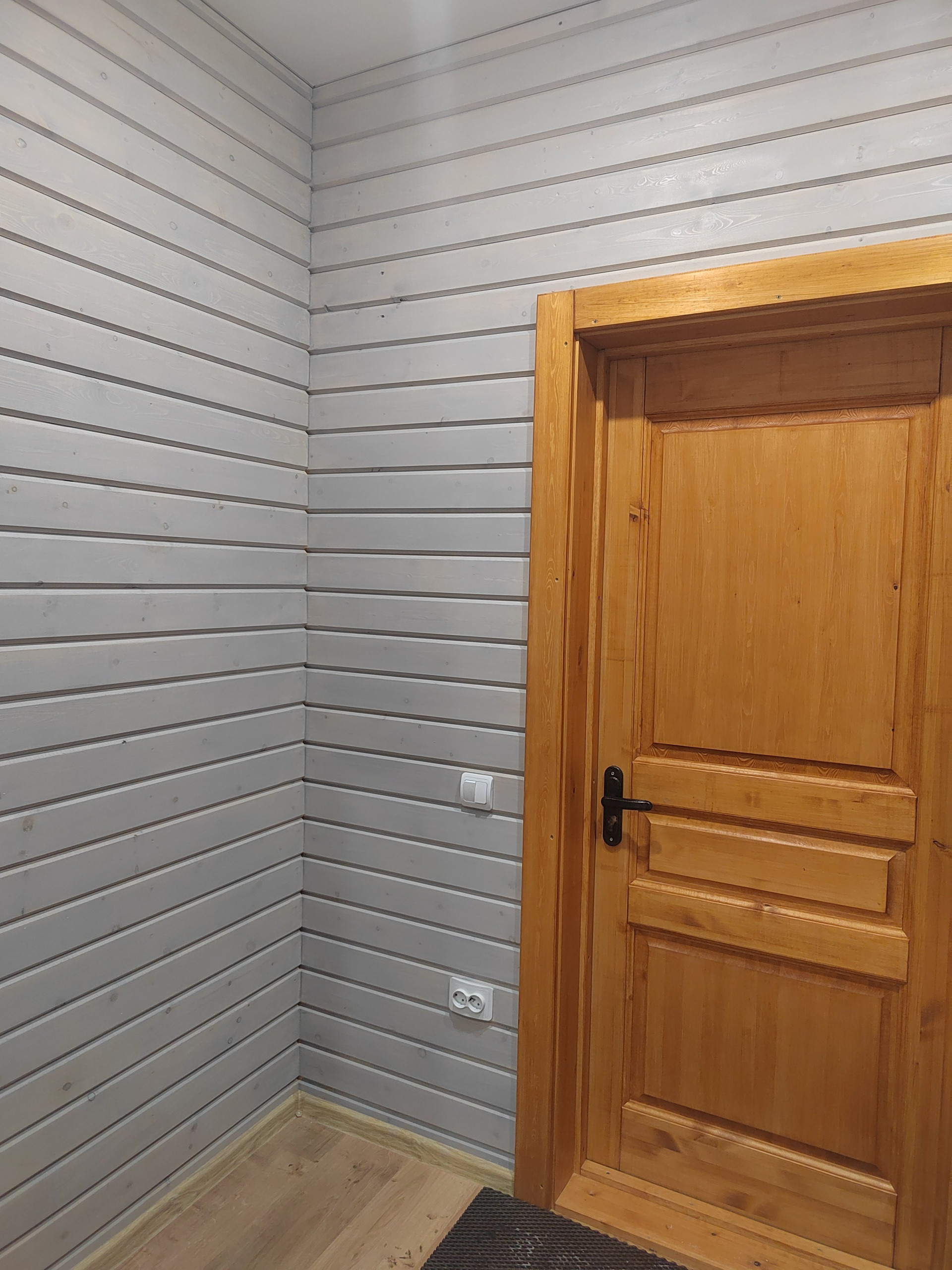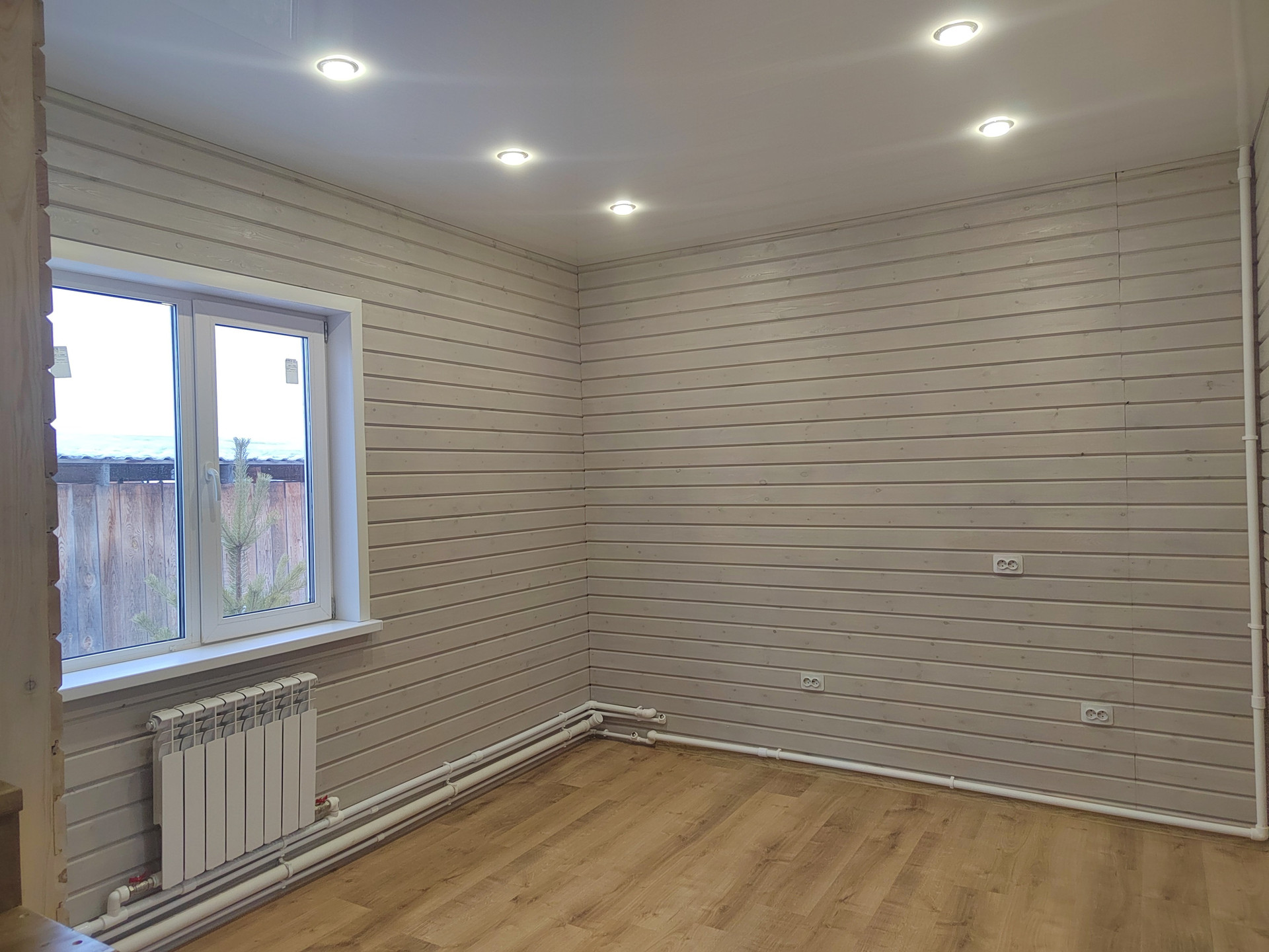 Второй этаж: две спальни. Стены -дерево с имитацией бруса , пол- ламинат. Потолок натяжной с современными точечными светильниками.